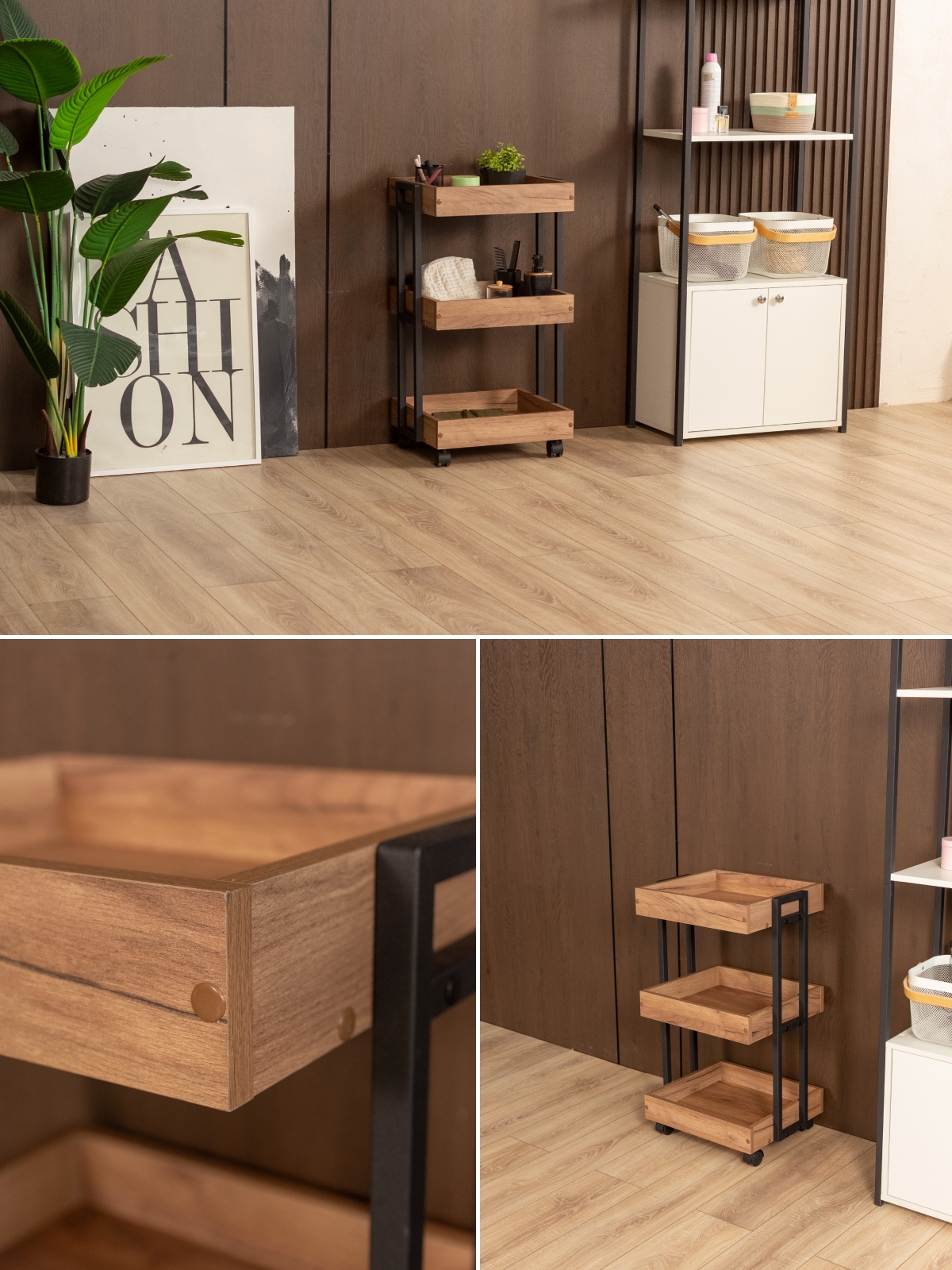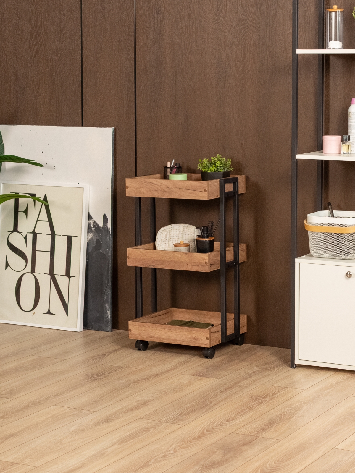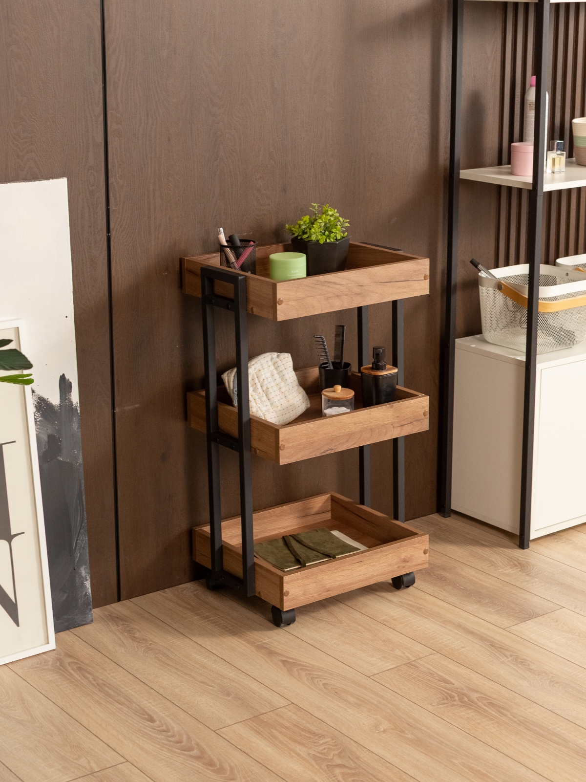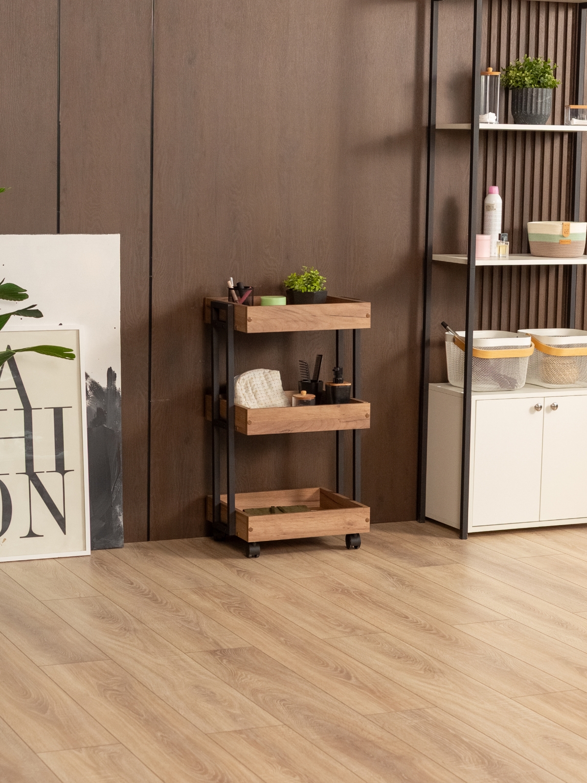 Тележка косметологическая на колесиках «Ангара» — идеальное изделие для экономии пространства. Открытая система хранения — это быстрый доступ ко всему необходимому. Бортики по краям полок защищают предметы от падения. Компактная тележка помогает грамотно распоряжаться свободной площадью и не загромождать комнату лишними вещами. Этот предмет мебели отлично впишется в небольшое помещение. Трехъярусная тележка расширяет полезное пространство квартиры, дома, дачи или офиса и дополняет интерьер. Тележка мобильна: в отличие от громоздких стеллажей ее можно легко передвигать по комнате благодаря ящикам на колесиках. Стопперы на них позволяют зафиксировать стеллаж на одном месте. Полки изготовлены из ЛДСП, благодаря чему они отличаются прочностью и долговечностью. Материал повторяет фактуру и цвет древесины. Полки из ЛДСП неприхотливы в уходе: достаточно периодически смахивать с них пыль сухой мягкой салфеткой или протирать влажной при более выраженных загрязнениях. Органайзер для маникюрного набора  подходит не только для бытовых нужд, но и для профессионального использования в салонах красоты, парикмахерских, маникюрных кабинетах. Она отлично впишется в современные интерьеры в стилях лофт и минимализм.