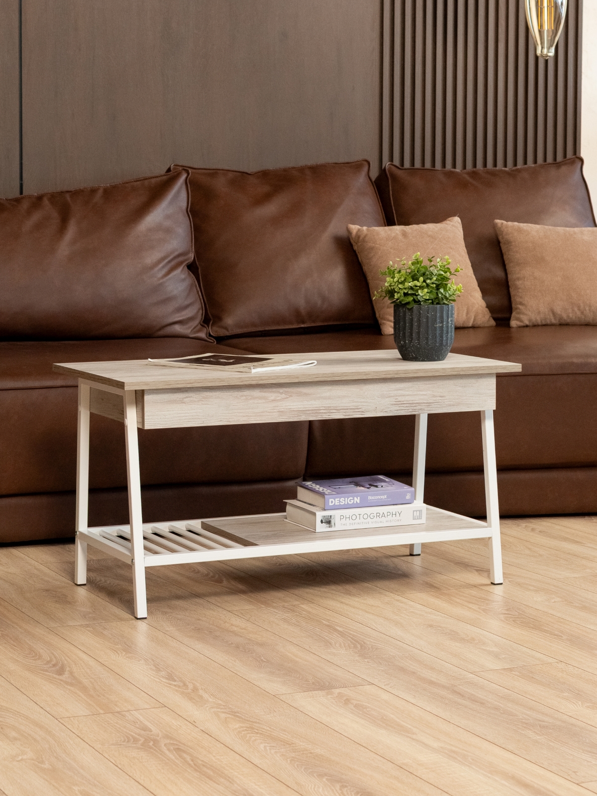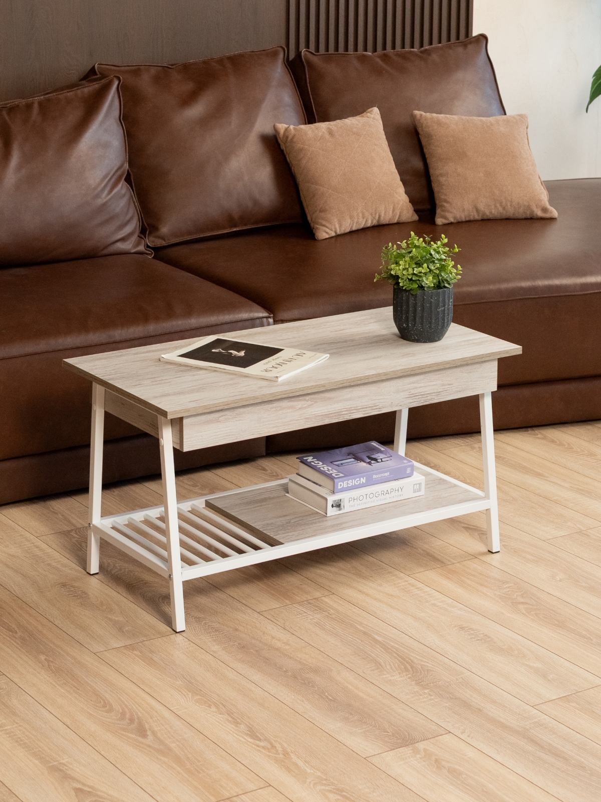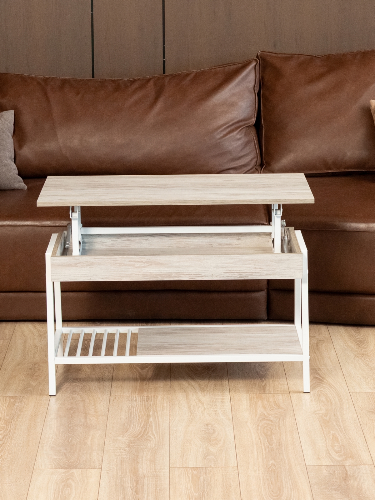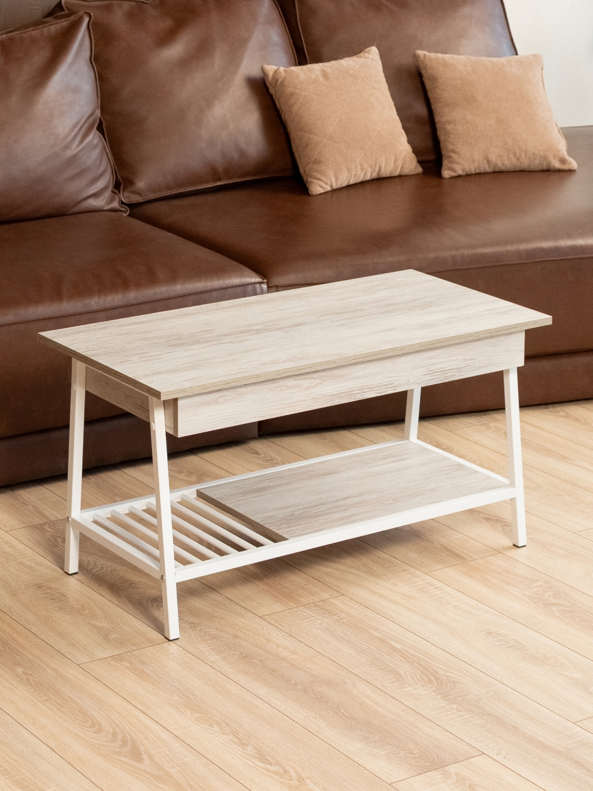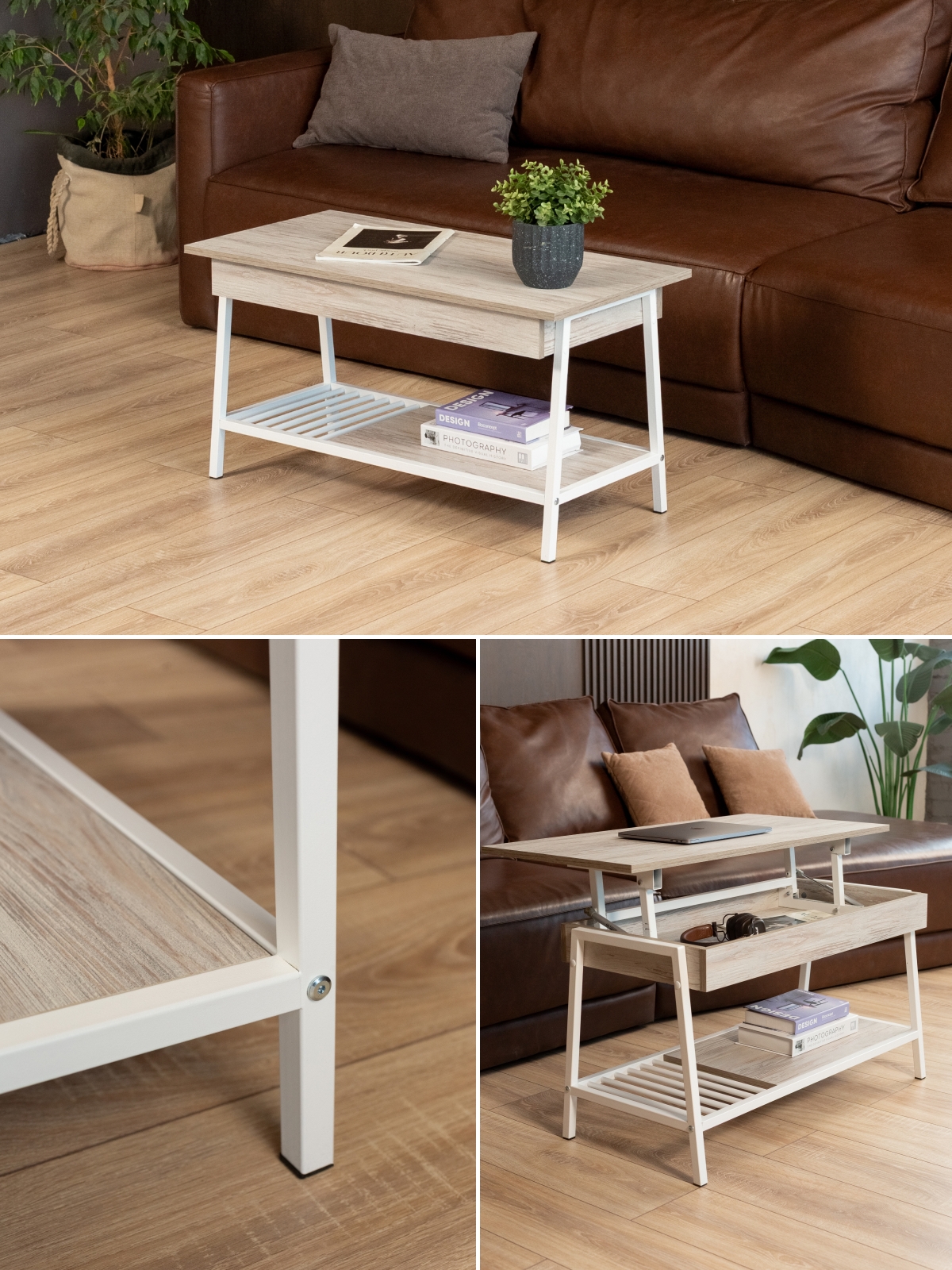 Под столешницей предусмотрена небольшой ящик для хранения, что позволяет удобно размещать различные мелочи, книги или аксессуары. Это практичное решение для тех, кто ценит порядок и функциональность. Дополнительная полочка для журналов делает использование столика еще более удобным — теперь любимые издания и газеты всегда будут под рукой. Такой раздвижной кофейный столик легко трансформируется в рабочее место для ноутбука, обеспечивая комфорт во время работы или учебы.
