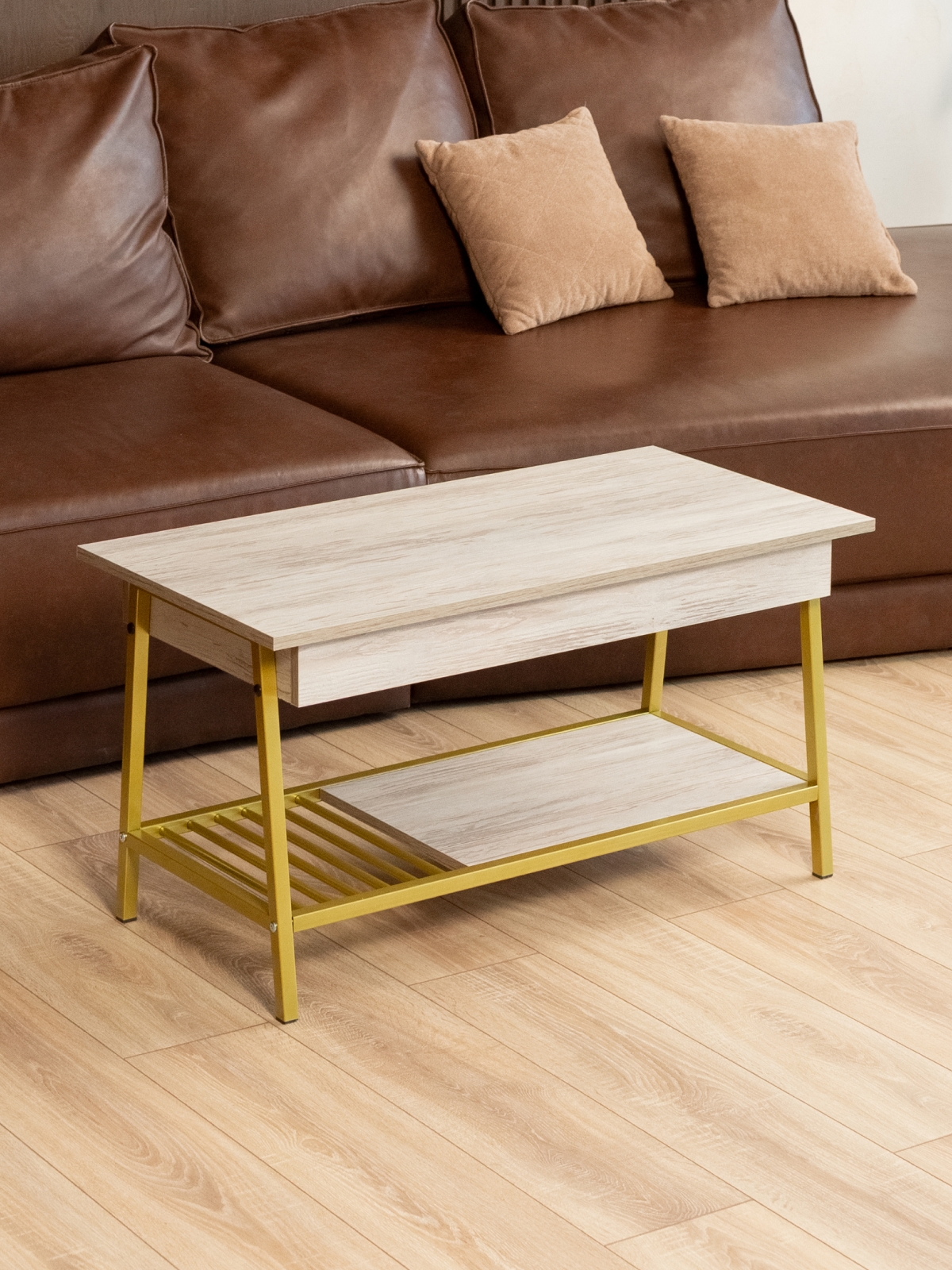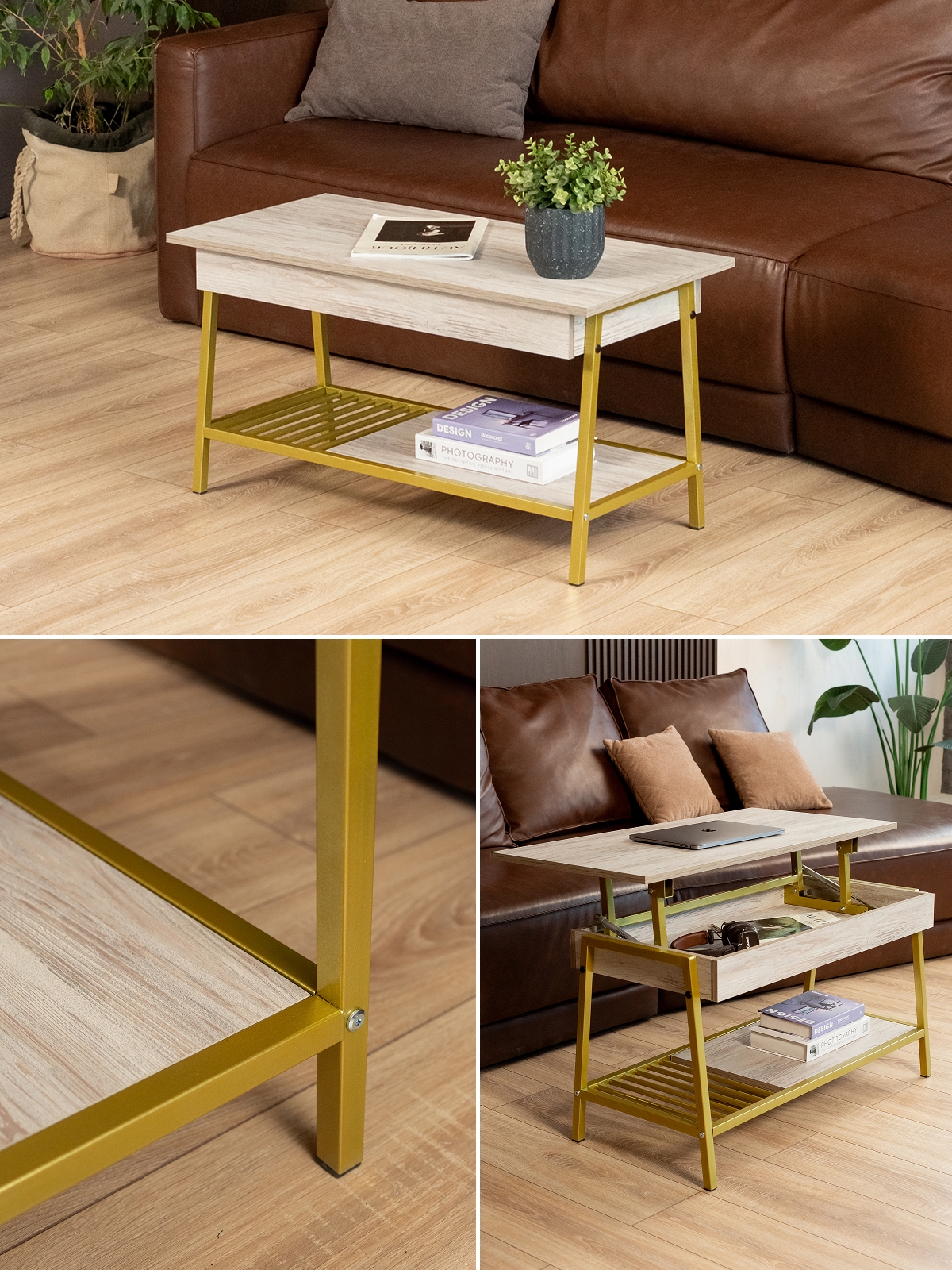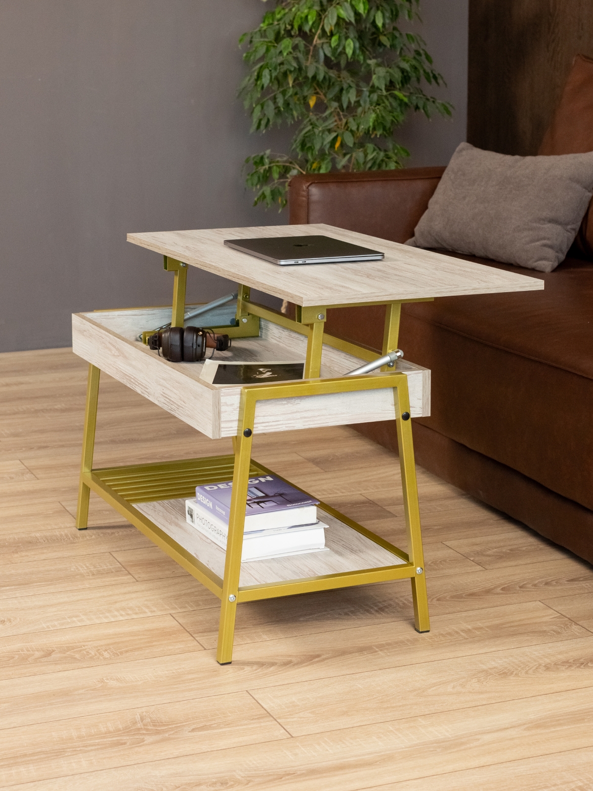 ЛДСП в качестве материала столешницы обеспечивает долговечность и приятную тактильную поверхность, а металлический каркас делает столик-трансформер особенно устойчивым. Журнальные столы такого типа — это не только функциональный, но и стильный предмет мебели, который подчеркивает индивидуальность и вкус владельца. Золотой акцент конструкции идеально подходит для создания роскошной атмосферы в доме, бутиках или премиальных салонах.