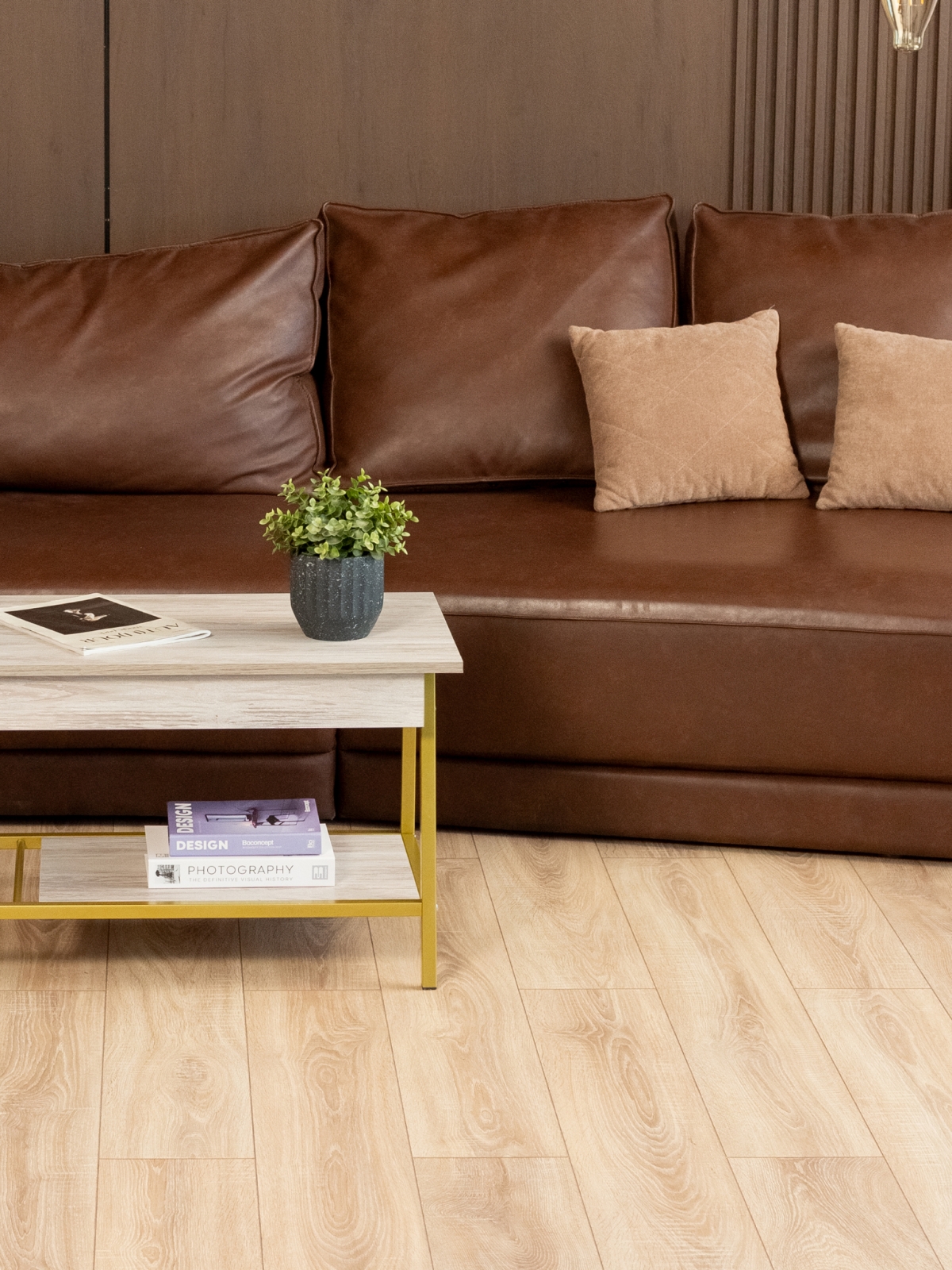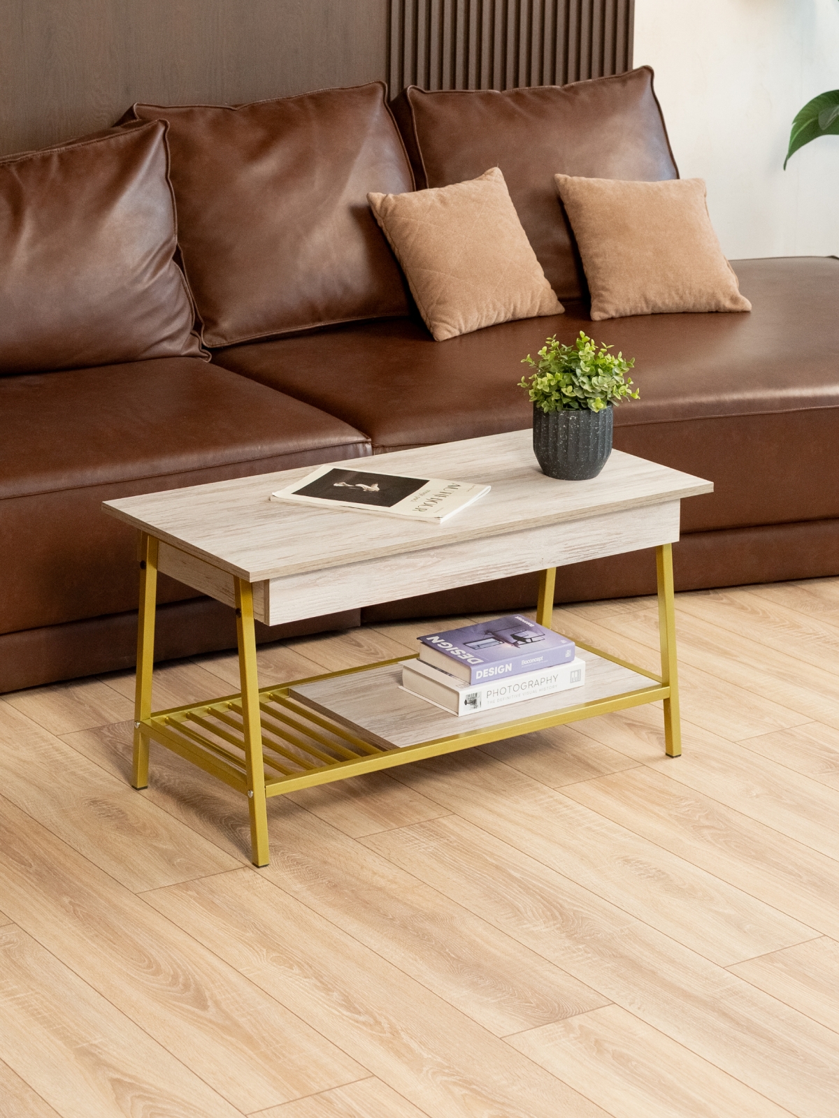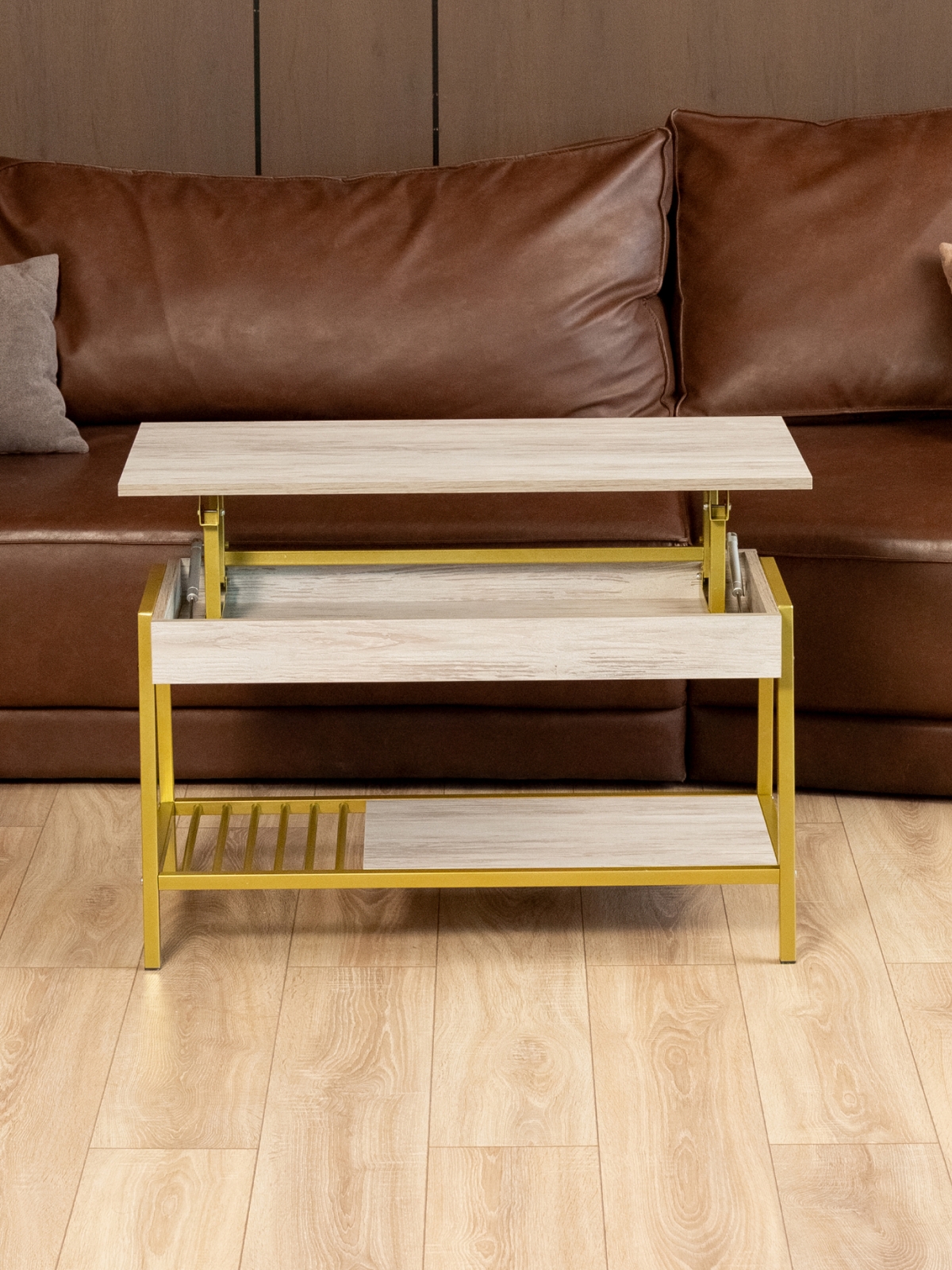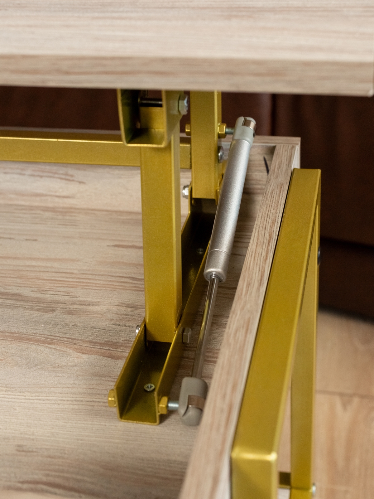 ЛДСП в качестве материала столешницы обеспечивает долговечность и приятную тактильную поверхность, а металлический каркас делает столик-трансформер особенно устойчивым. Журнальные столы такого типа — это не только функциональный, но и стильный предмет мебели, который подчеркивает индивидуальность и вкус владельца. Золотой акцент конструкции идеально подходит для создания роскошной атмосферы в доме, бутиках или премиальных салонах.