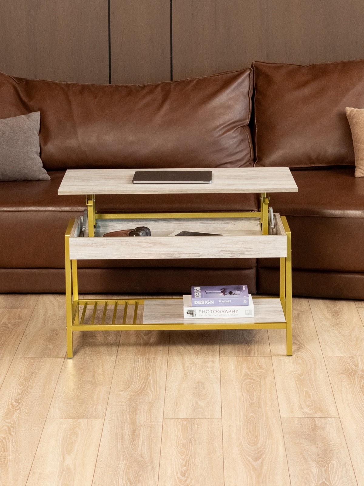 Столик трансформируется из журнального в рабочий, а также легко становится консолью или прикроватным вариантом. Такой универсальный подход позволяет использовать его в разных зонах квартиры или дома: в гостиной для кофе и журналов, у кровати или как рабочий столик для ноутбука. Подъемный механизм обеспечивает плавное и удобное изменение высоты столешницы, позволяя быстро адаптировать мебель под любые задачи и потребности владельца.
