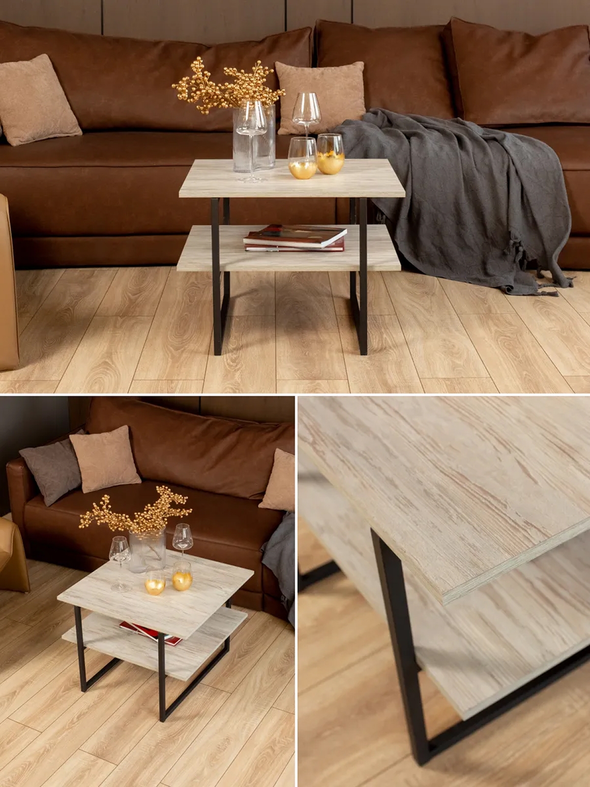 Журнальный стол в стиле лофт «Киву» привнесет комфорт и утонченность в ваш интерьер. Стол со стильным и лаконичным дизайном будет уместен в гостиной, кабинете, прихожей, спальне или любом другом уголке вашей квартиры. Изделие также можно разместить в фойе отеля или холле офиса. Стол не создает ощущения перегруженности и оставляет достаточно свободного пространства. Строгая квадратная форма дополнит рабочую и домашнюю обстановку, придаст симметричность. Этот яркий предмет интерьера имеет не только эстетическую, но и практическую ценность. На столике можно расположить вещи, которые должны быть в пределах вашей видимости: пульт от телевизора, телефон, лекарства, книги и журналы. Журнальный столик можно использовать для разных целей: чаепития, приема пищи, работы с документами и ноутбуком, занятий творчеством. Двухуровневая конструкция со столешницами из качественного ЛДСП подойдет для хранения сувениров и предметов декора. Журнальный стол не требует сложного ухода: достаточно регулярно протирать столешницы мягкой тканью. Более выраженные загрязнения можно убирать влажной салфеткой.