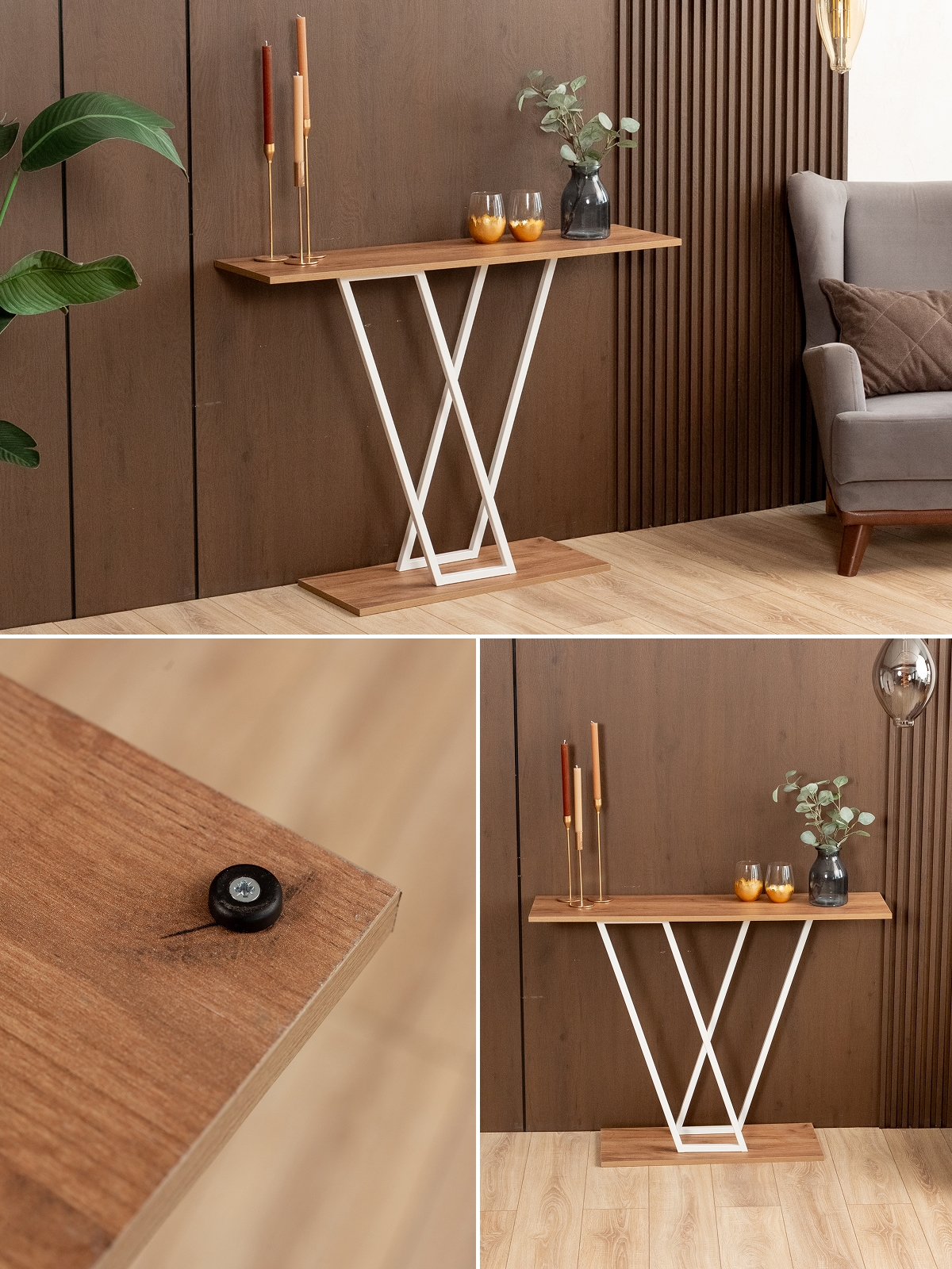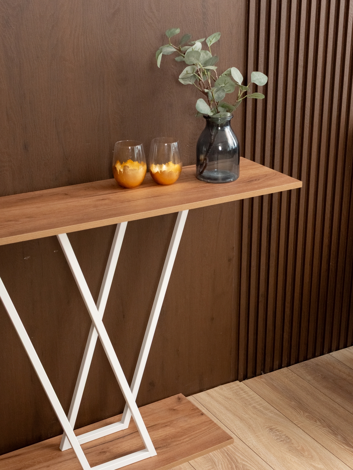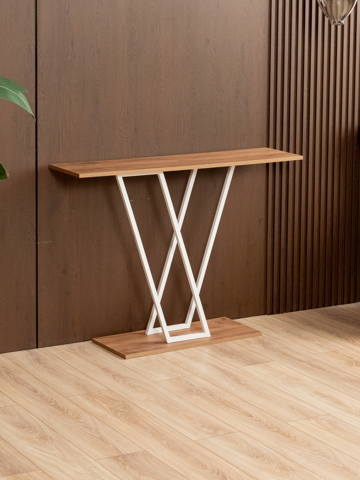 Дизайнерская подставка универсальна: небольшой стол можно поставить в прихожую или коридор для хранения ключей, сумок, перчаток и других аксессуаров. В гостиной интерьерный столик подойдет для дизайнерского оформления стены с телевизором. Конструкция устойчива — металлический каркас с лаконичными пересекающимися линиями обеспечивает надежность и долговечность. Верхняя часть консоли служит подставкой для декора: статуэток, фоторамок, свечей или вазы с цветами. Белый цвет каркаса гармонирует с бежевыми и пастельными тонами, делая столик идеальным выбором для светлых и просторных интерьеров, в том числе в скандинавском стиле.