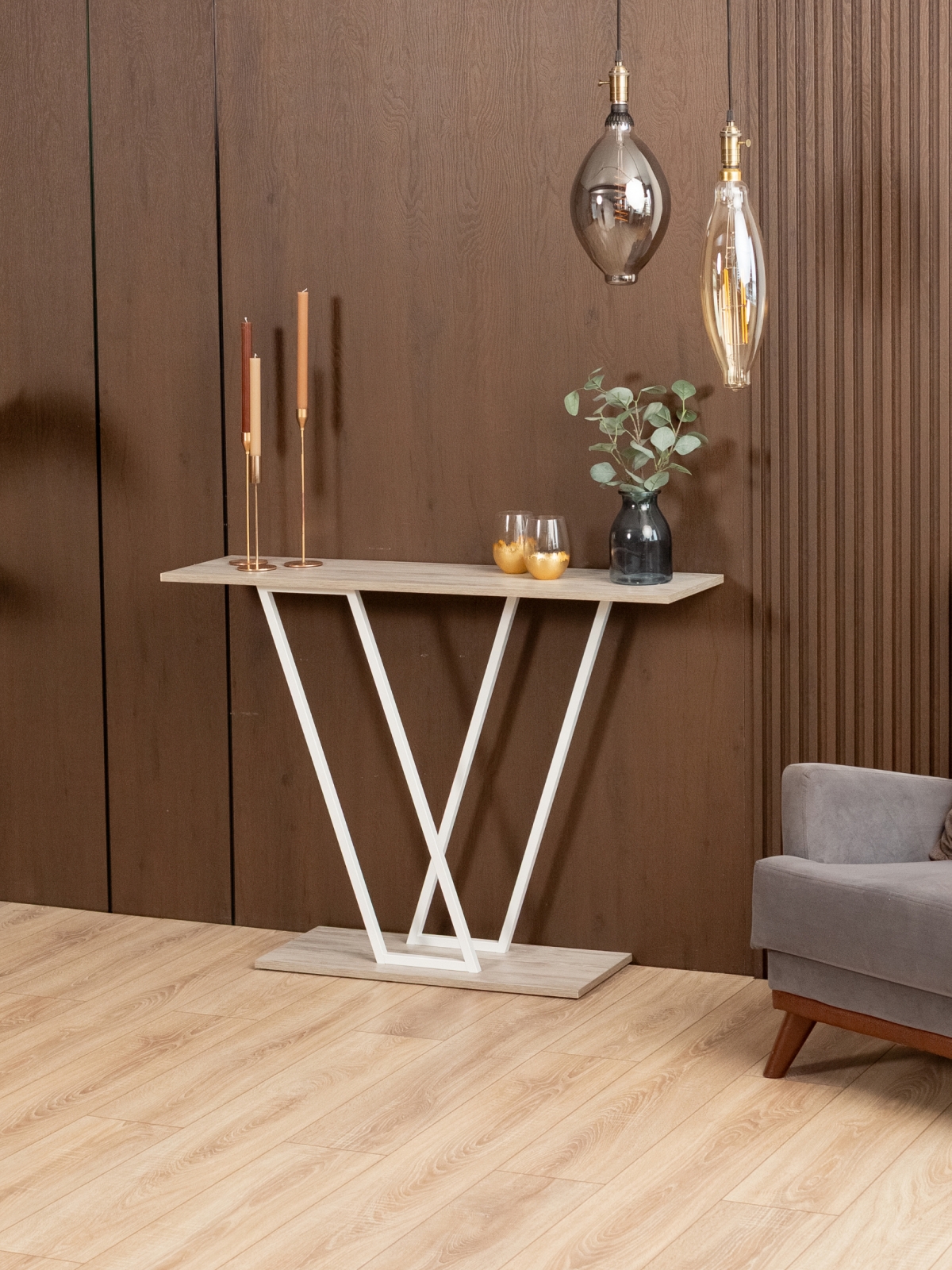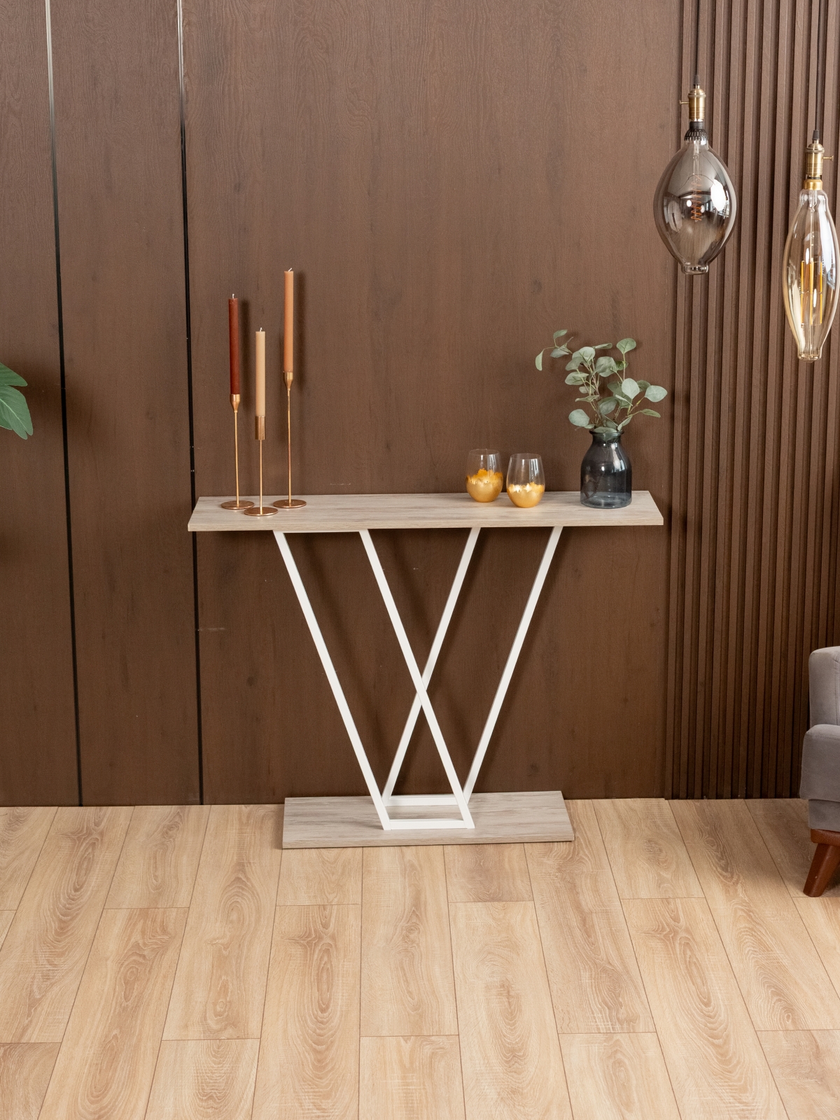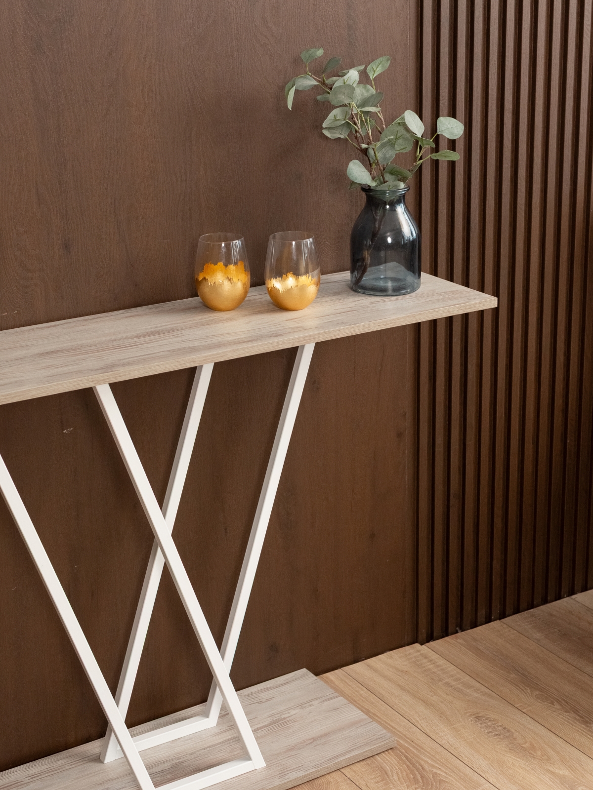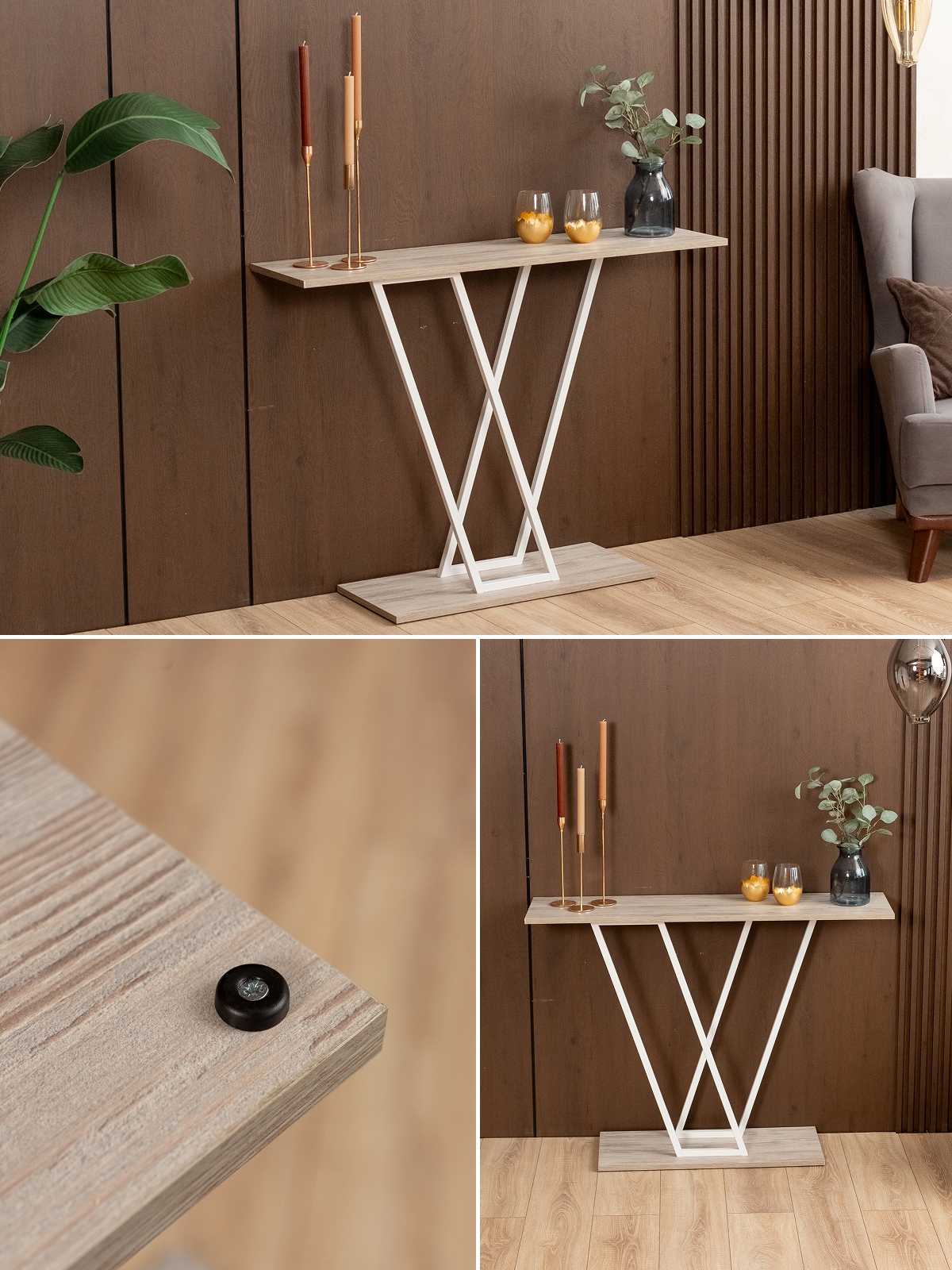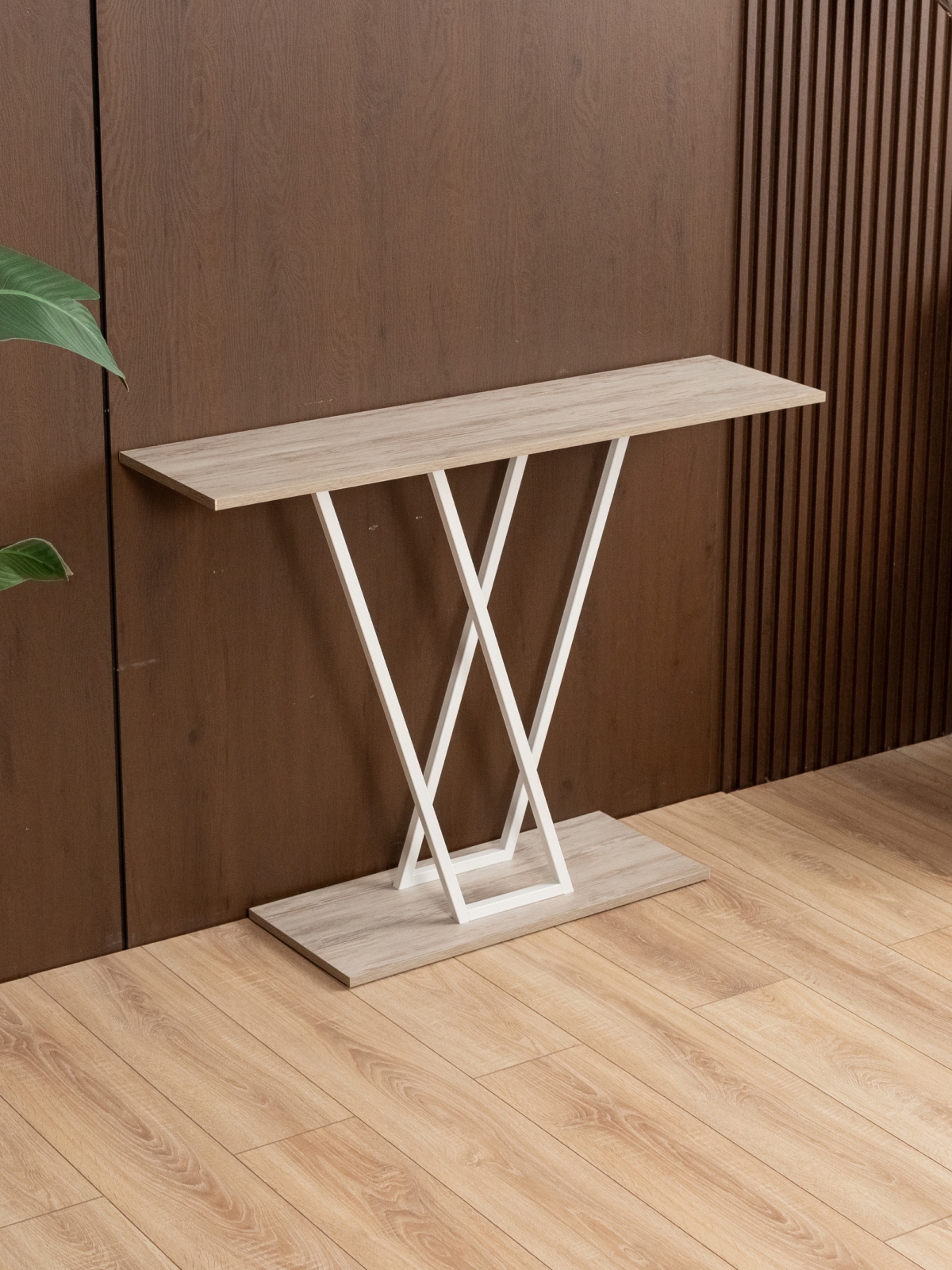 Дизайнерская подставка универсальна: небольшой стол можно поставить в прихожую или коридор для хранения ключей, сумок, перчаток и других аксессуаров. В гостиной интерьерный столик подойдет для дизайнерского оформления стены с телевизором. Конструкция устойчива — металлический каркас с лаконичными пересекающимися линиями обеспечивает надежность и долговечность. Верхняя часть консоли служит подставкой для декора: статуэток, фоторамок, свечей или вазы с цветами. Белый цвет каркаса гармонирует с бежевыми и пастельными тонами, делая столик идеальным выбором для светлых и просторных интерьеров, в том числе в скандинавском стиле.
