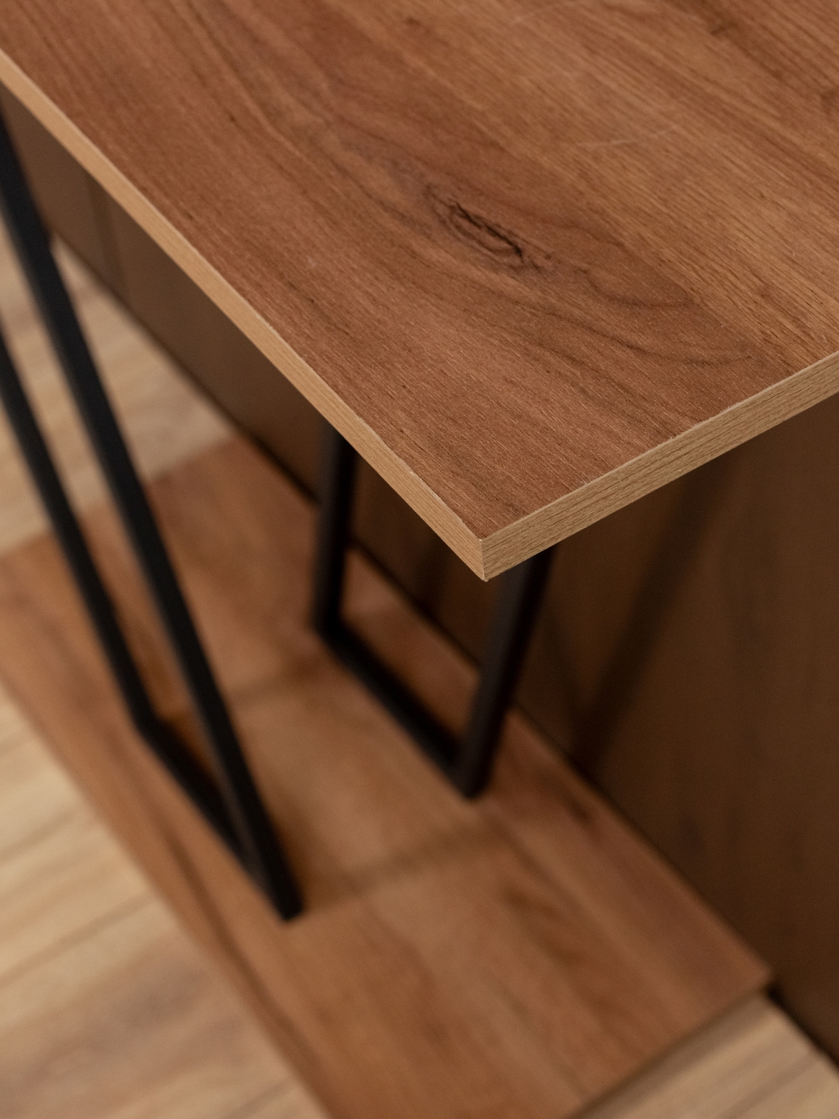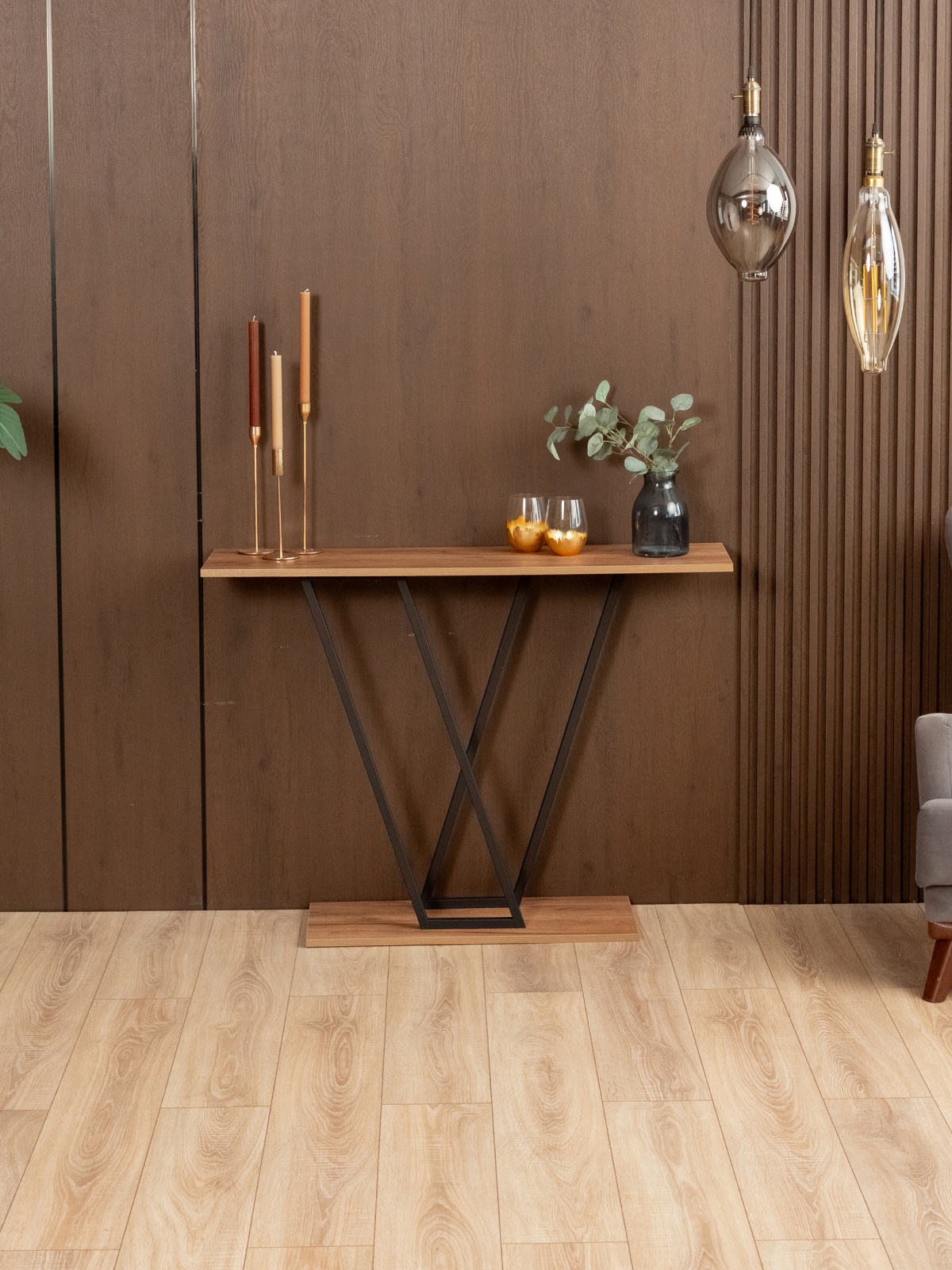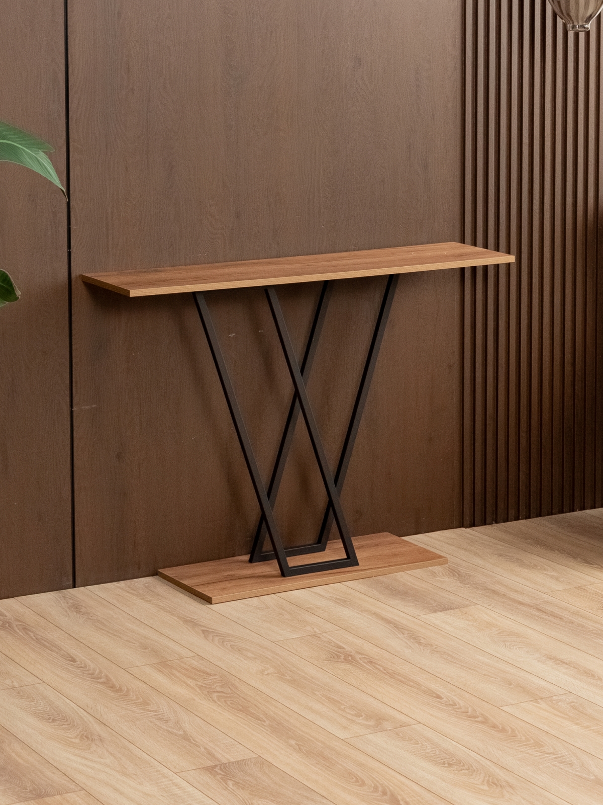 Декоративный стол консольного типа гармонирует с кирпичными стенами и темными акцентами в интерьере, создавая уютную атмосферу. Черный металлический каркас отвечает за строгость линий, а также обеспечивает надежность конструкции. Эта узкая консоль — идеальное решение для тех, кто ищет баланс между функциональностью и лофтовым дизайном.