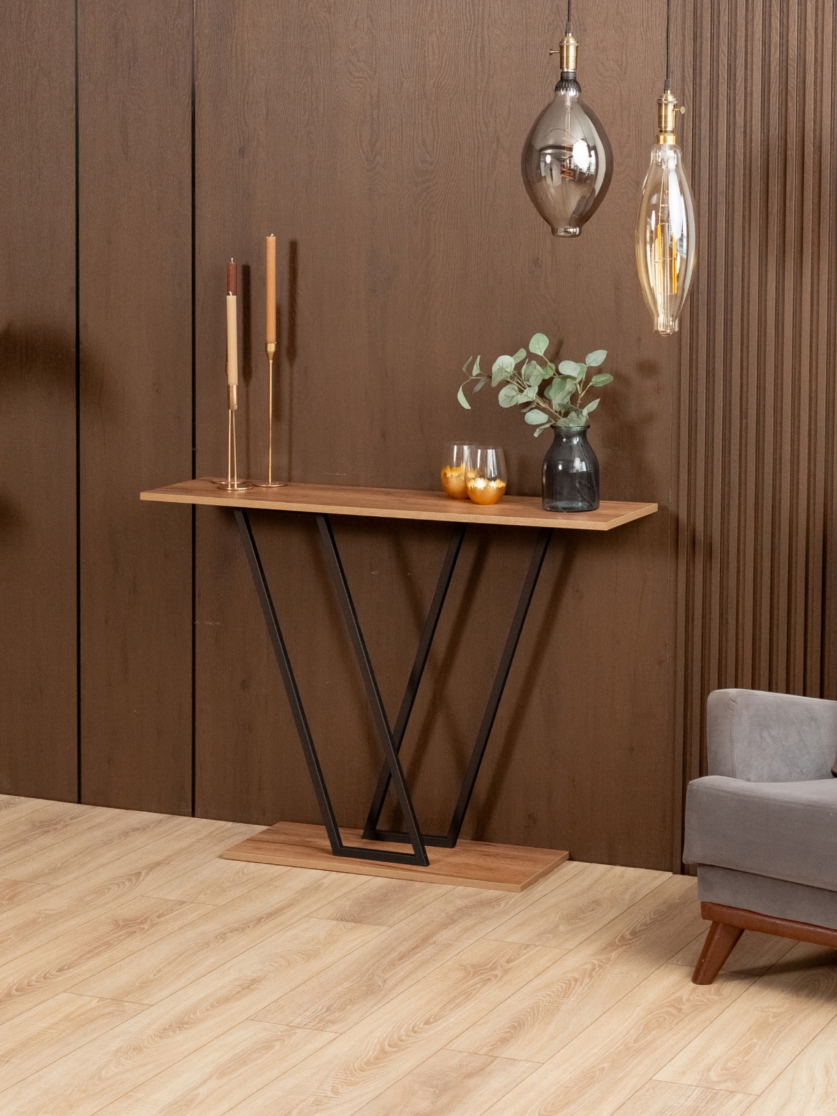 Дизайнерский консольный столик — идеальное интерьерное решение для современных квартир, офисов и домов. Консоль отличается качеством исполнения и лаконичным внешним видом, что подчеркивает минималистичный подход в стиле лофт. Черный каркас изготовлен из металла, обладает прочной конструкцией, устойчивой к нагрузкам, и служит выразительным акцентом для интерьера с элементами индустриального дизайна. Главная особенность модели — уникальная геометрия каркаса. Вместо стандартных ножек стол оснащен оригинальными V-образными опорами из черного металла, которые сходятся в основании, создавая эффект динамики и визуальной легкости. Несмотря на изящную форму, узкая консоль обладает высокой устойчивостью благодаря металлическому профилю и дополнительному основанию, которое дублирует форму столешницы.