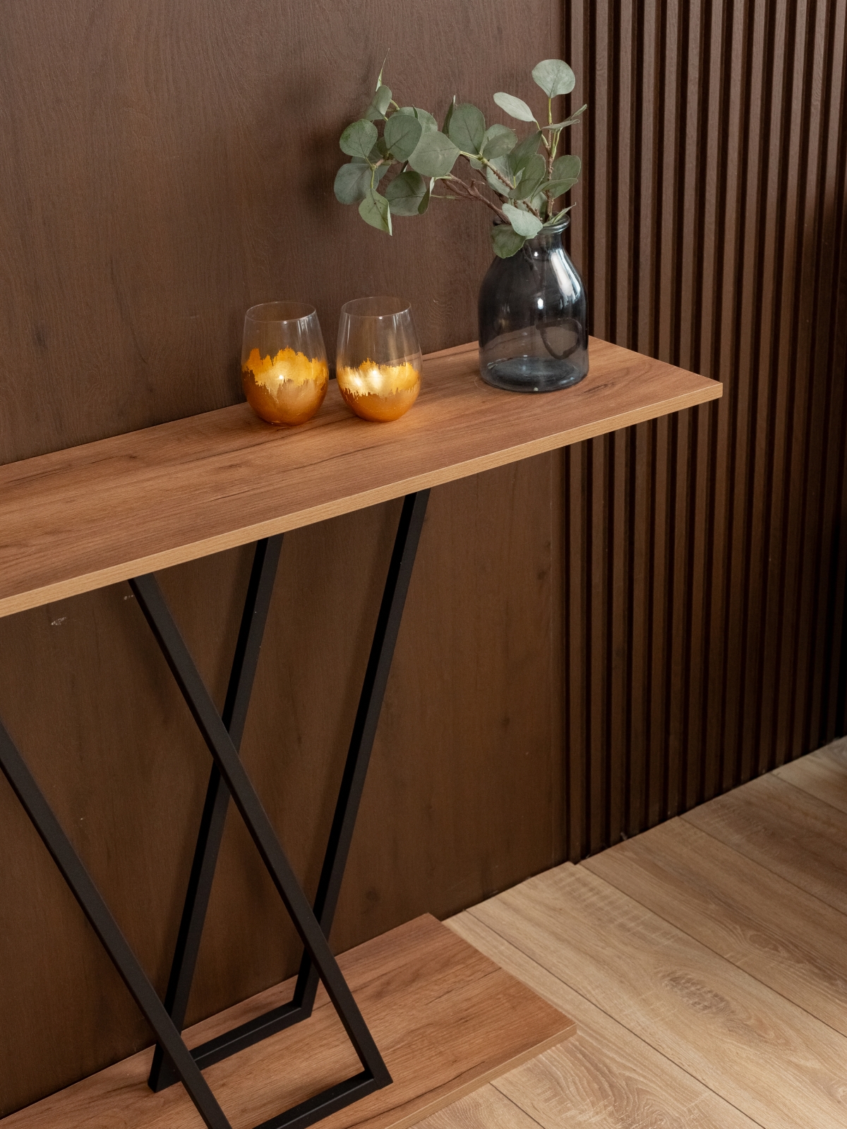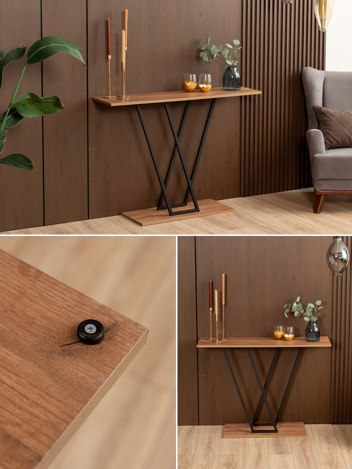 Интерьерный столик станет отличным выбором для тех, кто ценит необычные декоративные решения. Такая мебель легко впишется в гостиную, спальню или балкон — она не занимает много места благодаря своей узкой прямоугольной форме, но при этом остается функциональной и стильной. Особенность конструкции позволяет использовать подставку для хранения ключей, сумок, перчаток и других аксессуаров, что особенно актуально для прихожей. Этот узкий стол отлично подходит для оформления ТВ-зоны: его можно поставить к стене, на которой висит телевизор, в качестве полки для декора, книг или фоторамок. В спальне столик легко превратить в зону визажиста, поставив его под зеркалом для хранения косметики и аксессуаров. В гостиной консоль прекрасно смотрится в качестве подставки для растений, статуэток или стильных свечей, подчеркивая современный характер пространства.