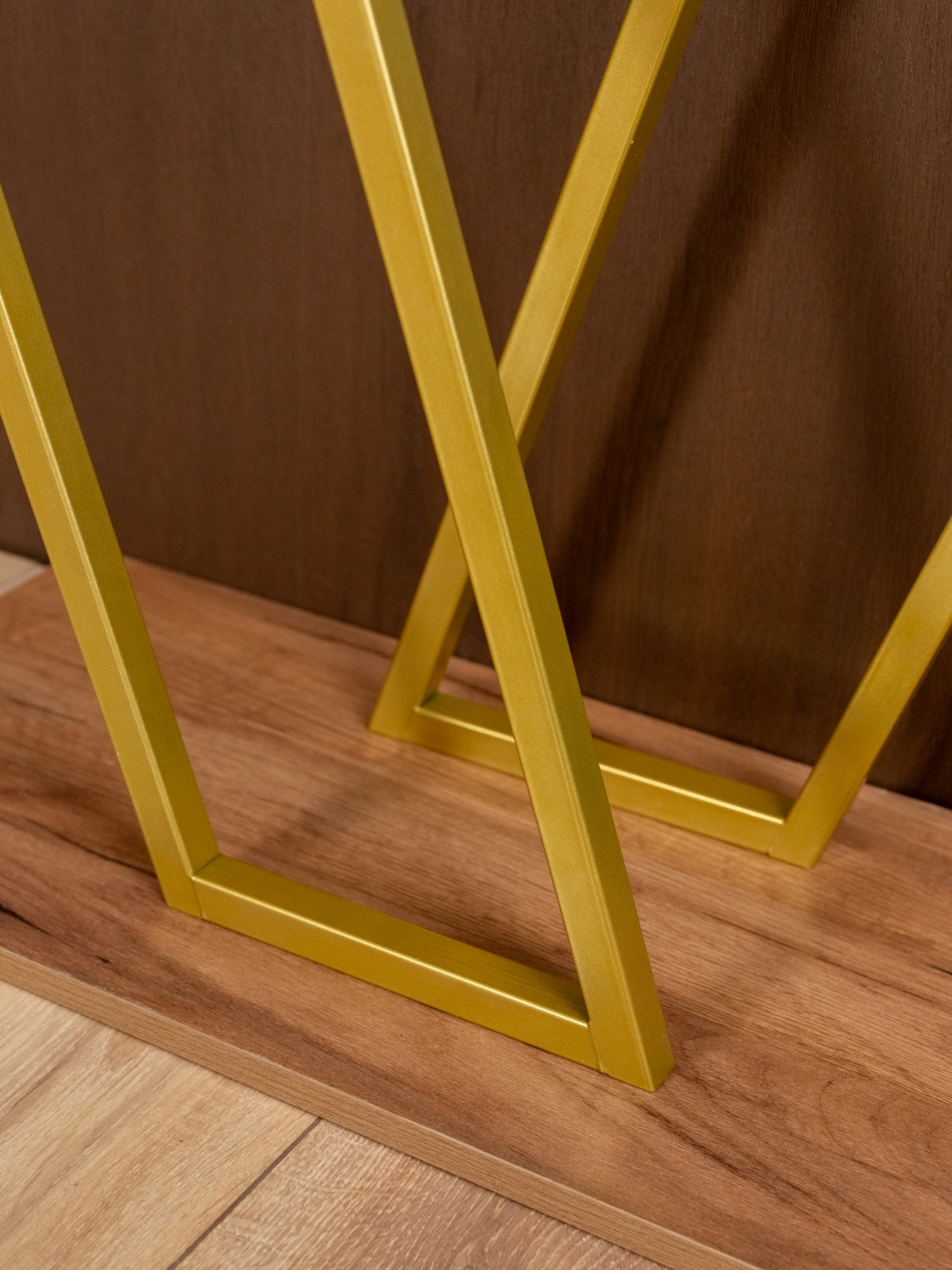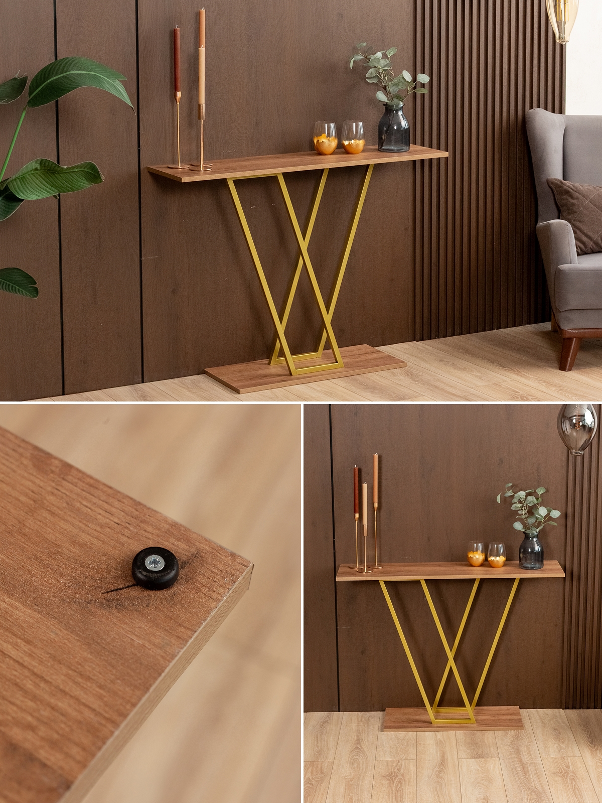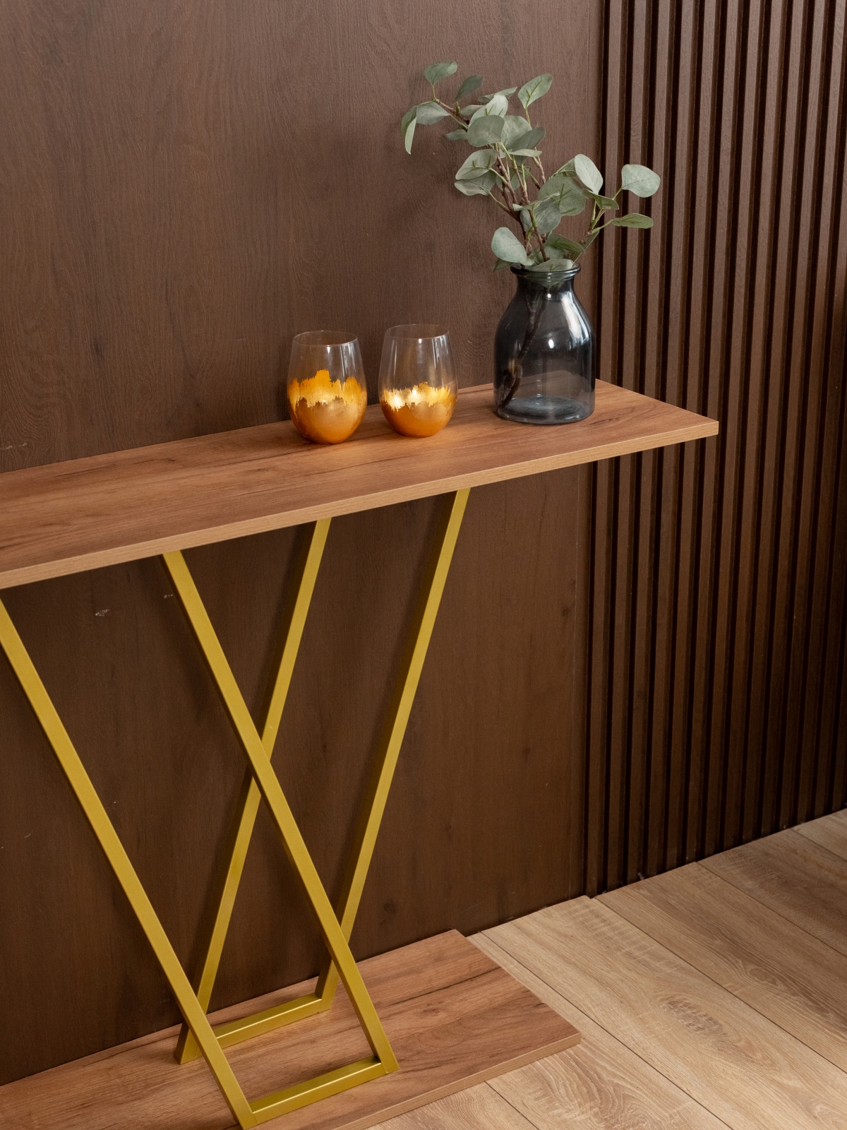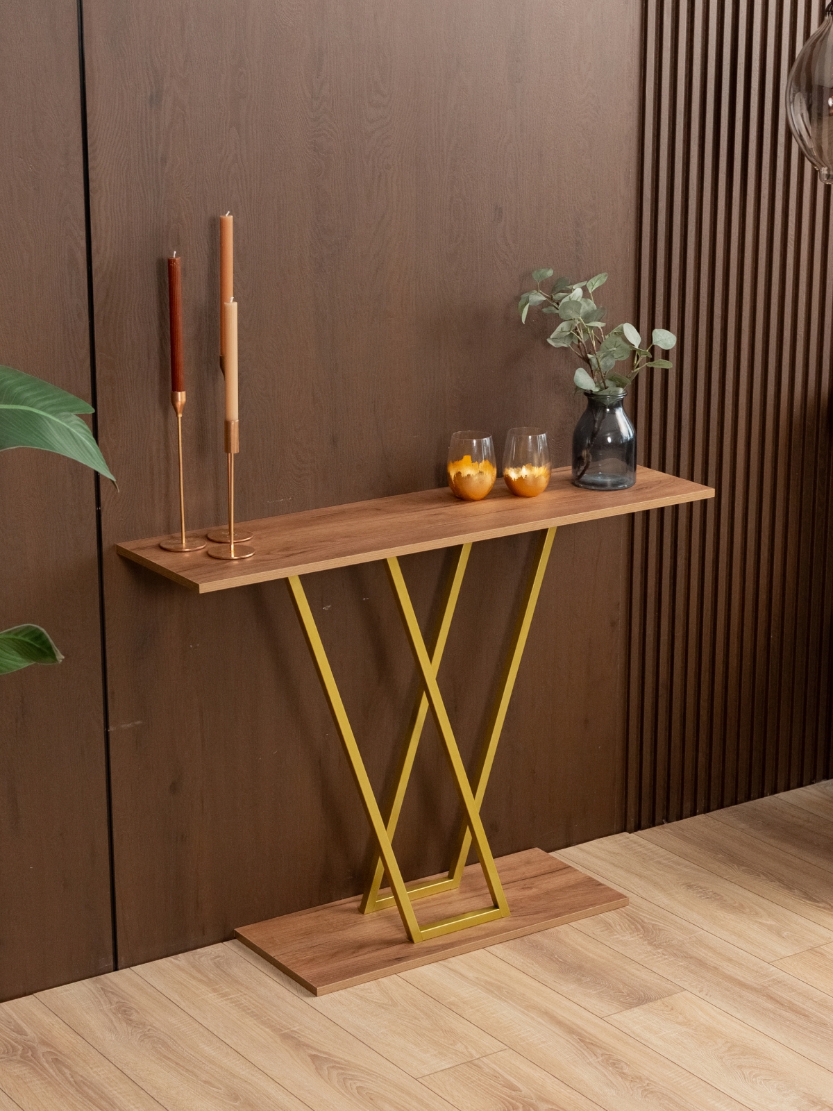 Золотой акцент металлического каркаса не только украшает, но и вносит ощущение тепла и уюта. Столик подойдет для декора, размещения растений, свечей, ваз, фоторамок и других элементов, которые делают пространство более живым и привлекательным. Конструкция без лишних деталей и украшений позволяет использовать интерьерную консоль в самых разных стилях оформления, от минимализма до гламурного лофта.