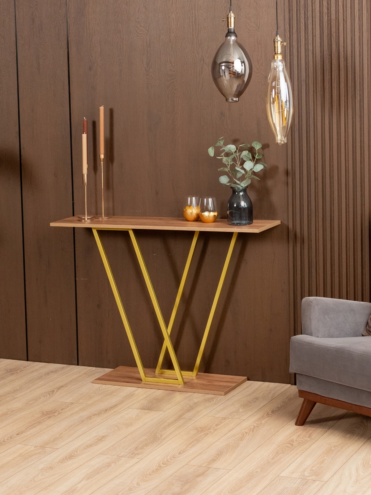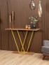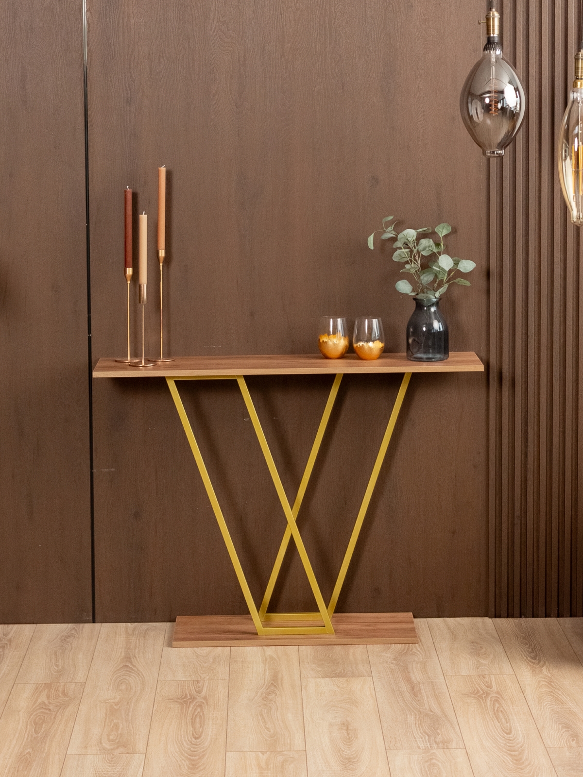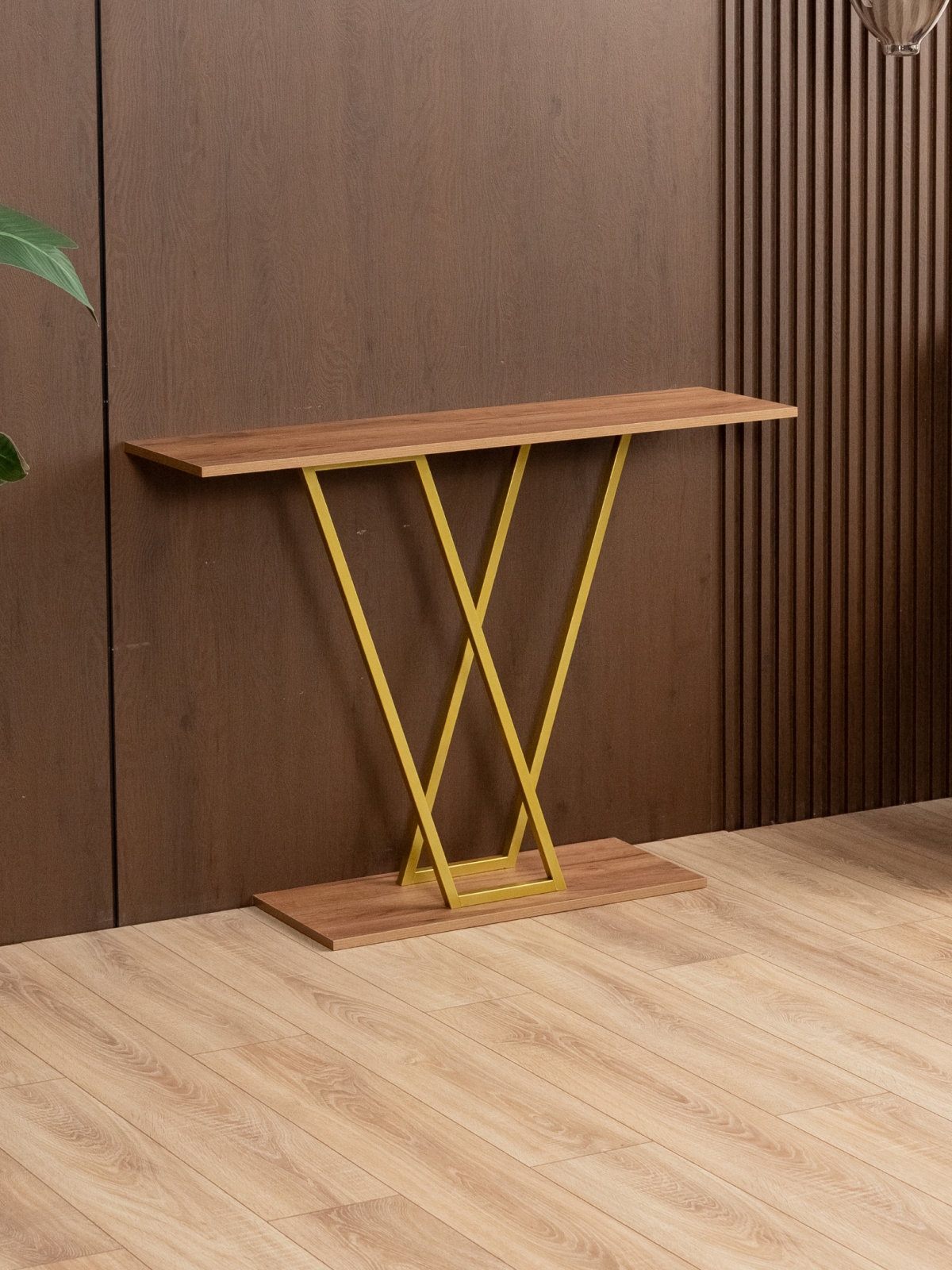 Золотой акцент металлического каркаса не только украшает, но и вносит ощущение тепла и уюта. Столик подойдет для декора, размещения растений, свечей, ваз, фоторамок и других элементов, которые делают пространство более живым и привлекательным. Конструкция без лишних деталей и украшений позволяет использовать интерьерную консоль в самых разных стилях оформления, от минимализма до гламурного лофта.