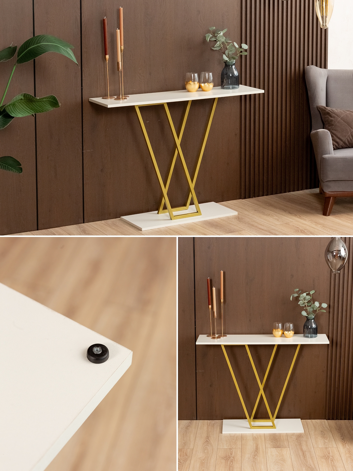 Золотой акцент металлического каркаса не только украшает, но и вносит ощущение тепла и уюта. Столик подойдет для декора, размещения растений, свечей, ваз, фоторамок и других элементов, которые делают пространство более живым и привлекательным. Конструкция без лишних деталей и украшений позволяет использовать интерьерную консоль в самых разных стилях оформления, от минимализма до гламурного лофта.