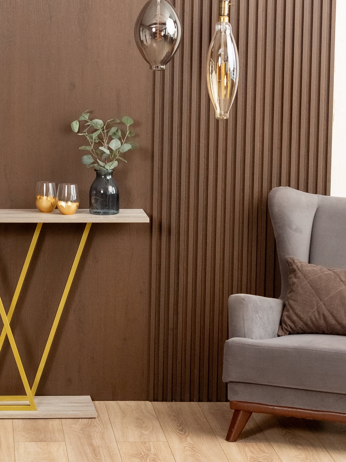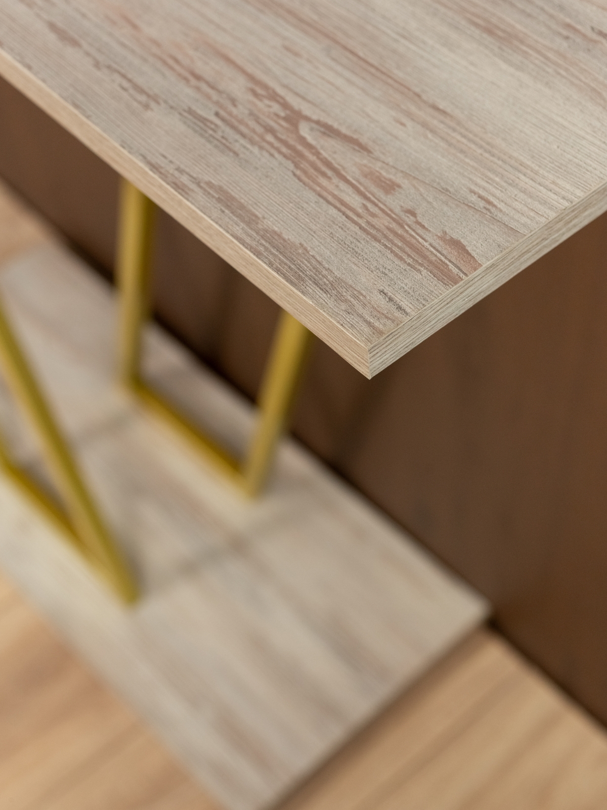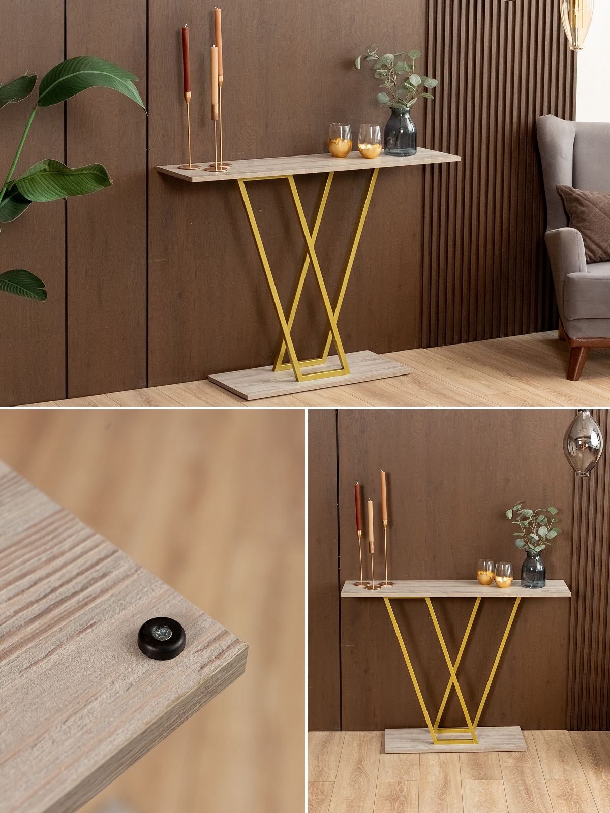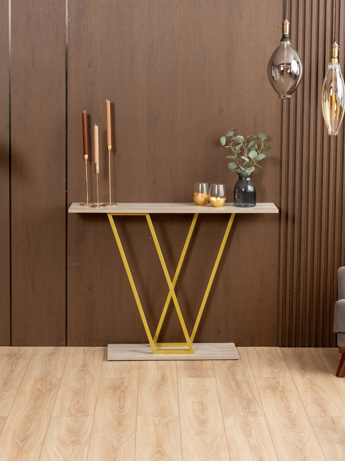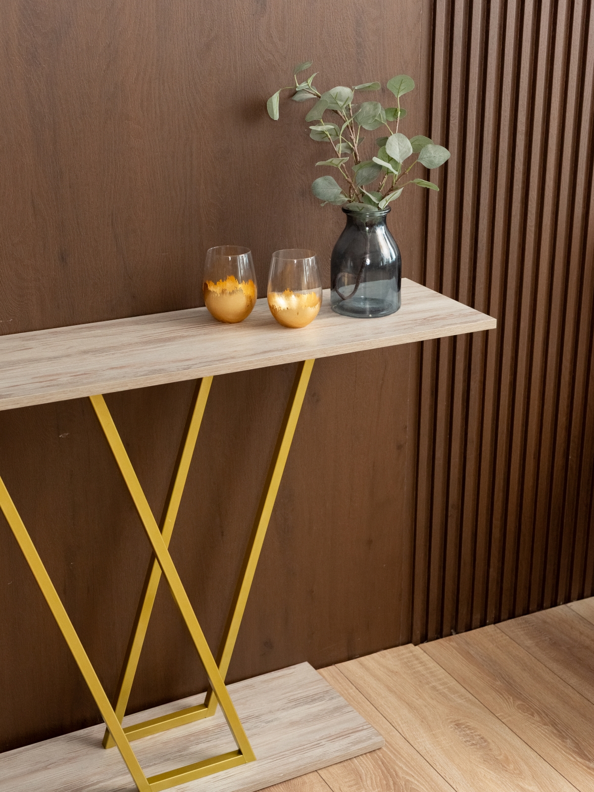 Золотой акцент металлического каркаса не только украшает, но и вносит ощущение тепла и уюта. Столик подойдет для декора, размещения растений, свечей, ваз, фоторамок и других элементов, которые делают пространство более живым и привлекательным. Конструкция без лишних деталей и украшений позволяет использовать интерьерную консоль в самых разных стилях оформления, от минимализма до гламурного лофта.