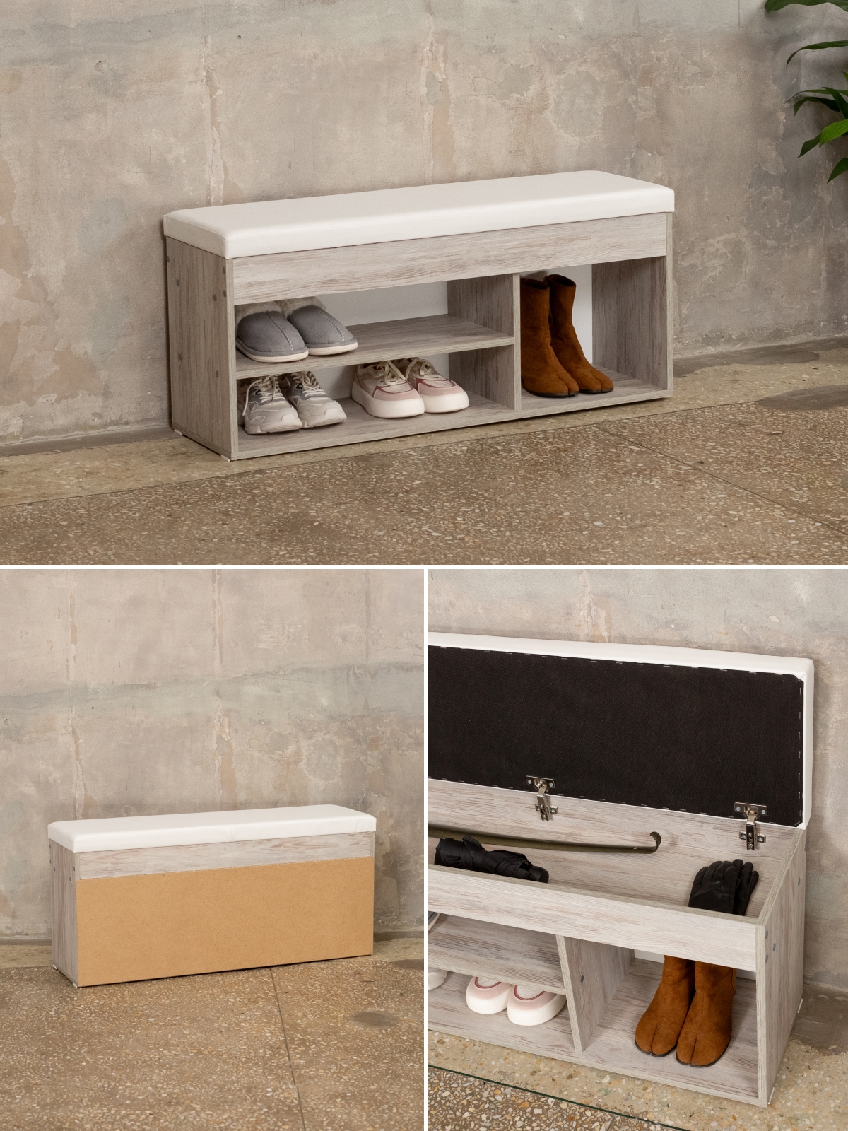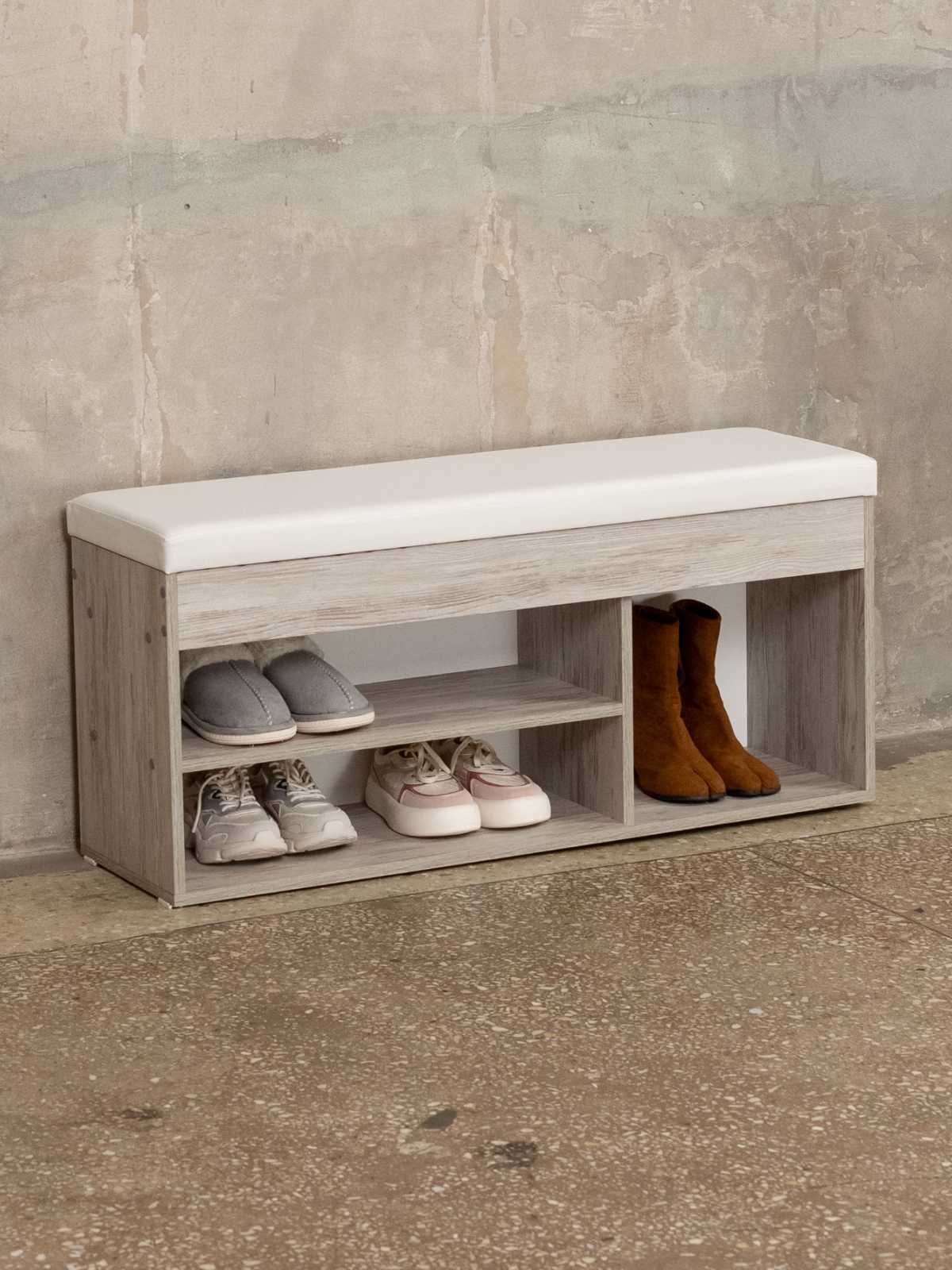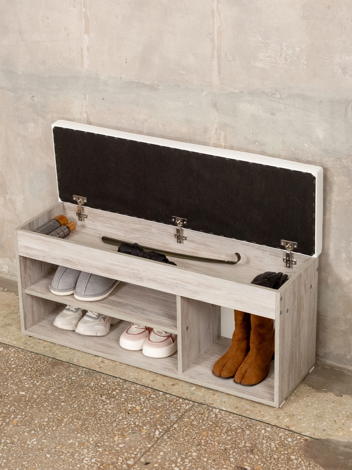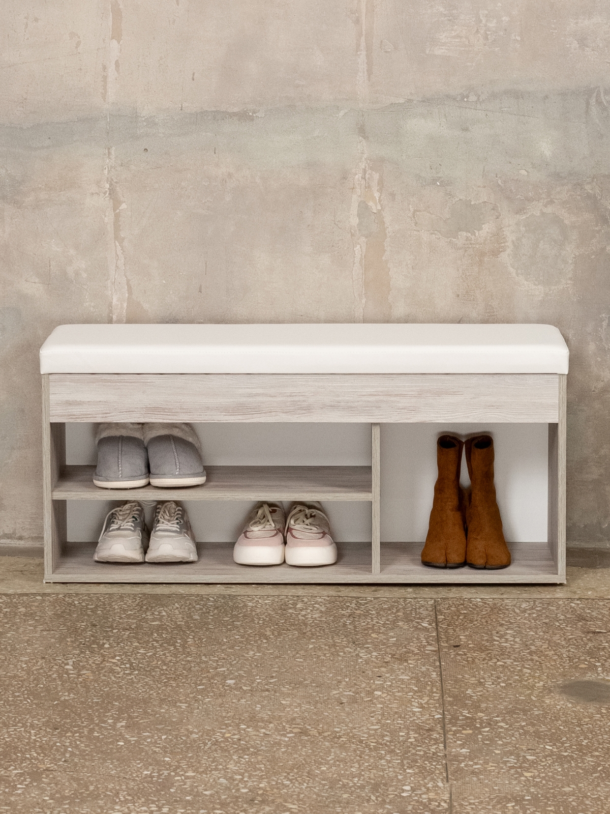 Обувница с мягким сиденьем — это идеальное решение для организованного хранения вашей обуви. Этот стильный и эргономичный предмет мебели объединяет в себе функции банкетки и стеллажа для обуви. Три секции с открытым хранением позволяют удобно разместить вашу коллекцию обуви. Вы сможете легко найти нужную пару и при этом сохранить порядок в прихожей. Также на полках стеллажа можно размещать средства для ухода за обувью. В конструкции этажерки предусмотрен ящик, который можно использовать для хранения редко используемой обуви, аксессуаров и разных мелочей: ключей, зонтов, перчаток. Приятный бонус — мягкое сиденье. Расположившись на нем, можно легко и просто снять или надеть обувь. Плотный поролоновый наполнитель премиум-качества и оптимальная высота сиденья банкетки способствуют расслаблению после долгого рабочего дня. Крепкий каркас выдерживает нагрузку до 80 кг. Обувница отлично сочетается с разными стилями интерьера, будь то минимализм, скандинавский или классический. Банкетка станет удобным стеллажом для обуви дома, на даче, в офисе и в общественных учреждениях. Она подойдет для прихожей, гардеробной, веранды, детской комнаты. Также послужит хранилищем для разных бытовых мелочей на кухне и в гостиной.