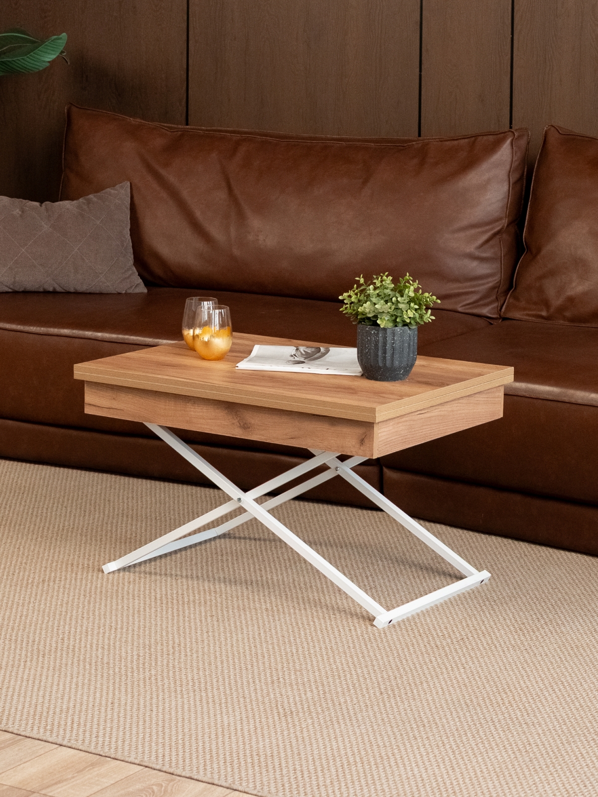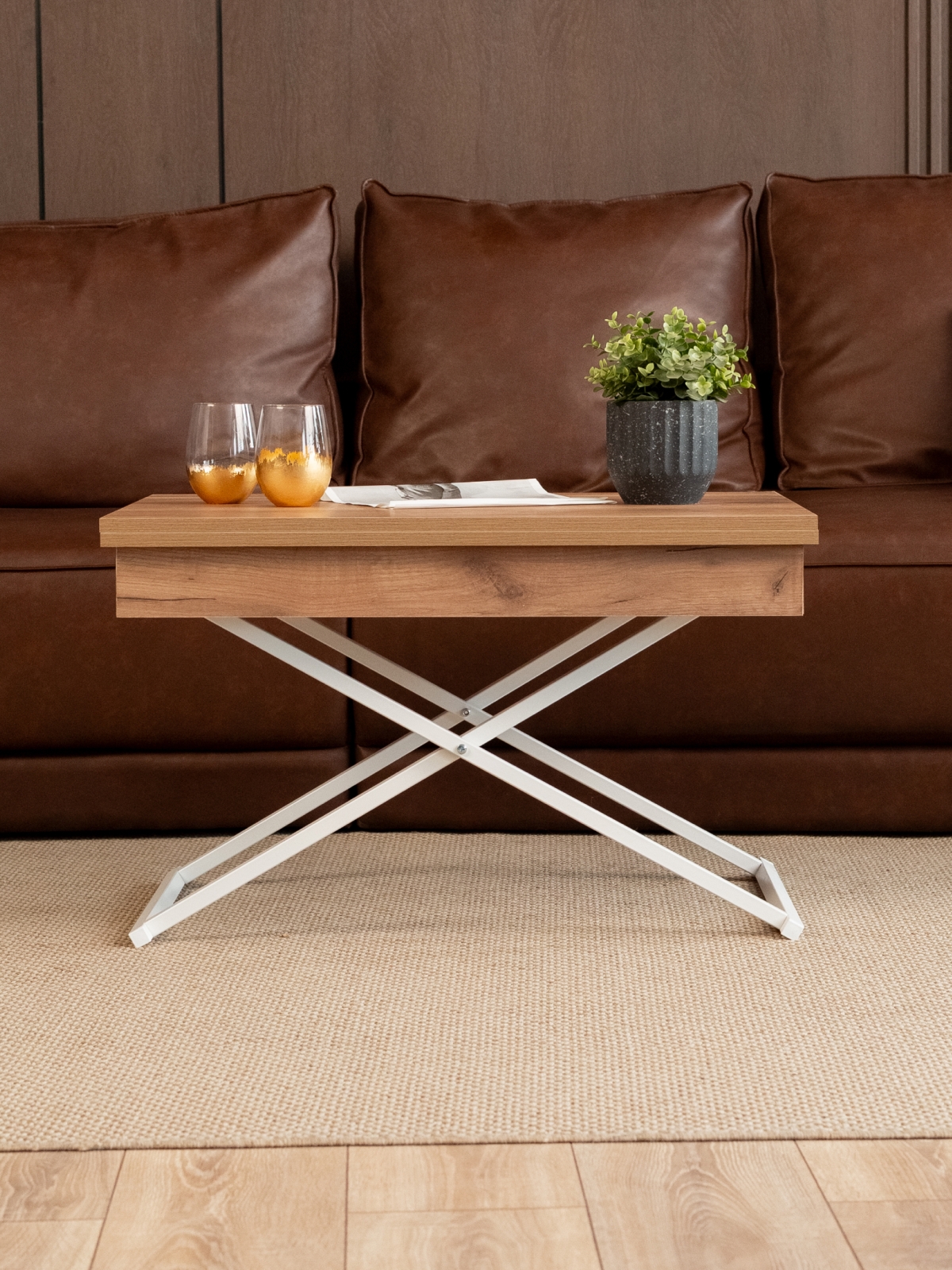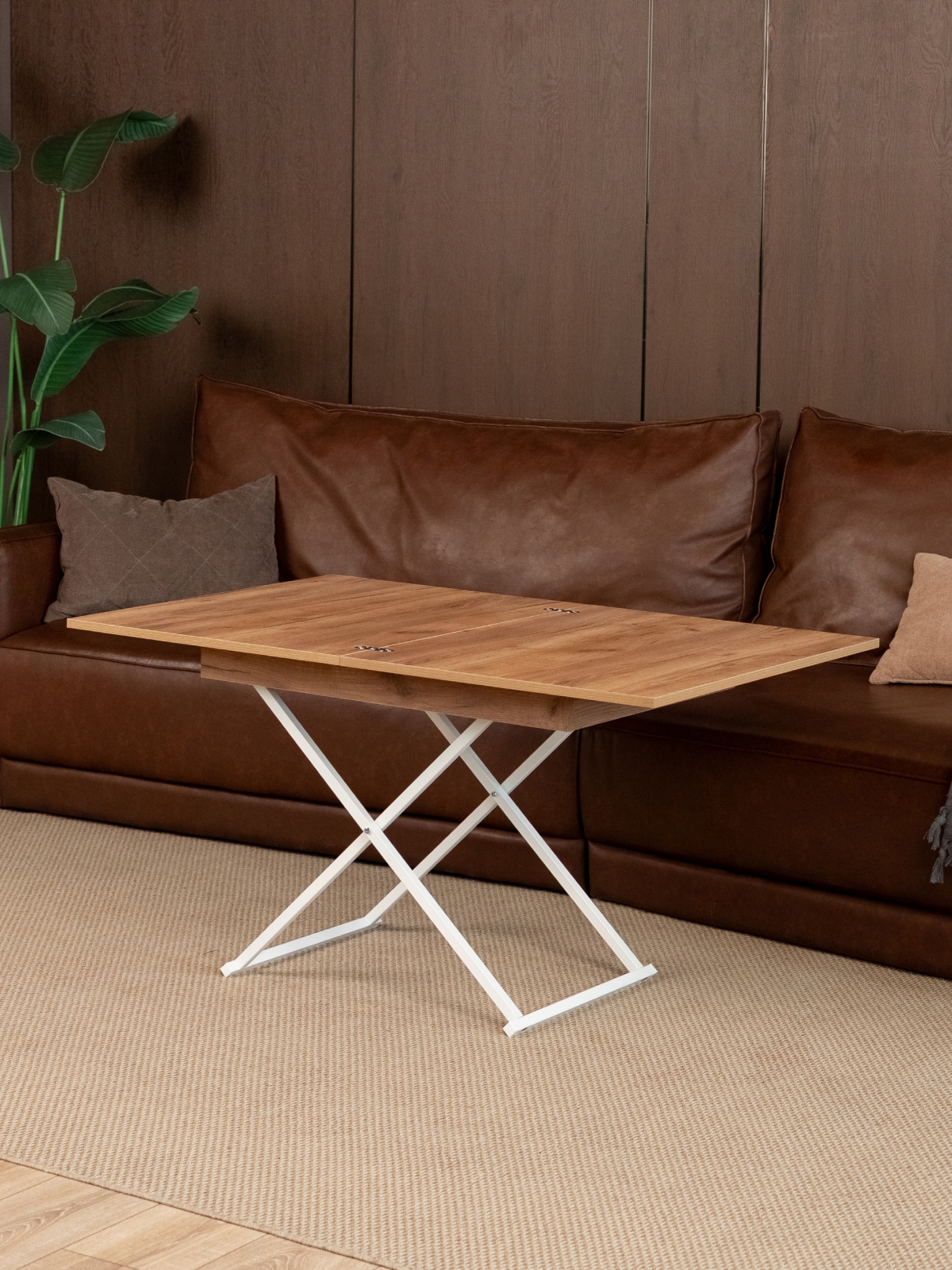 Журнальный стол трансформер раздвижной лофт для гостиной — это современное и универсальное решение, идеально подходящее для тех, кто ценит функциональность, стиль и практичность. Такой стол легко впишется как в небольшую комнату, так и в просторную гостиную, добавив интерьеру свежесть и легкость. Модель отличается современным дизайнерским подходом: металлический каркас в стиле лофт создает ощущение воздушности и минимализма, подчеркивая актуальные тенденции в оформлении жилых пространств. Особенность этого продукта — его трансформируемый механизм. Благодаря продуманной конструкции стол можно использовать в нескольких конфигурациях: в сложенном состоянии — компактный и низкий журнальный столик для уютных вечеров в гостиной, а при необходимости — легко трансформируется в большой обеденный стол на металлических ножках, подходящий для семейных ужинов, встреч с гостями или уютных посиделок.