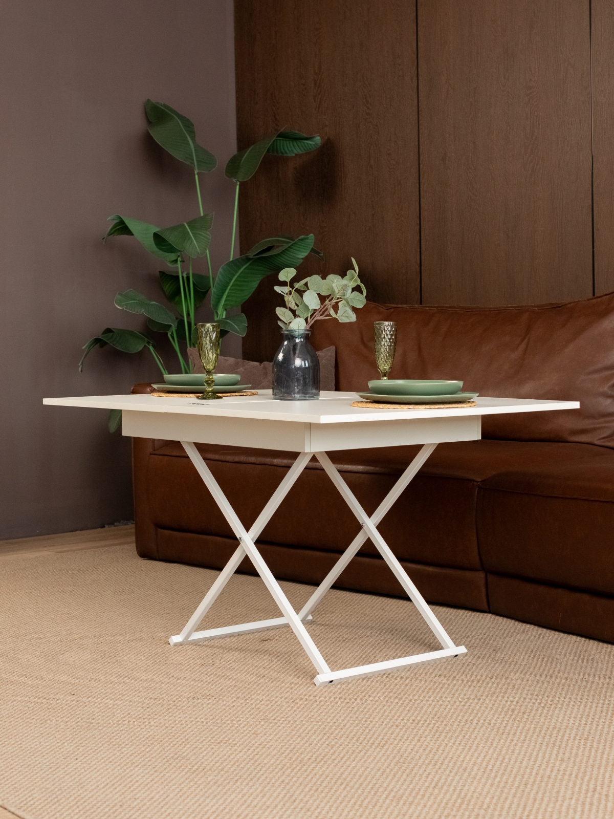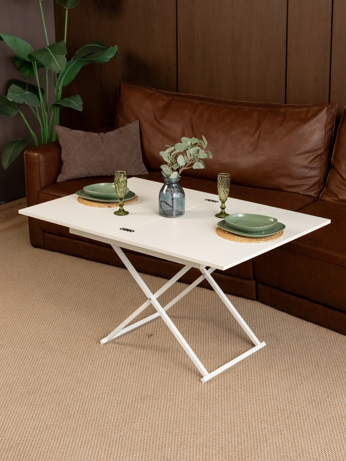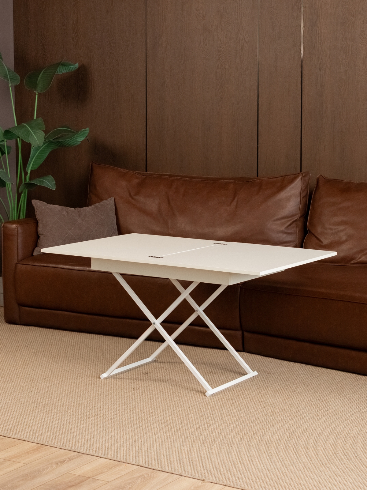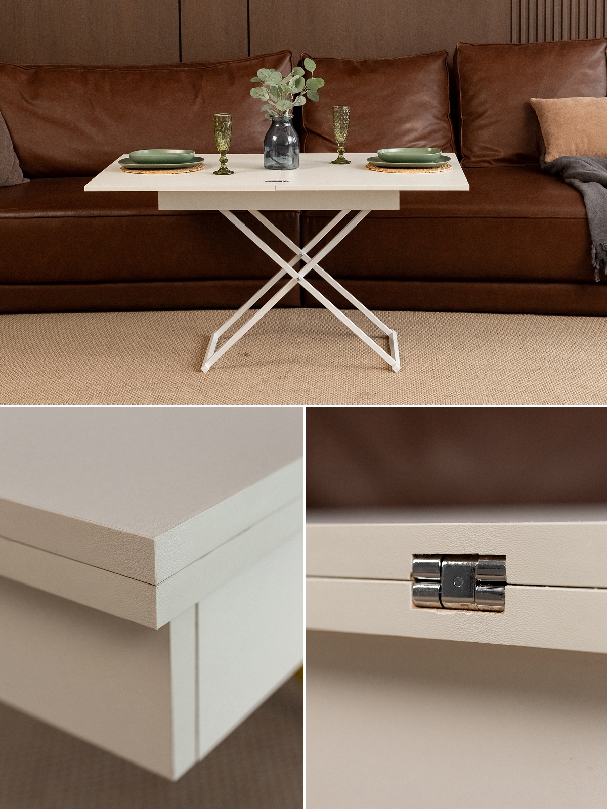 Раздвижная столешница и регулируемая высота позволяют подобрать оптимальный вариант для любой ситуации: будь то кофе-пауза, работа за ноутбуком или праздничный ужин. Важное преимущество — наличие подъемного механизма и регулировки высоты. Столик легко адаптируется под нужды семьи: его можно поднять до уровня полубарного или обеденного стола, что особенно удобно для современных квартир-студий, где часто совмещены кухня и гостиная. Такой универсальный подход делает стол трансформер незаменимым элементом для кухонного пространства, обеденной зоны или даже столовой. Благодаря складной конструкции изделие занимает минимум места в комнате, а при необходимости быстро раскладывается, превращаясь в полноценную поверхность для работы или приема гостей.