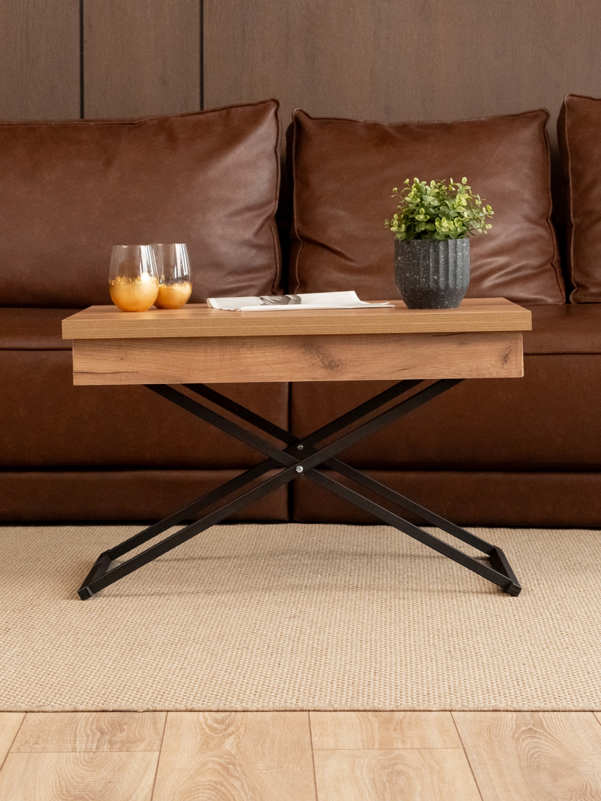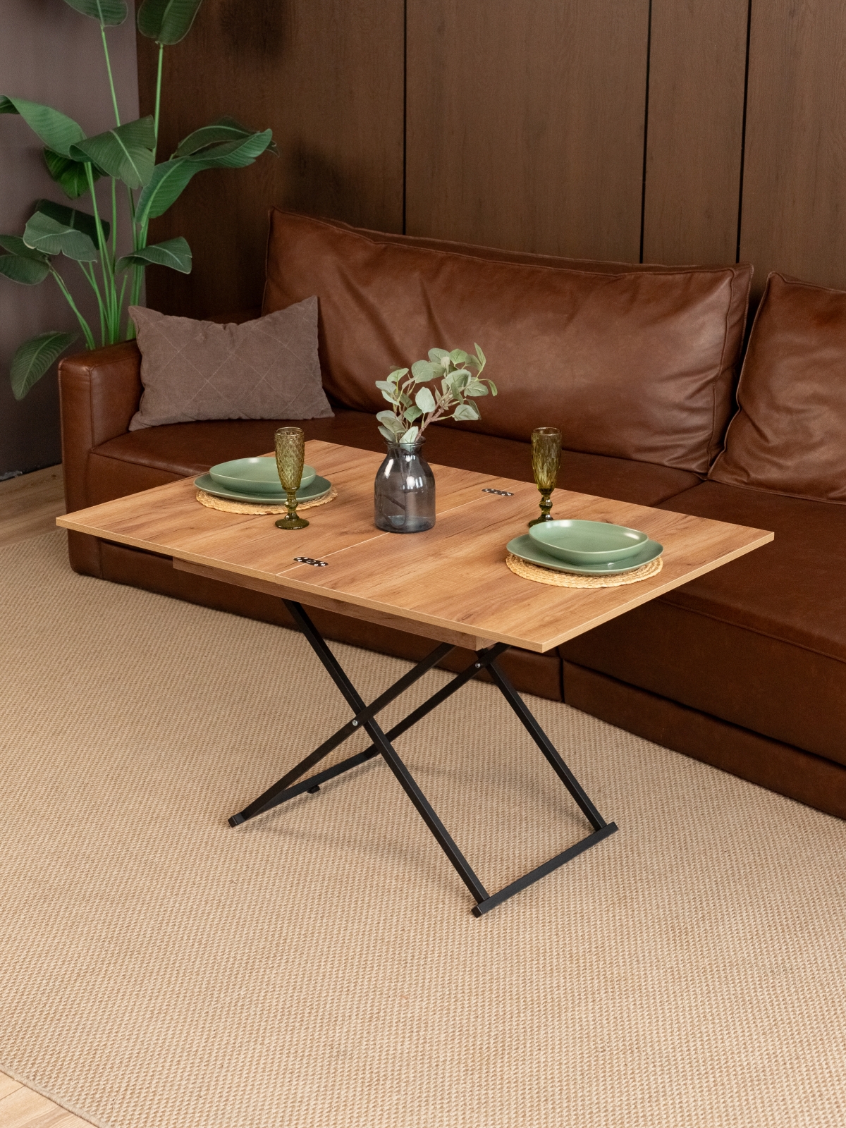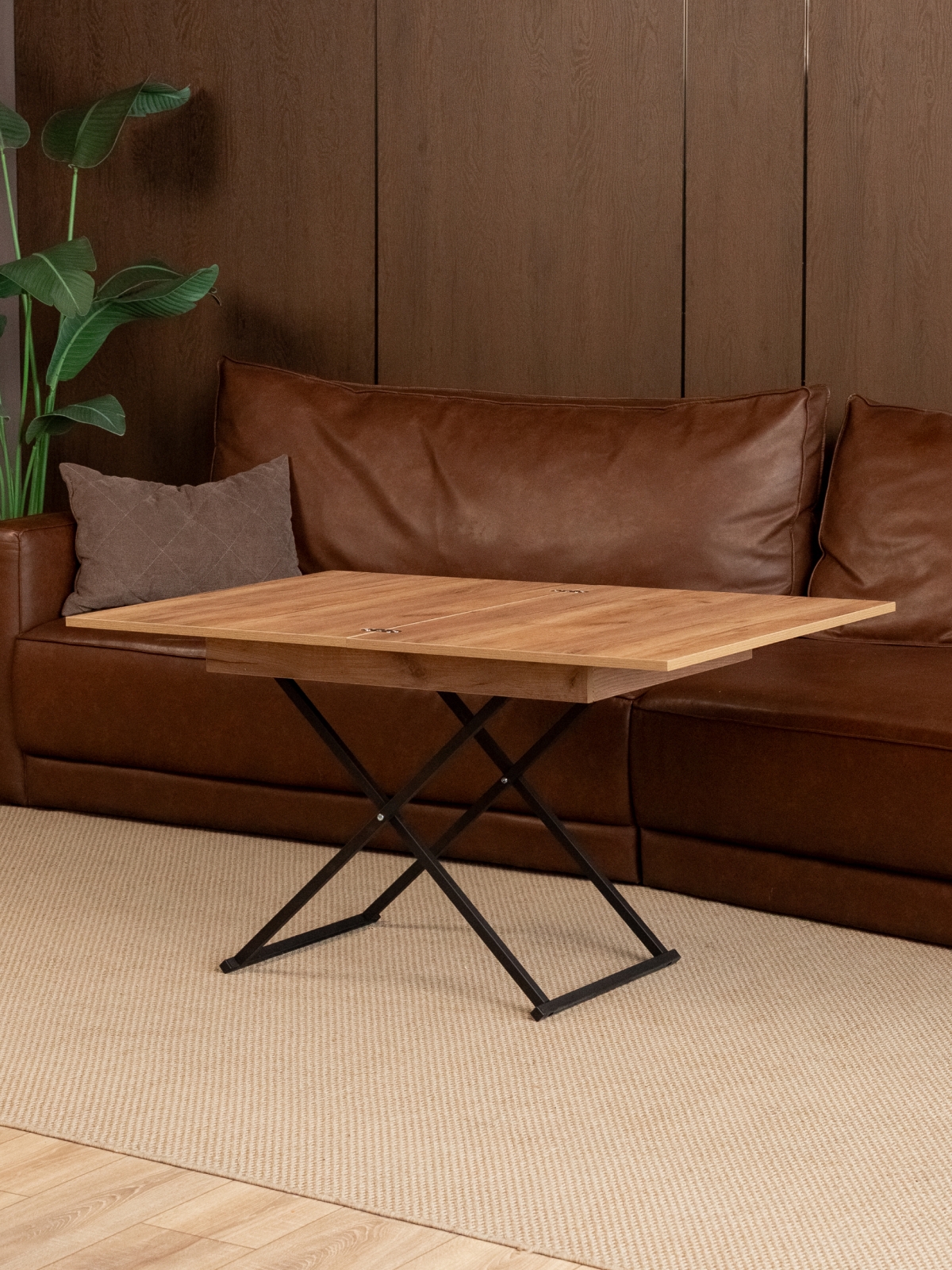 Журнальный обеденный стол-трансформер раздвижной для гостиной — стильное и современное лофт-решение для дома и квартиры. Этот универсальный раскладной стол отличается функциональностью и лаконичным дизайнерским подходом. В сложенном виде — низкий журнальный столик с регулируемой высотой, который гармонично впишется в интерьер гостиной. В разложенном состоянии — полноценный гостевой стол. Стол на металлическом каркасе удобный и устойчивый, а его конструкция продумана до мелочей для максимально легкой трансформации. Благодаря подъемному механизму, мебель легко трансформируется из компактного журнального столика в полноценный обеденный стол прямоугольной формы, подходящий для большой семьи и гостей.