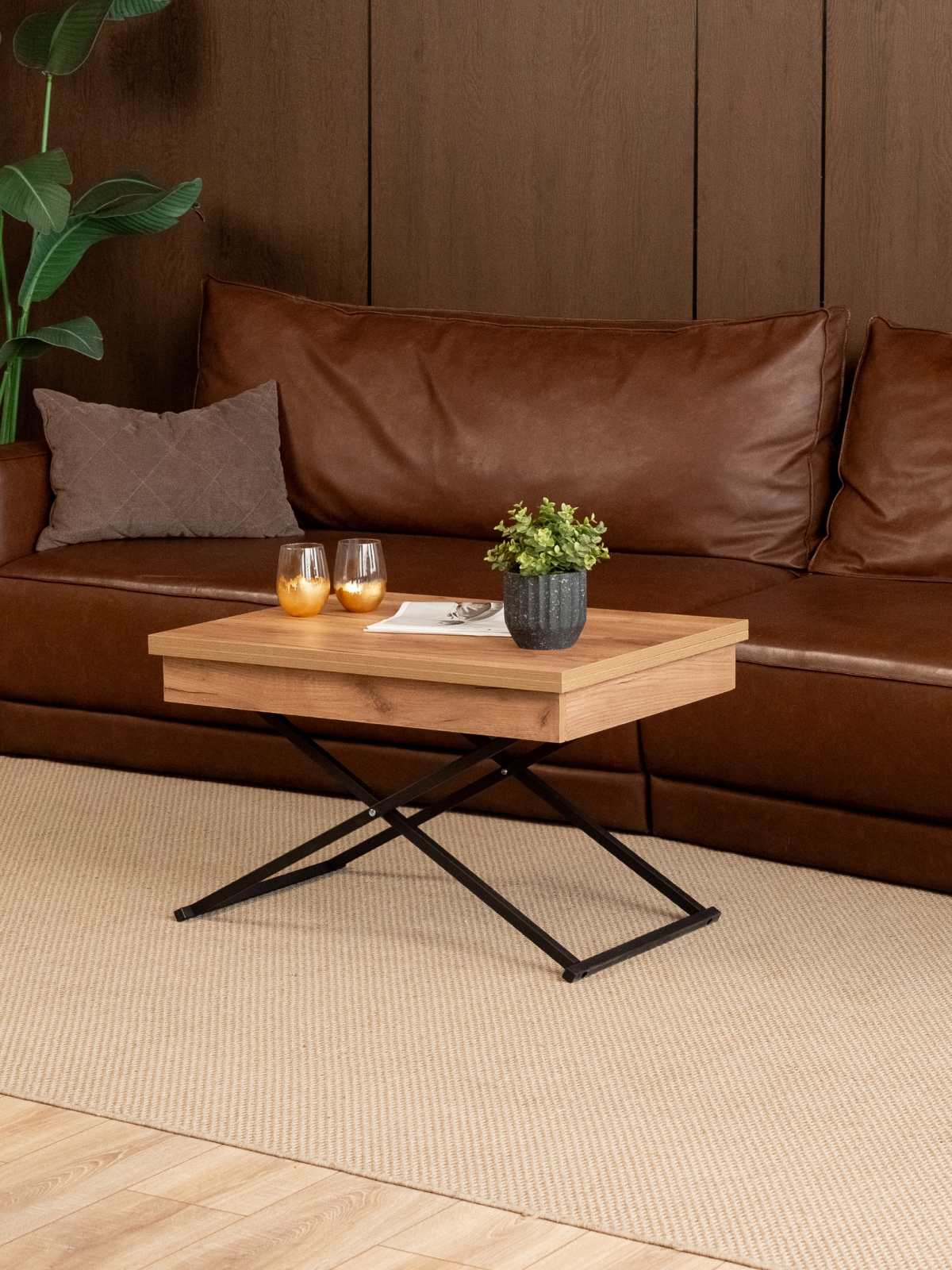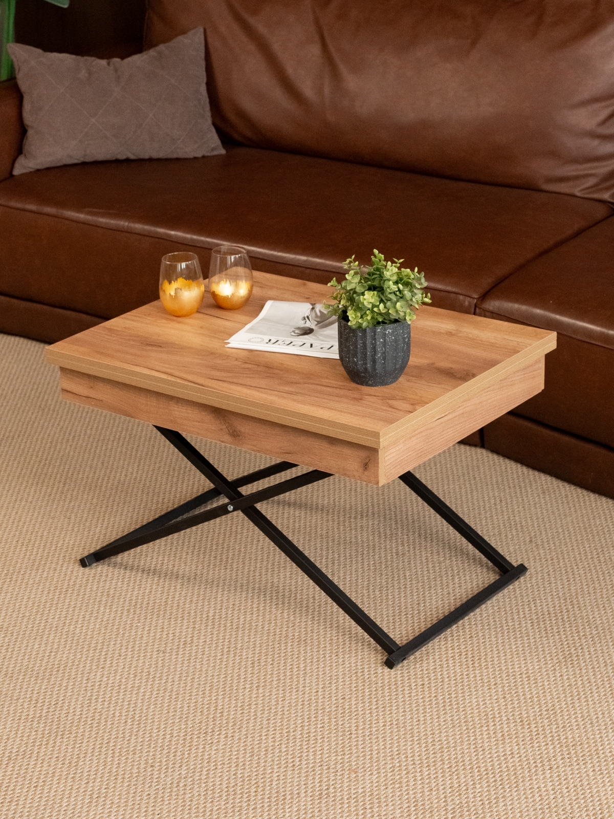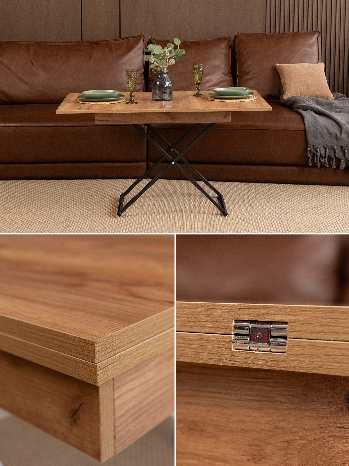 Журнальный обеденный стол-трансформер раздвижной для гостиной — стильное и современное лофт-решение для дома и квартиры. Этот универсальный раскладной стол отличается функциональностью и лаконичным дизайнерским подходом. В сложенном виде — низкий журнальный столик с регулируемой высотой, который гармонично впишется в интерьер гостиной. В разложенном состоянии — полноценный гостевой стол. Стол на металлическом каркасе удобный и устойчивый, а его конструкция продумана до мелочей для максимально легкой трансформации. Благодаря подъемному механизму, мебель легко трансформируется из компактного журнального столика в полноценный обеденный стол прямоугольной формы, подходящий для большой семьи и гостей.