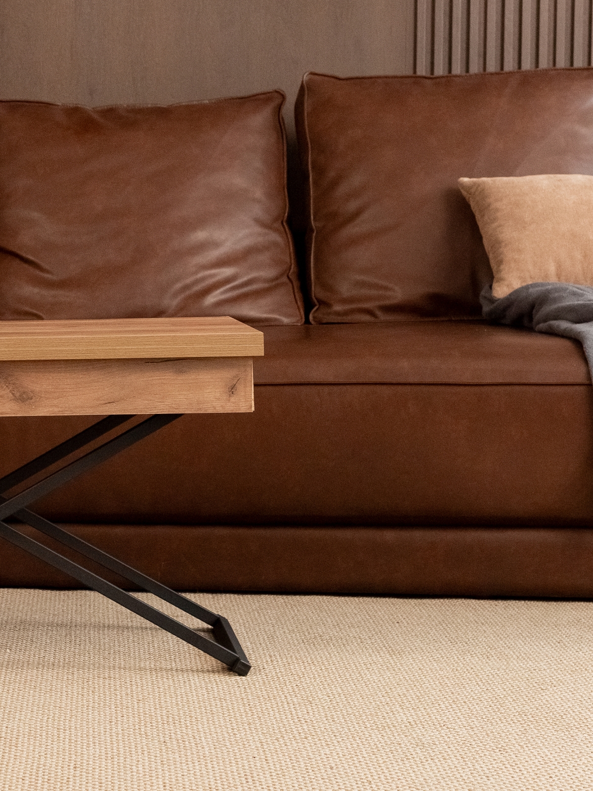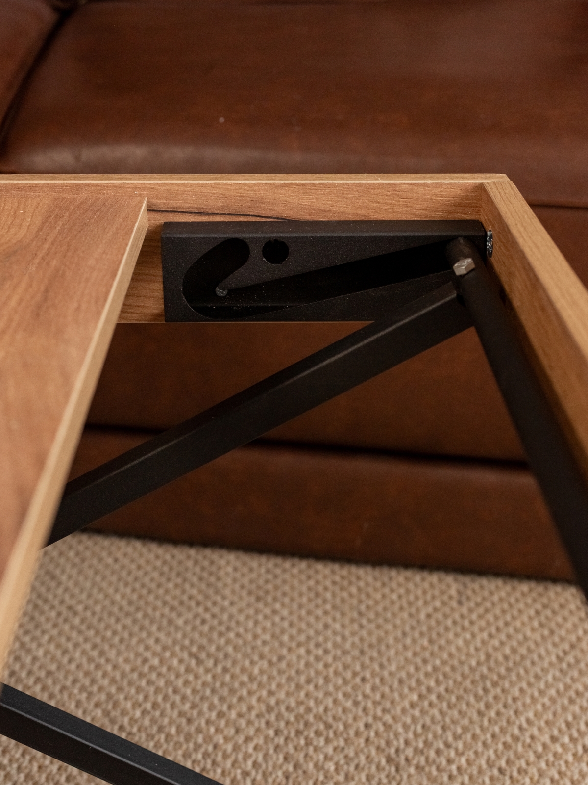 При необходимости, низкий стол можно поднять до высокого полубарного варианта, что особенно удобно для вечеринок и встреч с друзьями. Механизм трансформации обеспечивает три варианта регулировки высоты, позволяя подобрать оптимальный уровень под любые нужды. Раздвижная столешница из ЛДСП легко раскладывается и складывается, сохраняя привлекательный внешний вид на протяжении всего срока эксплуатации. Металлический каркас выполнен из усиленного профиля, что придает столу дополнительную прочность и надежность. Черный цвет каркаса — классика стиля лофт, идеально подчеркивающая современные индустриальные интерьеры с акцентом на контрасты.