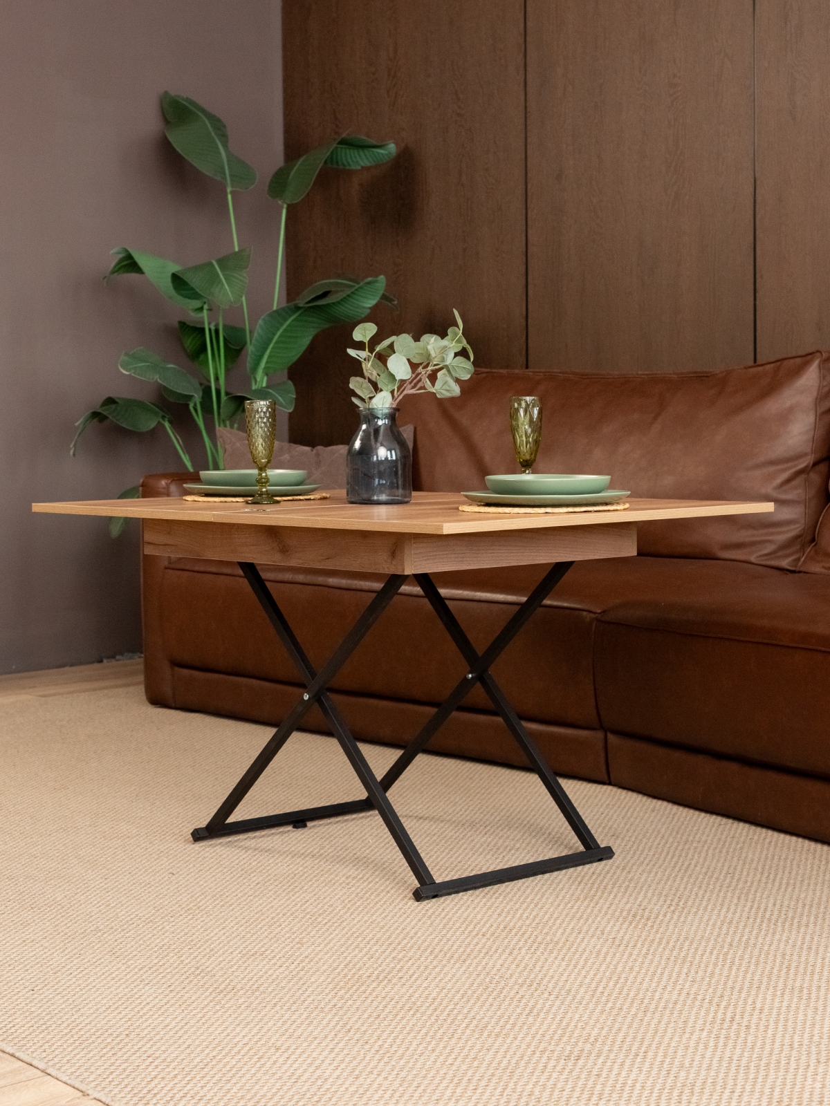 Стол лофт сочетается с кирпичными стенами, темной мебелью и урбанистическими элементами, создавая гармоничное пространство для жизни и отдыха. Небольшой раскладной стол — отличный выбор для кухни-гостиной в студии, где важно рационально использовать каждый квадратный метр. В сложенном виде он занимает минимум места, позволяя свободно перемещаться по комнате. Когда приходят гости, стол легко превращается в большой кухонный или кофейный вариант, подходящий для уютных семейных ужинов или праздничных мероприятий.