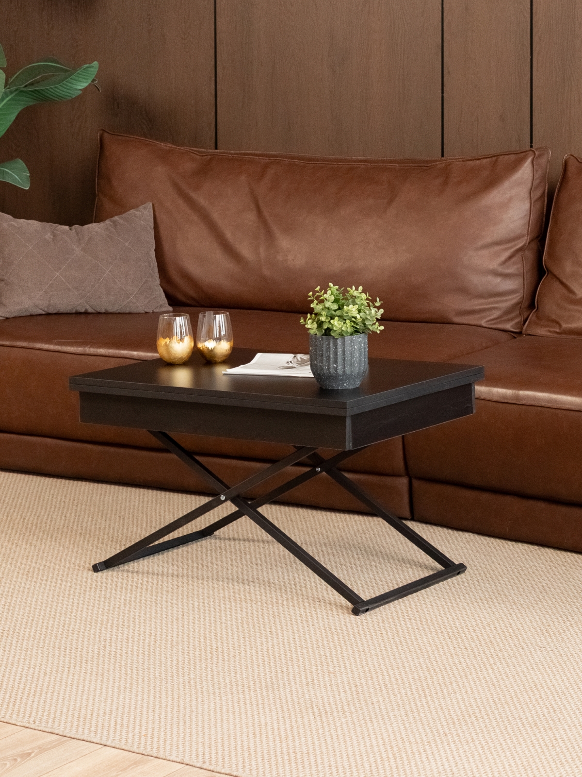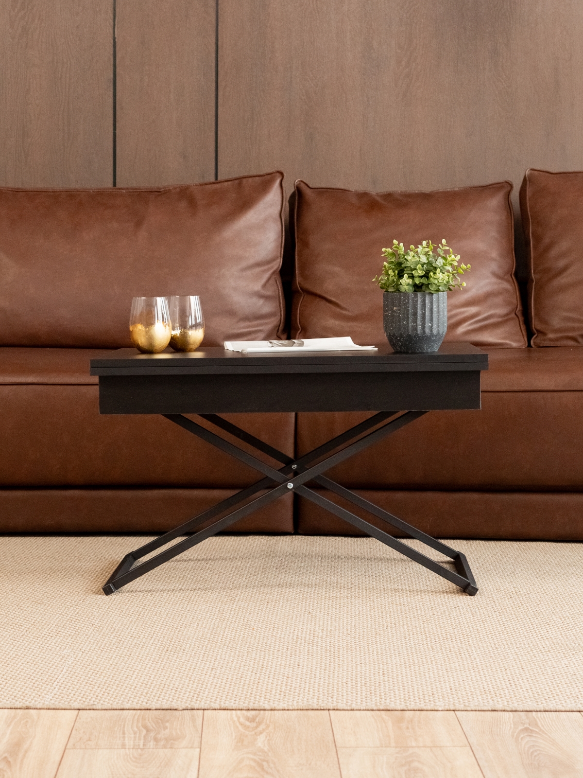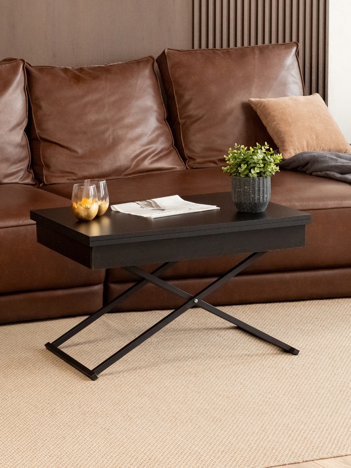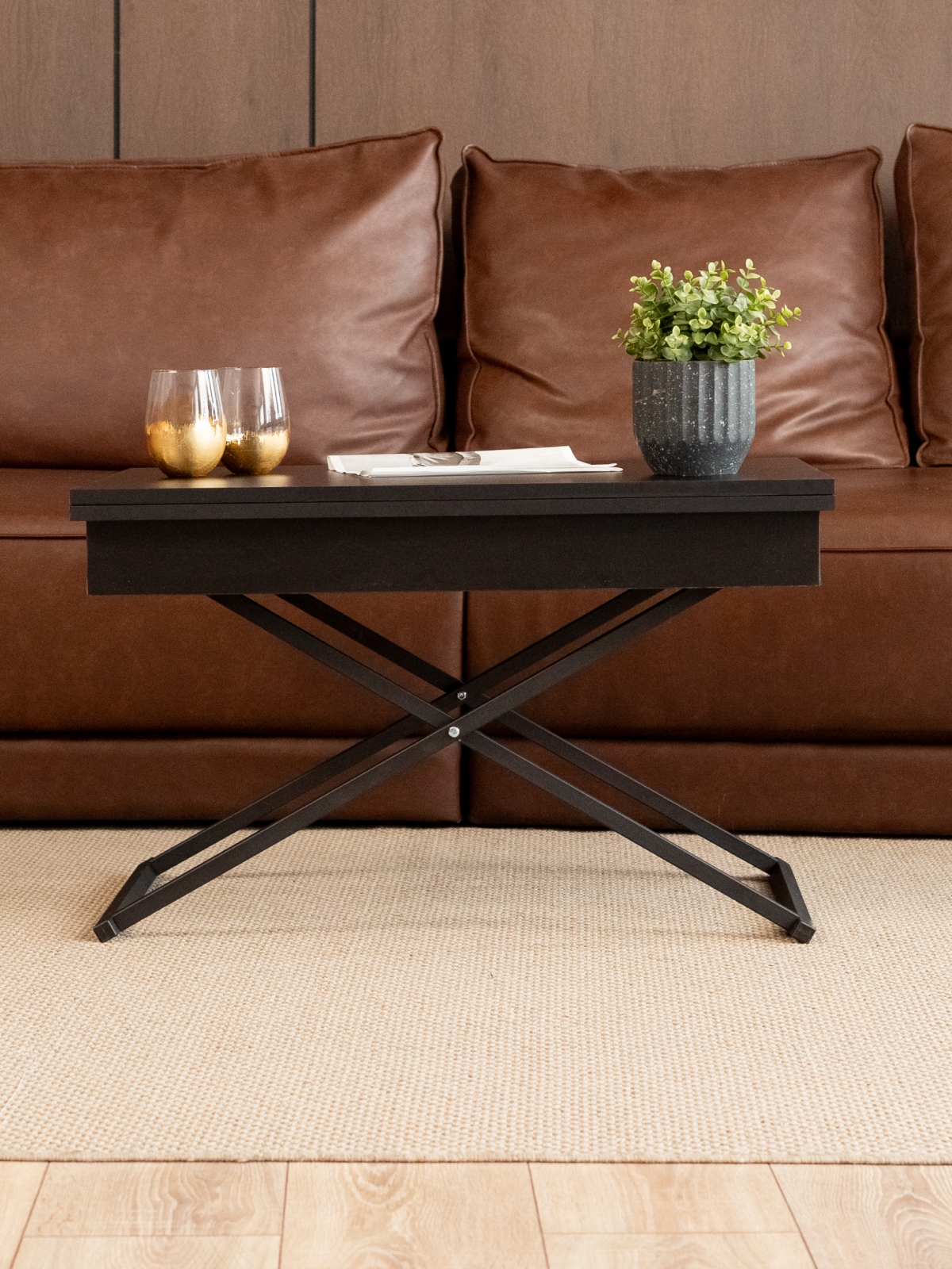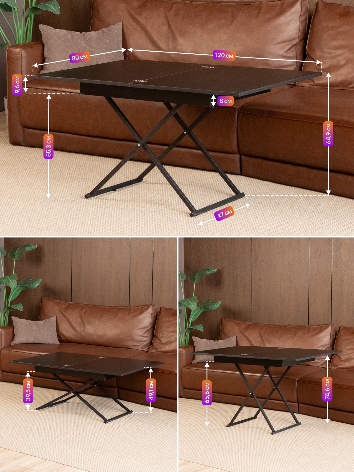 Журнальный обеденный стол-трансформер раздвижной для гостиной — стильное и современное лофт-решение для дома и квартиры. Этот универсальный раскладной стол отличается функциональностью и лаконичным дизайнерским подходом. В сложенном виде — низкий журнальный столик с регулируемой высотой, который гармонично впишется в интерьер гостиной. В разложенном состоянии — полноценный гостевой стол. Стол на металлическом каркасе удобный и устойчивый, а его конструкция продумана до мелочей для максимально легкой трансформации. Благодаря подъемному механизму, мебель легко трансформируется из компактного журнального столика в полноценный обеденный стол прямоугольной формы, подходящий для большой семьи и гостей.