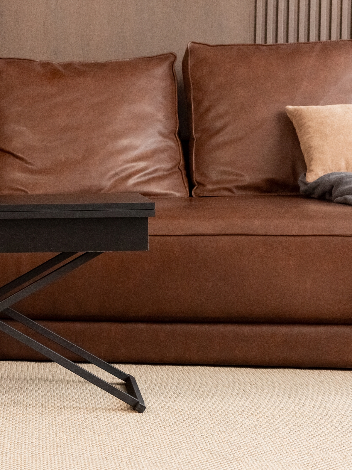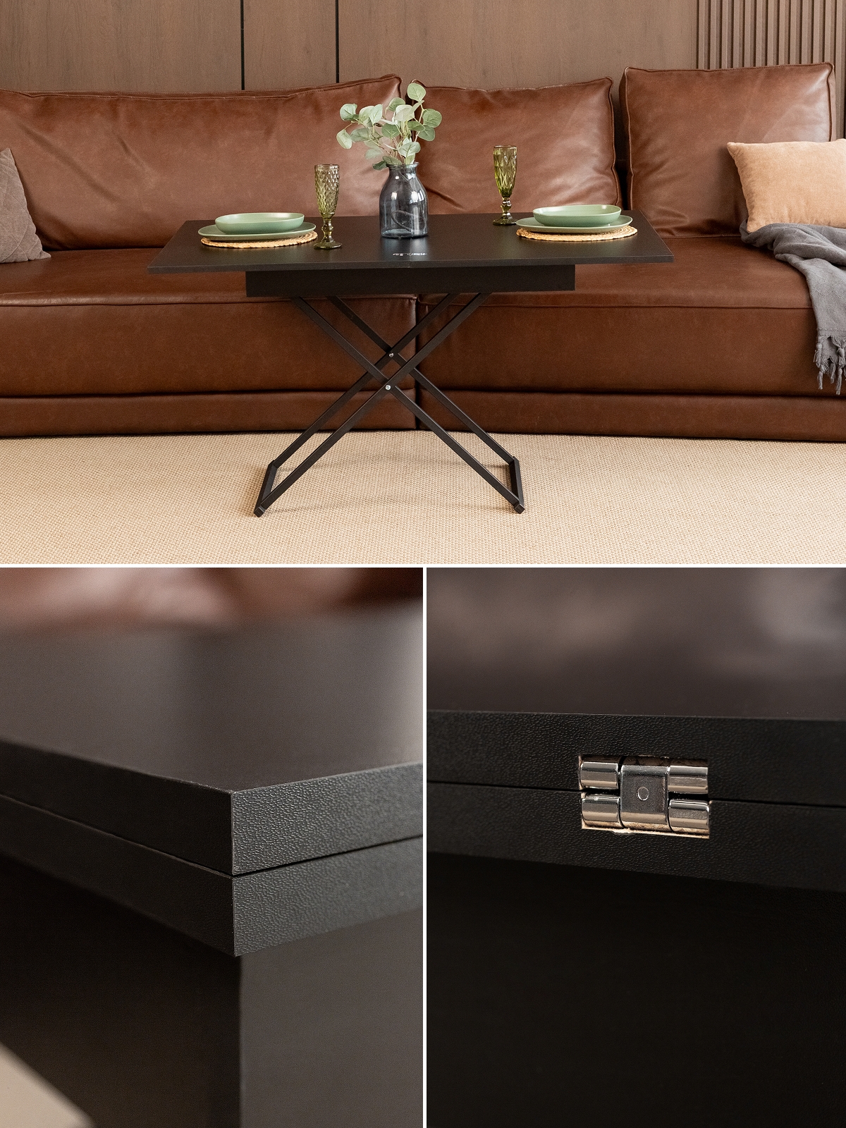 При необходимости, низкий стол можно поднять до высокого полубарного варианта, что особенно удобно для вечеринок и встреч с друзьями. Механизм трансформации обеспечивает три варианта регулировки высоты, позволяя подобрать оптимальный уровень под любые нужды. Раздвижная столешница из ЛДСП легко раскладывается и складывается, сохраняя привлекательный внешний вид на протяжении всего срока эксплуатации. Металлический каркас выполнен из усиленного профиля, что придает столу дополнительную прочность и надежность. Черный цвет каркаса — классика стиля лофт, идеально подчеркивающая современные индустриальные интерьеры с акцентом на контрасты.