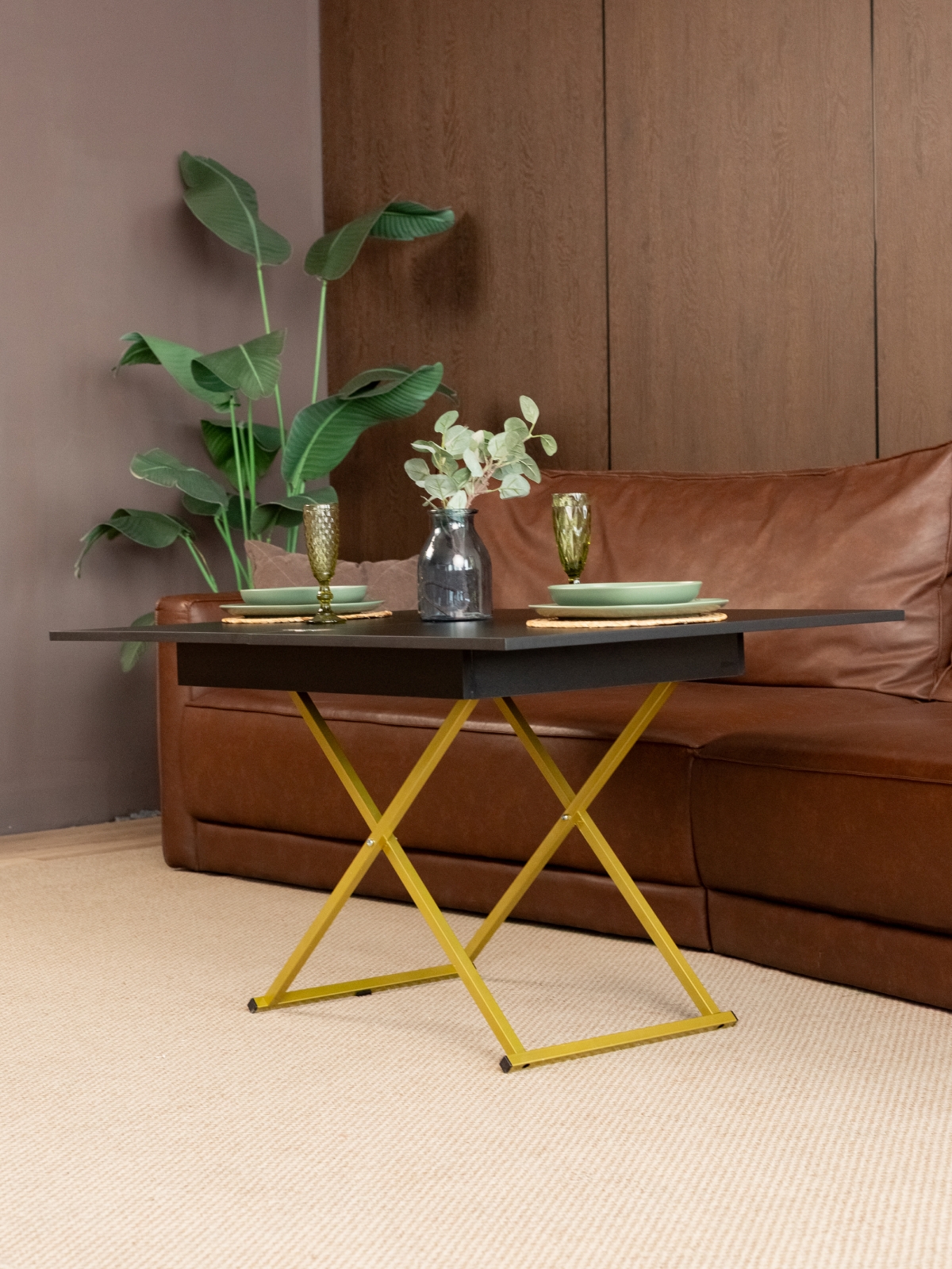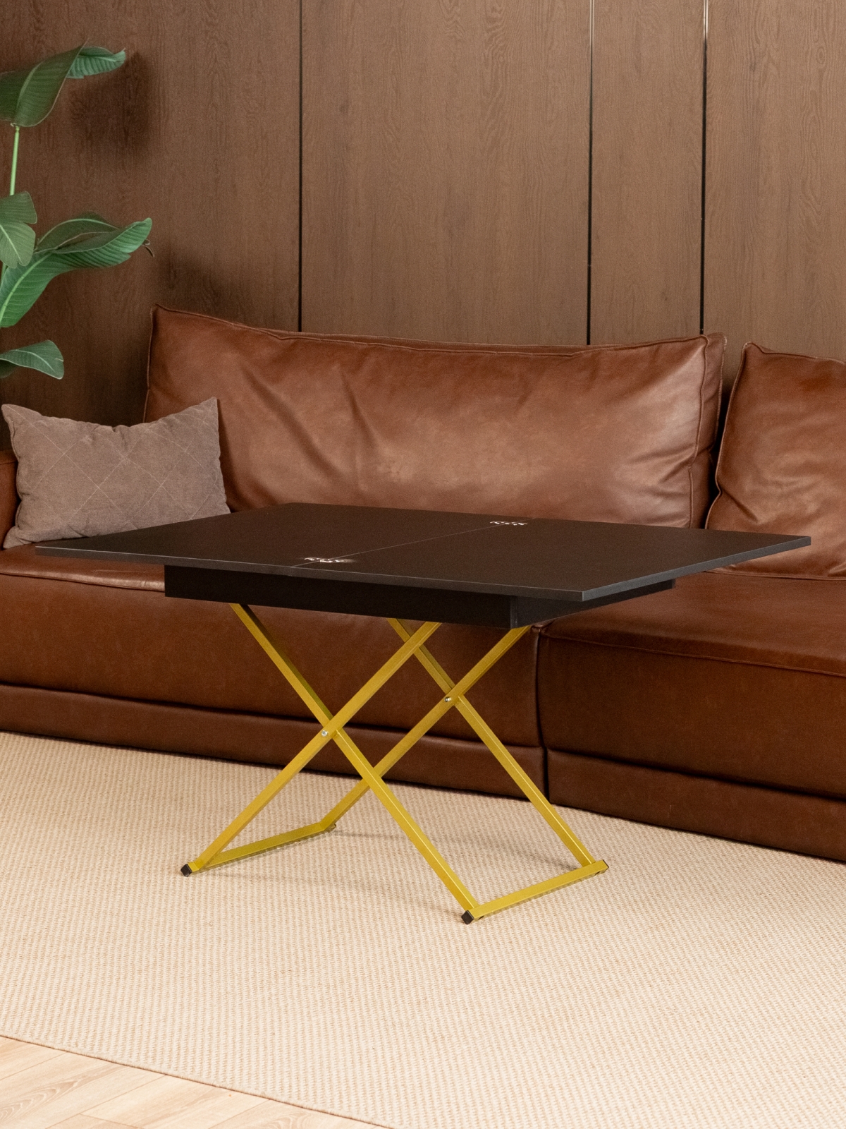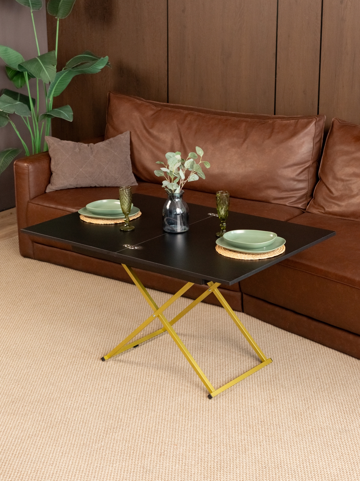 Металлический каркас на регулируемых ножках гарантирует устойчивость даже при максимальной нагрузке, а прочные материалы обеспечивают долговечность использования дома, в студии или на кухне. Дизайнерский подход проявляется в каждой детали: золотой акцент подчеркивает стиль и статус, а лаконичные формы делают стол актуальным для современных интерьеров. Регулируемая высота позволяет использовать его как стол для семейных посиделок, и как консоль для декора. Стол легко трансформируется по вашему желанию — от компактного журнального столика до большого столового или обеденного стола для приема гостей. Сочетание металлического каркаса с современным стилем лофт делает этот складной стол отличным решением для ценителей дизайнерских предметов. Он подойдет для гостиной, кухни, столовой, а также станет ярким акцентом в комнате для гостей или зоне отдыха. Складные ножки и подъемный механизм обеспечивают простоту использования и удобство хранения.