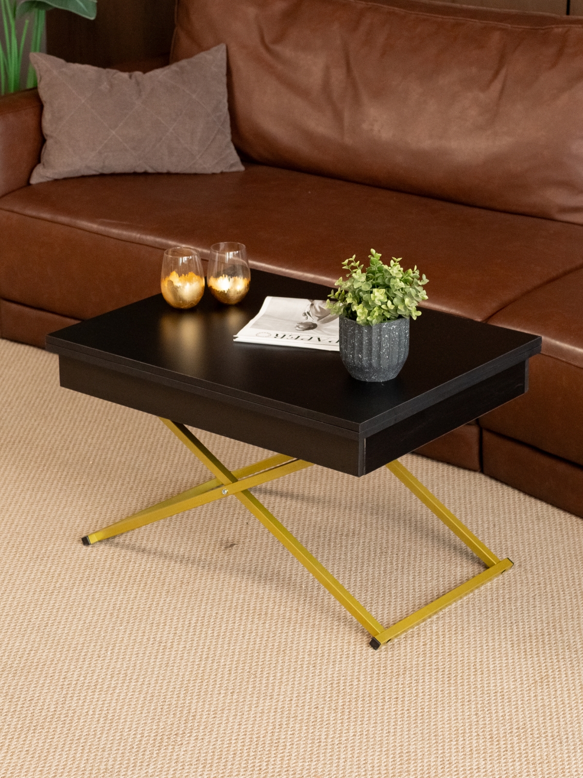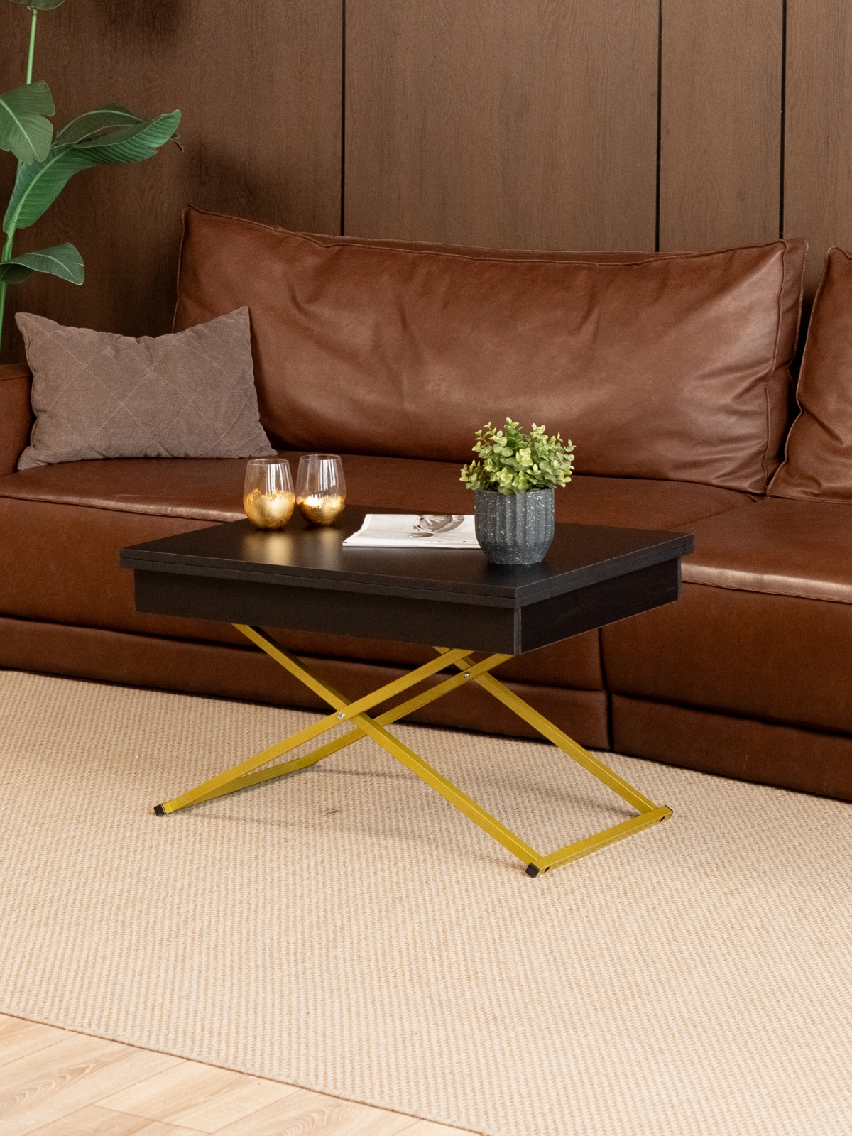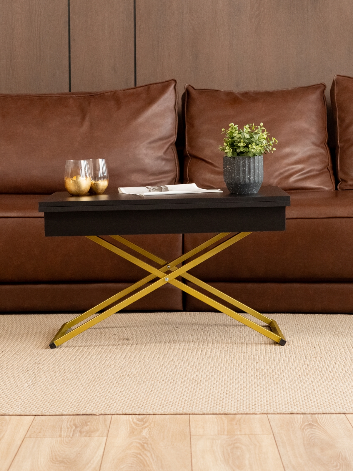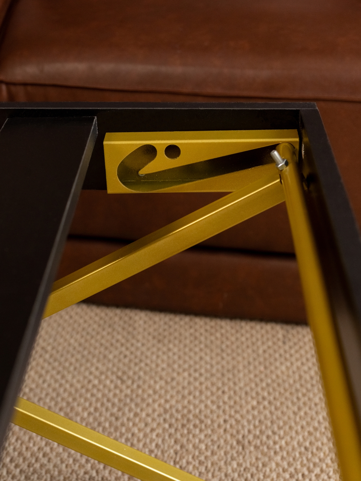 Металлический каркас на регулируемых ножках гарантирует устойчивость даже при максимальной нагрузке, а прочные материалы обеспечивают долговечность использования дома, в студии или на кухне. Дизайнерский подход проявляется в каждой детали: золотой акцент подчеркивает стиль и статус, а лаконичные формы делают стол актуальным для современных интерьеров. Регулируемая высота позволяет использовать его как стол для семейных посиделок, и как консоль для декора. Стол легко трансформируется по вашему желанию — от компактного журнального столика до большого столового или обеденного стола для приема гостей. Сочетание металлического каркаса с современным стилем лофт делает этот складной стол отличным решением для ценителей дизайнерских предметов. Он подойдет для гостиной, кухни, столовой, а также станет ярким акцентом в комнате для гостей или зоне отдыха. Складные ножки и подъемный механизм обеспечивают простоту использования и удобство хранения.