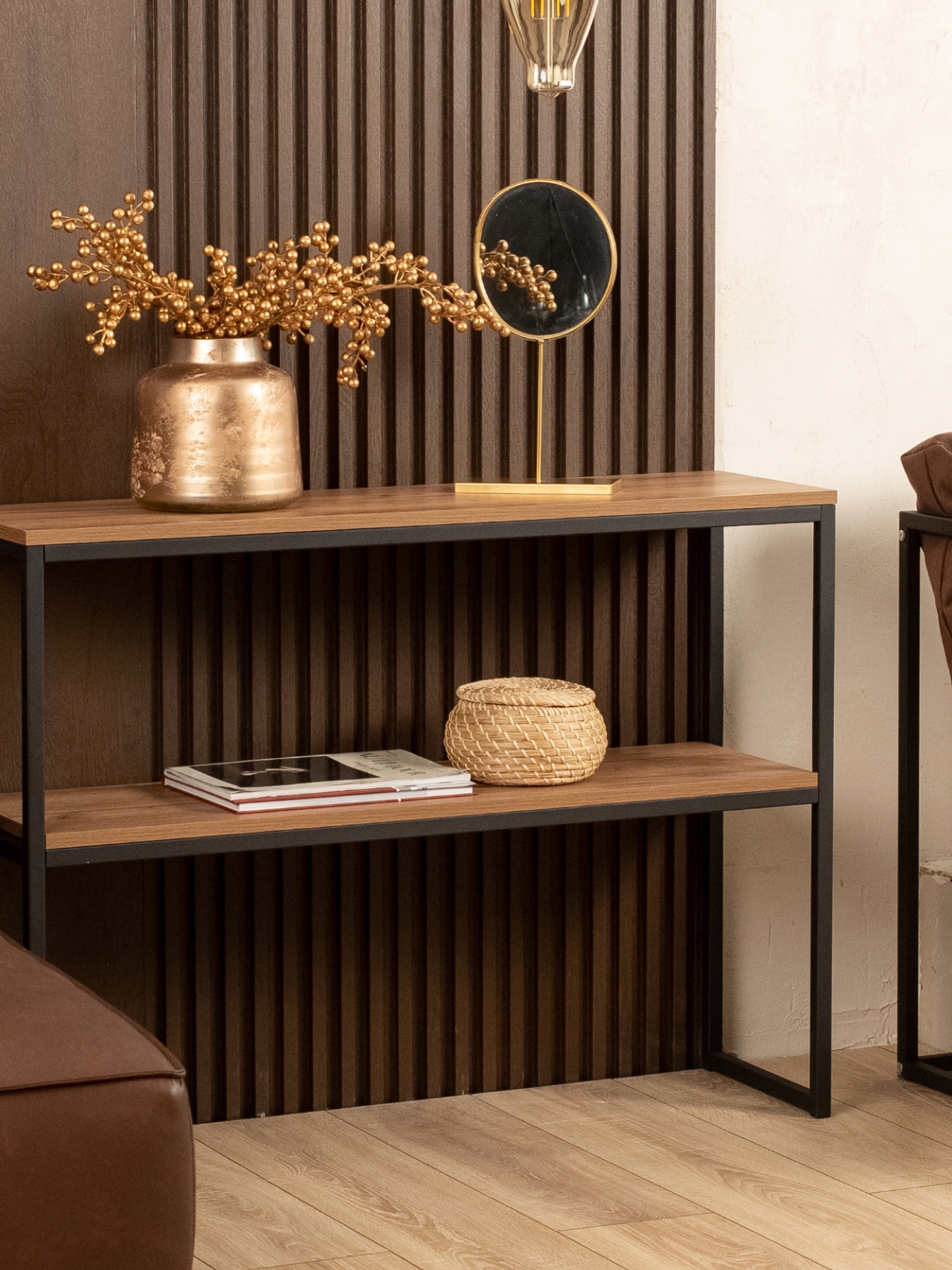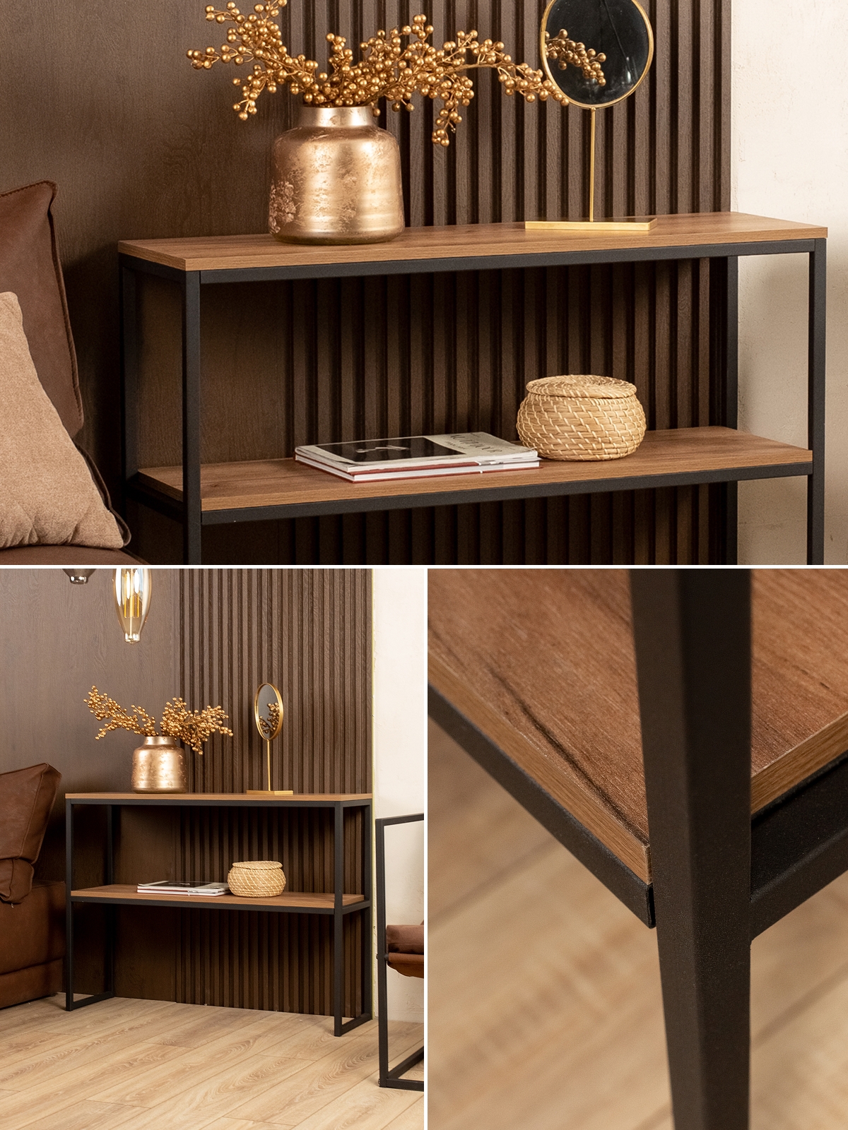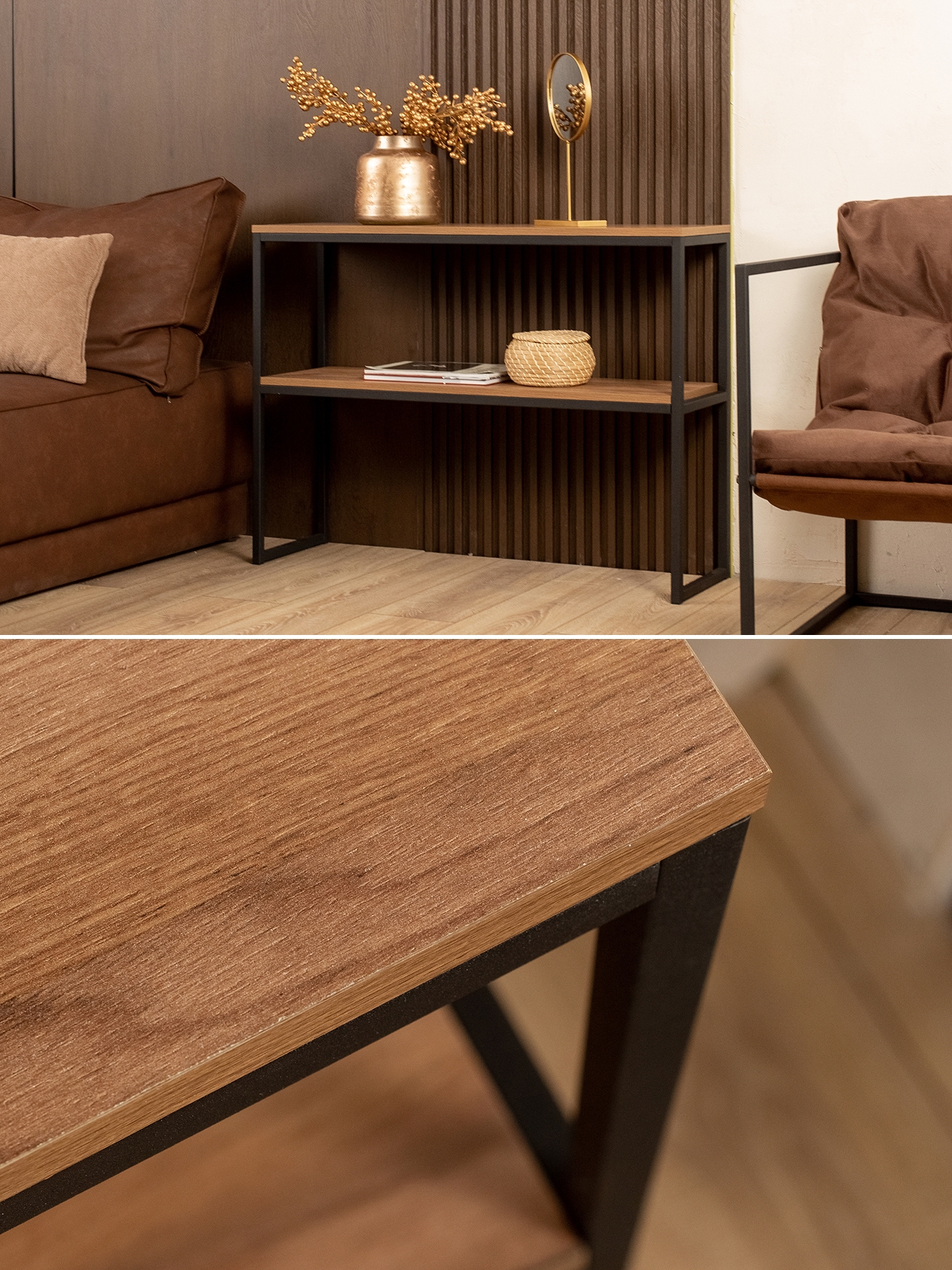 Консоль в прихожую «Вакка» с металлическим каркасом в черном цвете — это не просто функциональный предмет мебели, а выразительный акцент, способный задать тон интерьеру. Универсальный и продуманный дизайн делает тумбу для телевизора идеальным решением для различных пространств: квартиры, дачи, а также офисов, лобби или залов ожидания. Компактные размеры и лаконичная форма позволяют разместить консольный стол даже в небольших комнатах без потери площади.