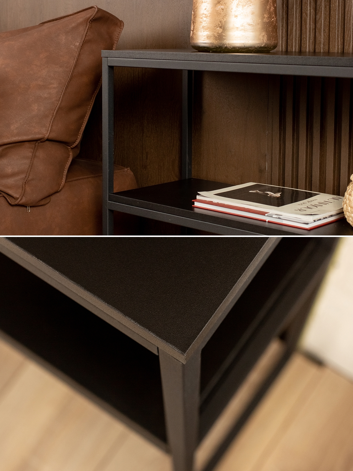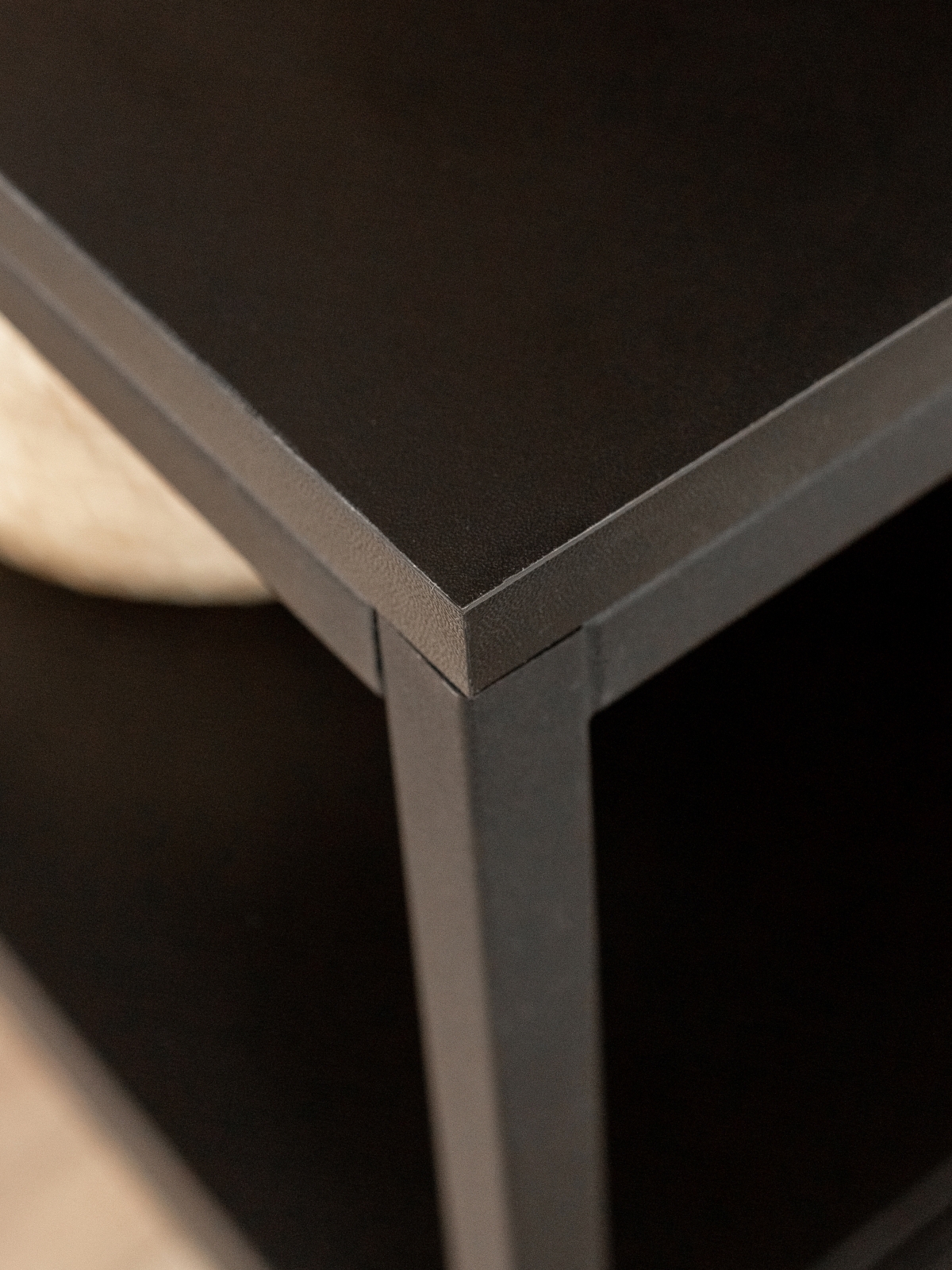Черный металлический каркас придает столу под ТВ выразительность и строгость, типичную для лофта. Именно черный цвет идеально подчеркивает индустриальные элементы интерьера: открытые трубы, балки, кирпичную кладку, бетонные или оштукатуренные стены. Полимерно-порошковая краска сохраняет безупречный внешний вид даже при интенсивной эксплуатации. Прочные полки толщиной 16 мм выдерживает регулярные нагрузки, подчеркивают сбалансированность конструкции.