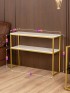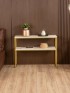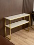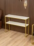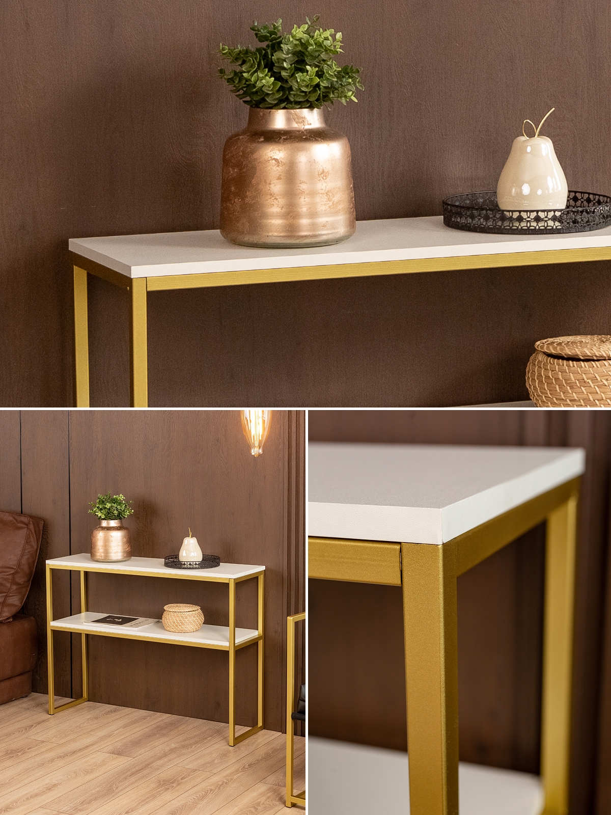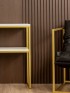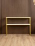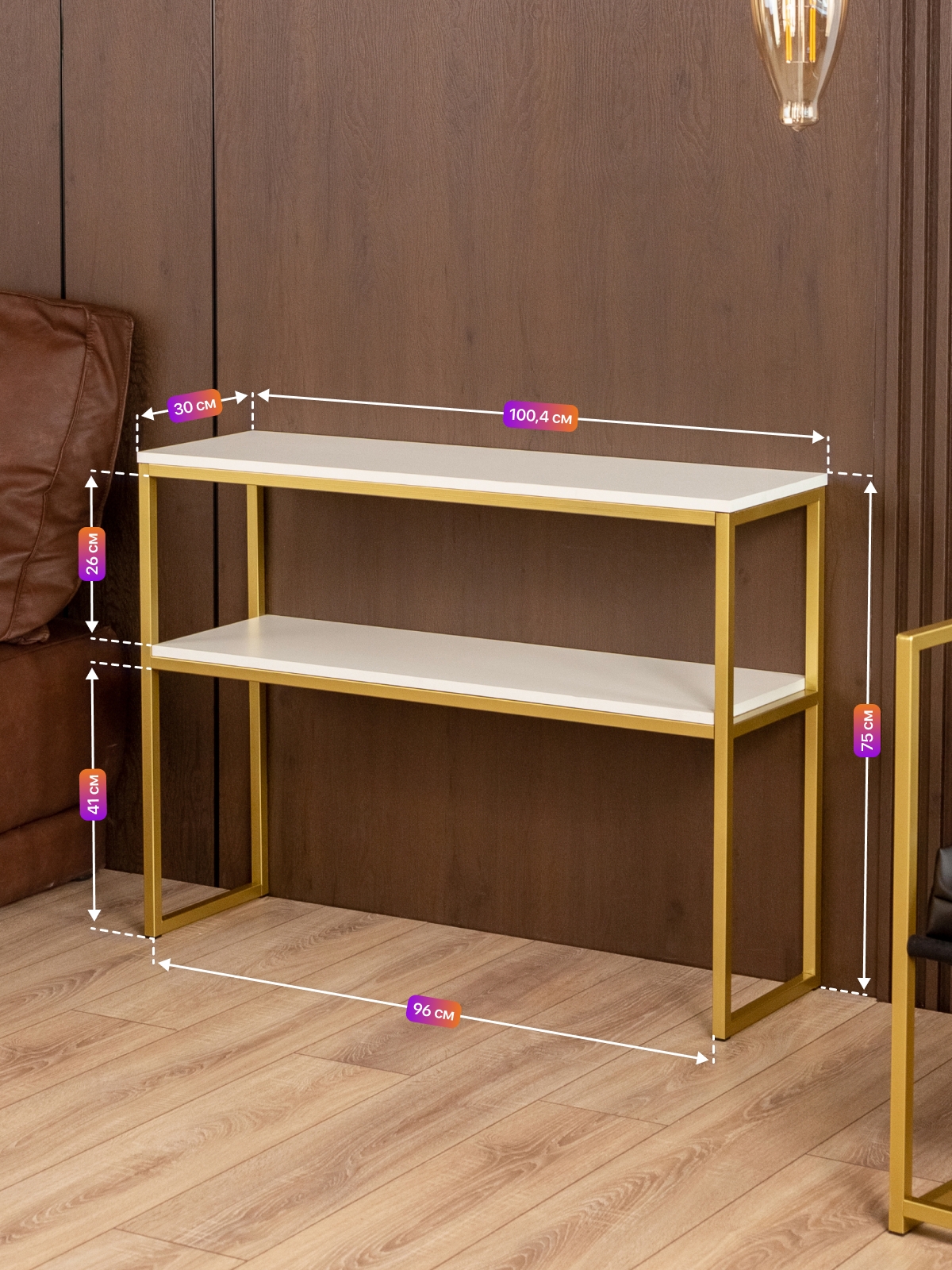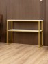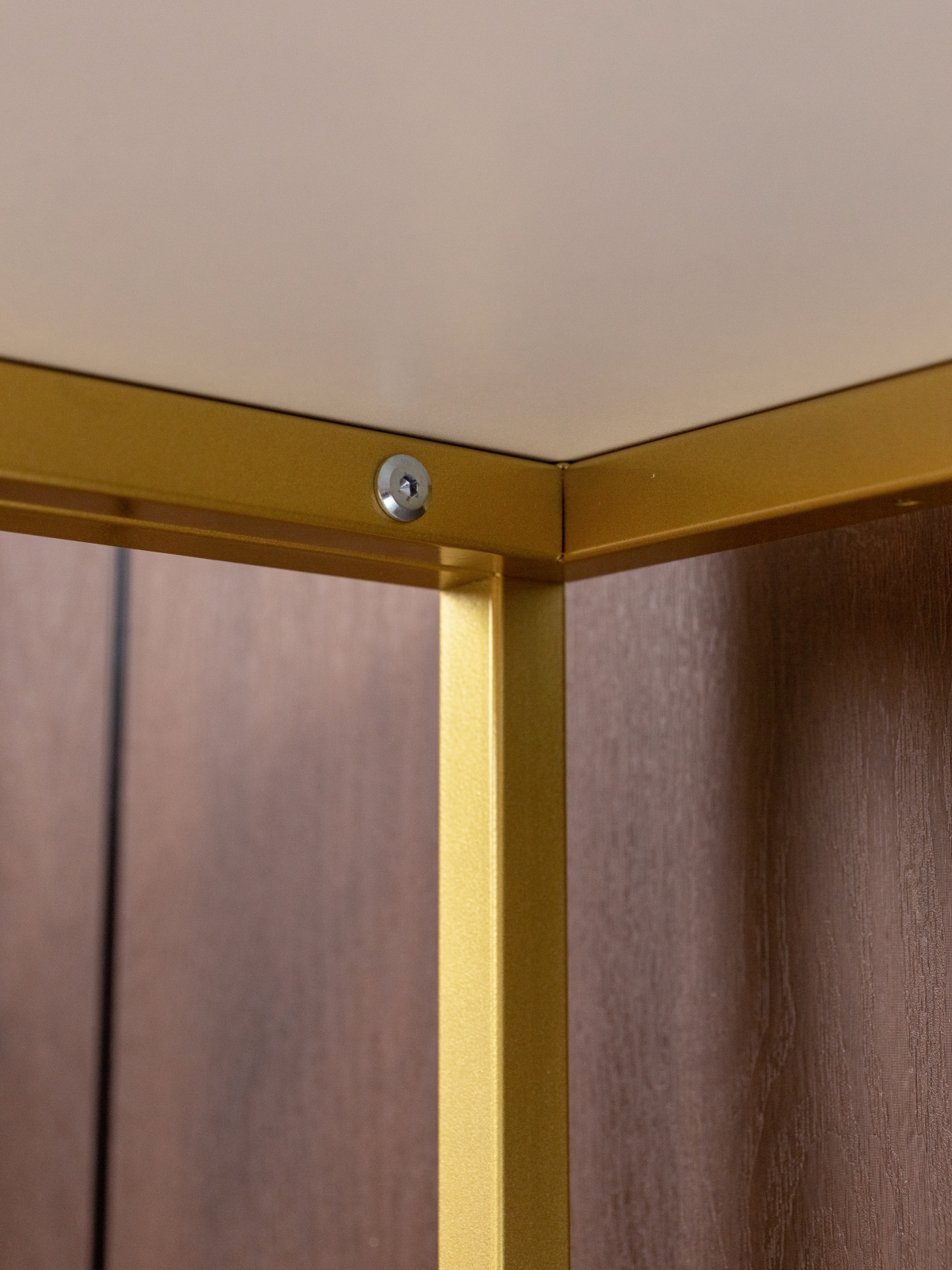 Золотой цвет каркаса добавляет нотку роскоши и утонченности, придавая даже самым строгим и минималистичным интерьерам выразительность и тепло. Полки толщиной 16 мм выдерживают ежедневные нагрузки и подходят для размещения техники и элементов декора: свечей, ваз, комнатных растений.