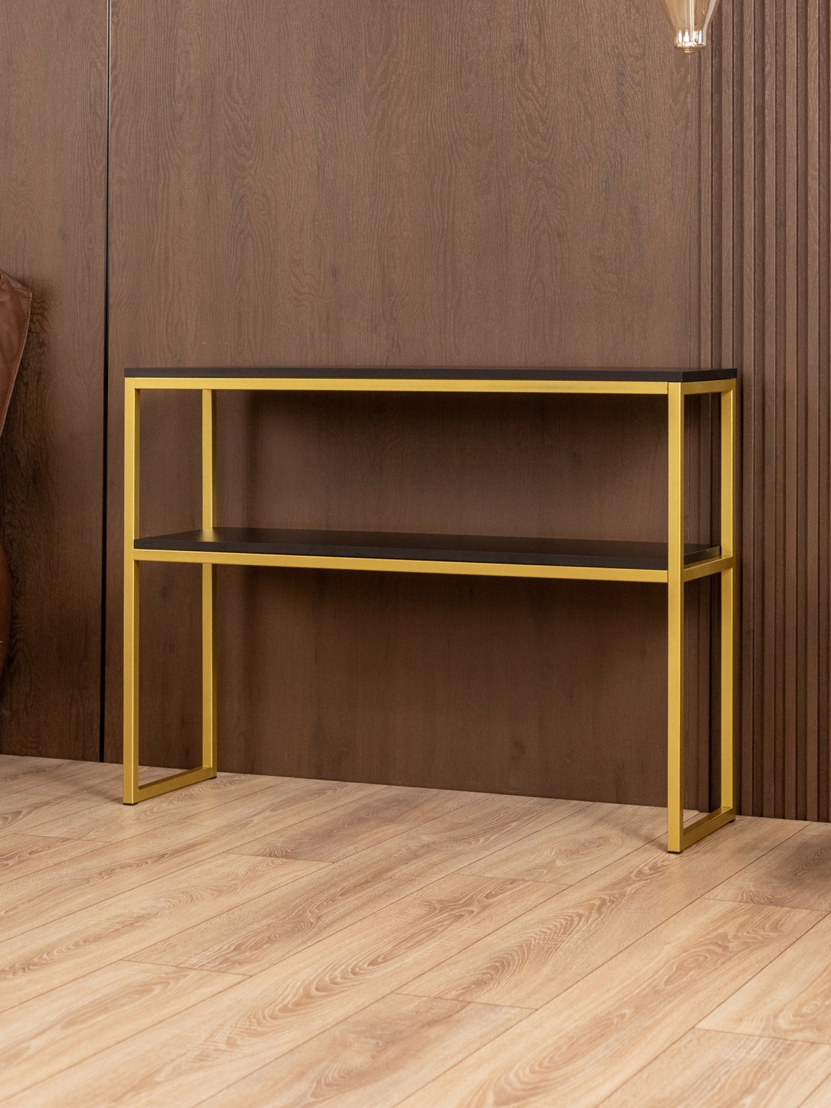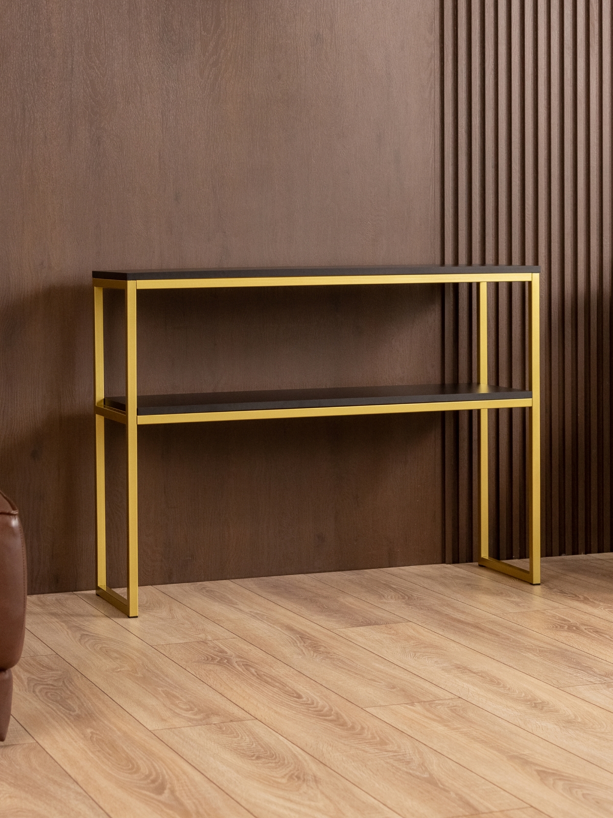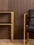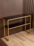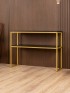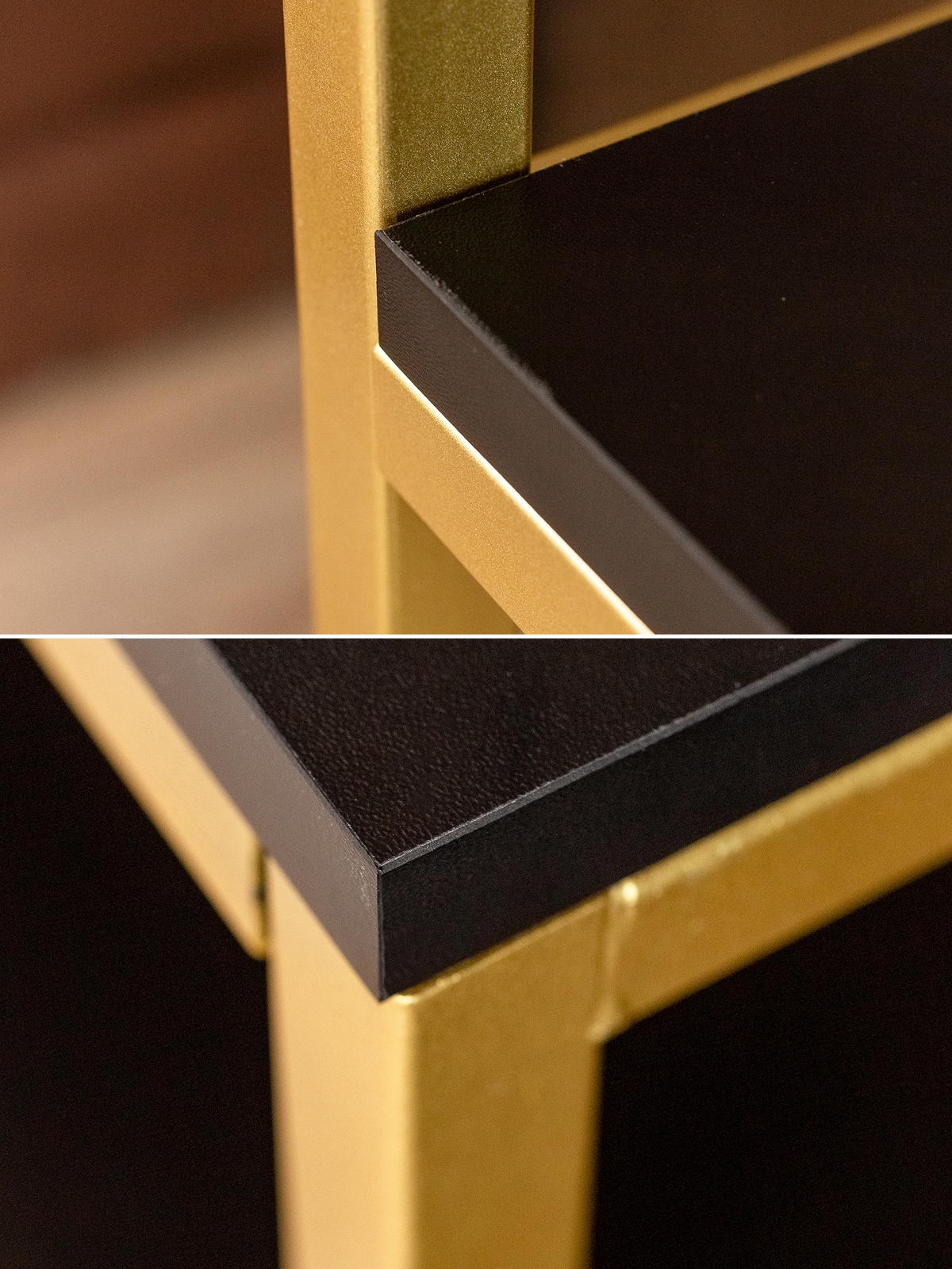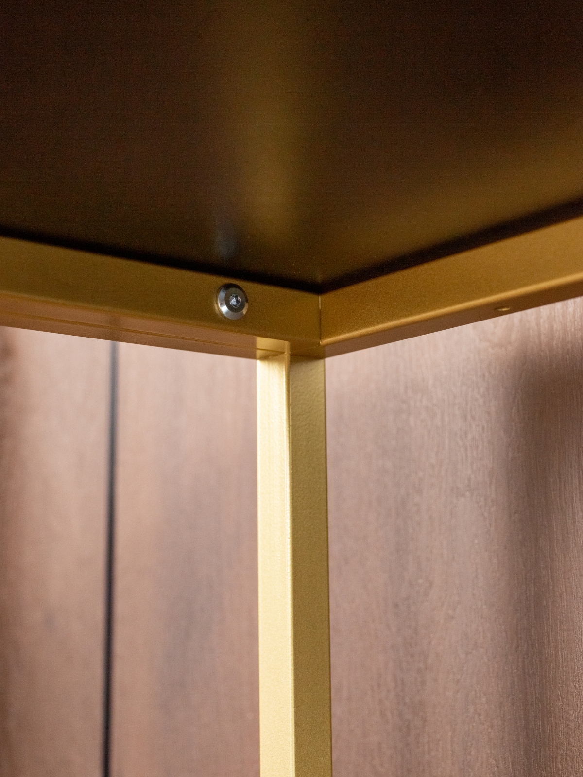 Золотой цвет каркаса добавляет нотку роскоши и утонченности, придавая даже самым строгим и минималистичным интерьерам выразительность и тепло. Полки толщиной 16 мм выдерживают ежедневные нагрузки и подходят для размещения техники и элементов декора: свечей, ваз, комнатных растений.