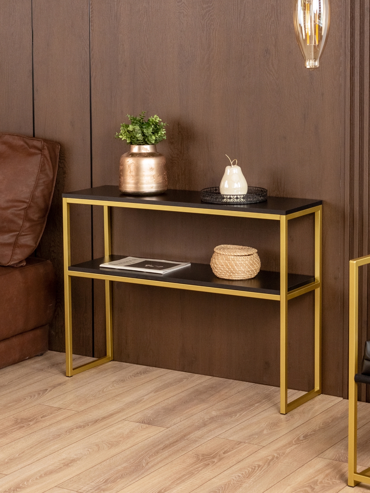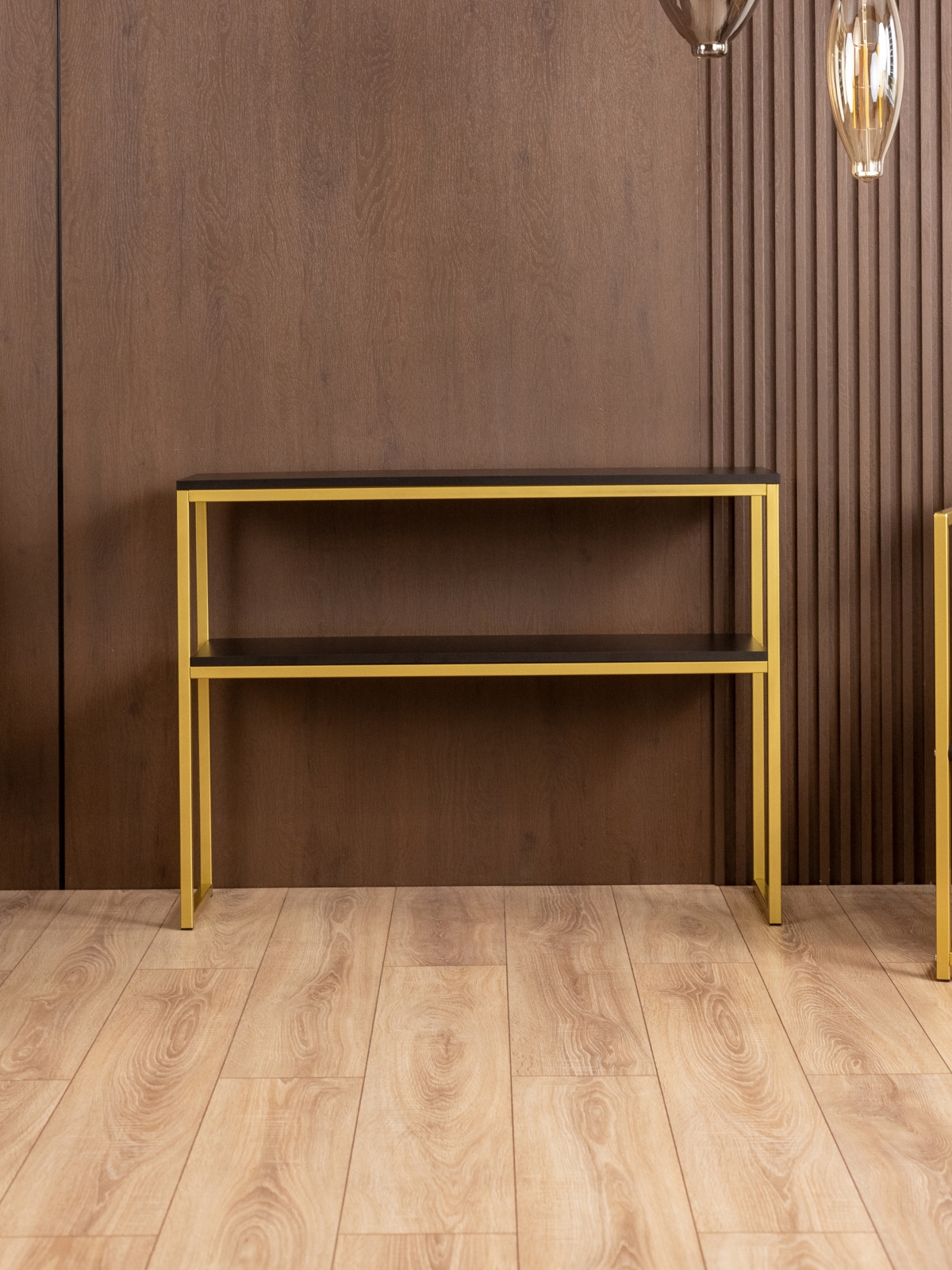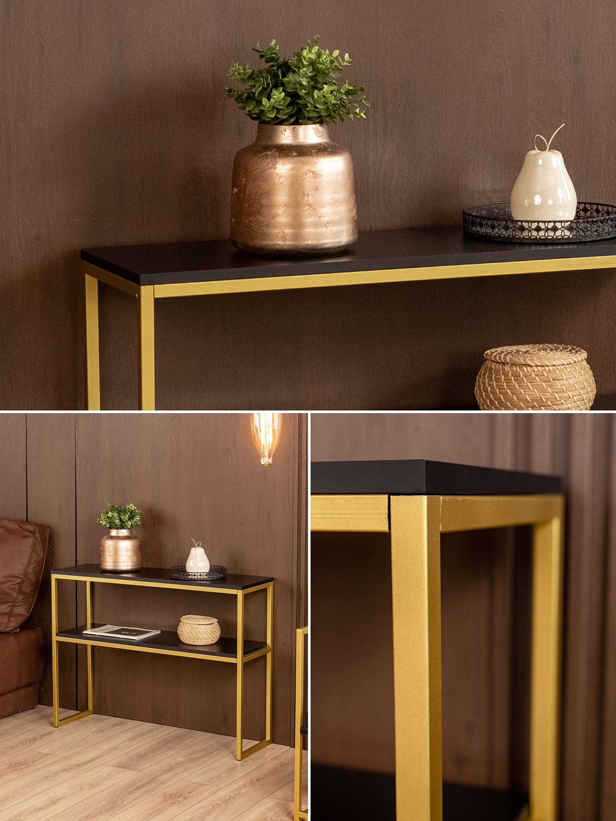 Золотой цвет каркаса добавляет нотку роскоши и утонченности, придавая даже самым строгим и минималистичным интерьерам выразительность и тепло. Полки толщиной 16 мм выдерживают ежедневные нагрузки и подходят для размещения техники и элементов декора: свечей, ваз, комнатных растений.