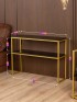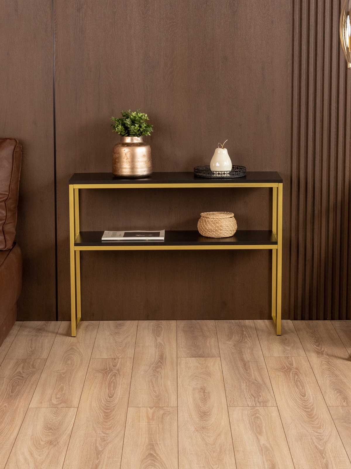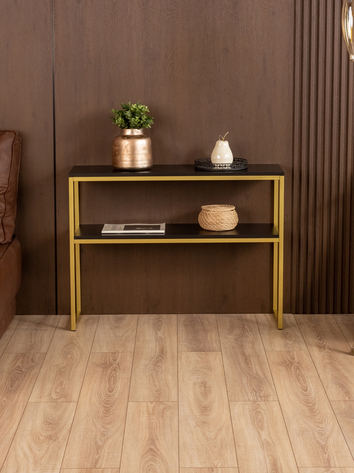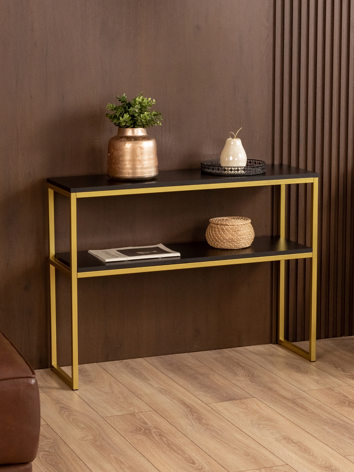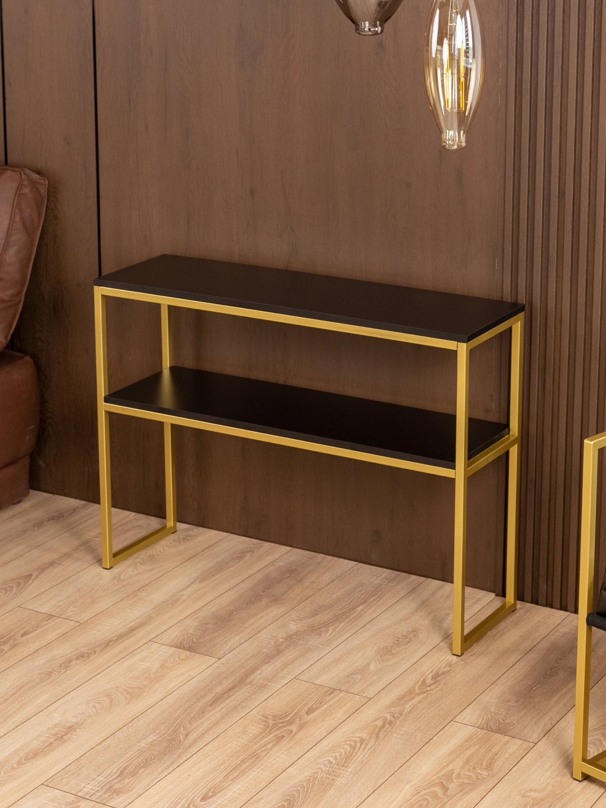 Золотой цвет каркаса добавляет нотку роскоши и утонченности, придавая даже самым строгим и минималистичным интерьерам выразительность и тепло. Полки толщиной 16 мм выдерживают ежедневные нагрузки и подходят для размещения техники и элементов декора: свечей, ваз, комнатных растений.