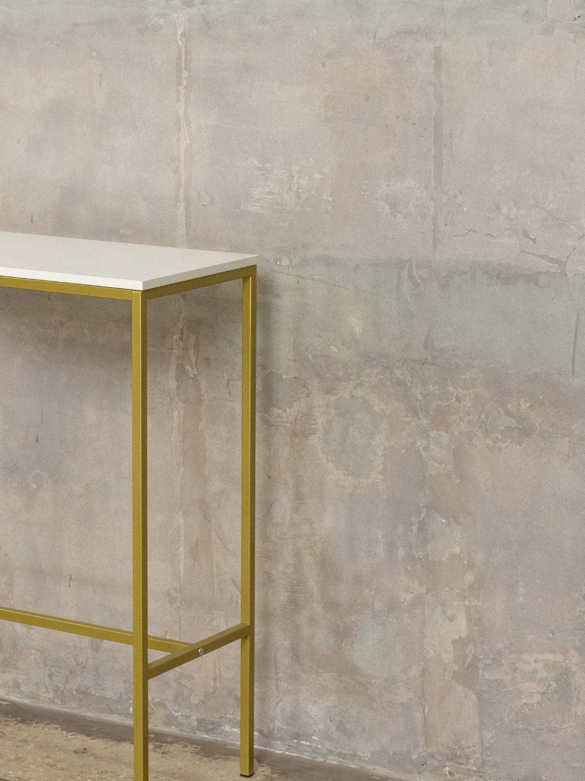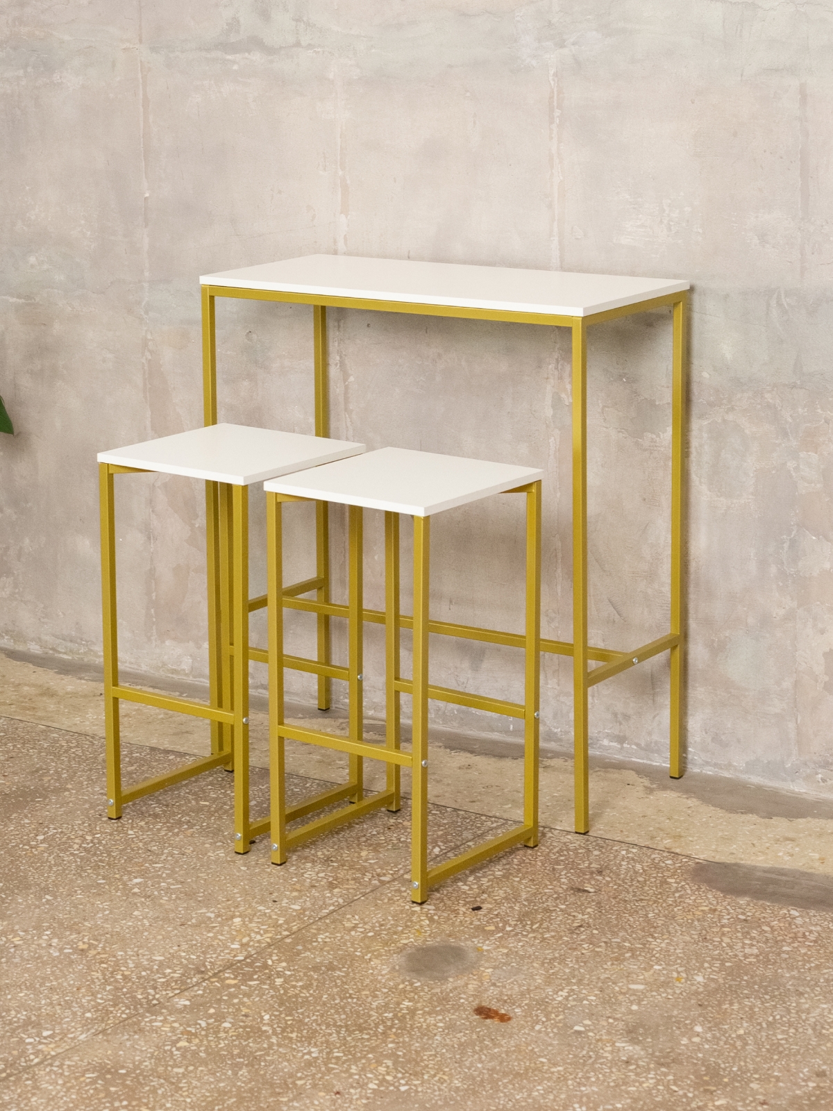 Барный столик «Канго» в стиле лофт — функциональный и эргономичный элемент для кухни, гостиной или кафе. Модель отличается прочным металлическим каркасом, окрашенным порошковой краской в золотой цвет, который придает интерьеру тепло, шик и изысканность. Цвет равномерный, без капель и потеков, что подчеркивает аккуратную эстетику мебели. Такой дизайн создает контраст между индустриальной грубостью и гламуром, добавляя пространству атмосферу эксклюзивности и роскоши.