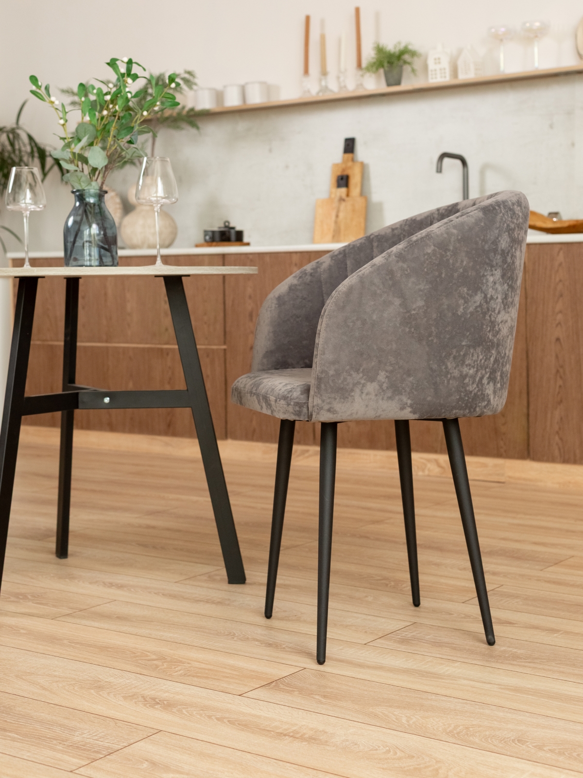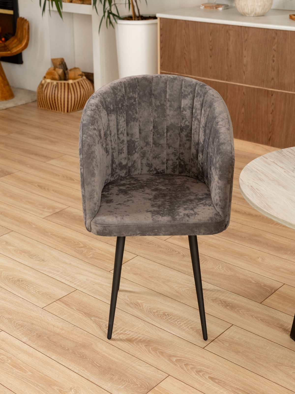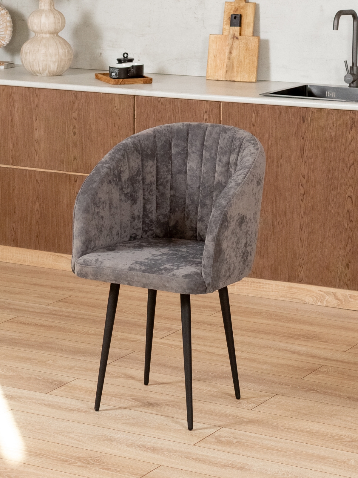 Дизайнерский мягкий стул Карибу станет стильным акцентом на кухне, в обеденной зоне или гостиной. Кресло с мягким сидением и спинкой, плавно переходящей в подлокотники, выполнено в современном стиле лофт. Отлично сочетается с темными акцентами в интерьере: фурнитурой кухонного гарнитура, бытовой техникой, светильниками и спотами. Черные матовые металлические ножки обеспечивают устойчивость и долговечность. Мягкая часть выполнена из бархатистого велюра с краш-эффектом в элегантной цветовой гамме. Есть такая же модель стульев, но в обивке из экокожи. Благодаря глубокой посадке и плавным линиям полукресло дарит ощущение уюта, что делает его идеальным для длительного отдыха. Декоративная вертикальная прострочка на внутренней части спинки подчеркивает изысканный внешний вид и добавляет современности.