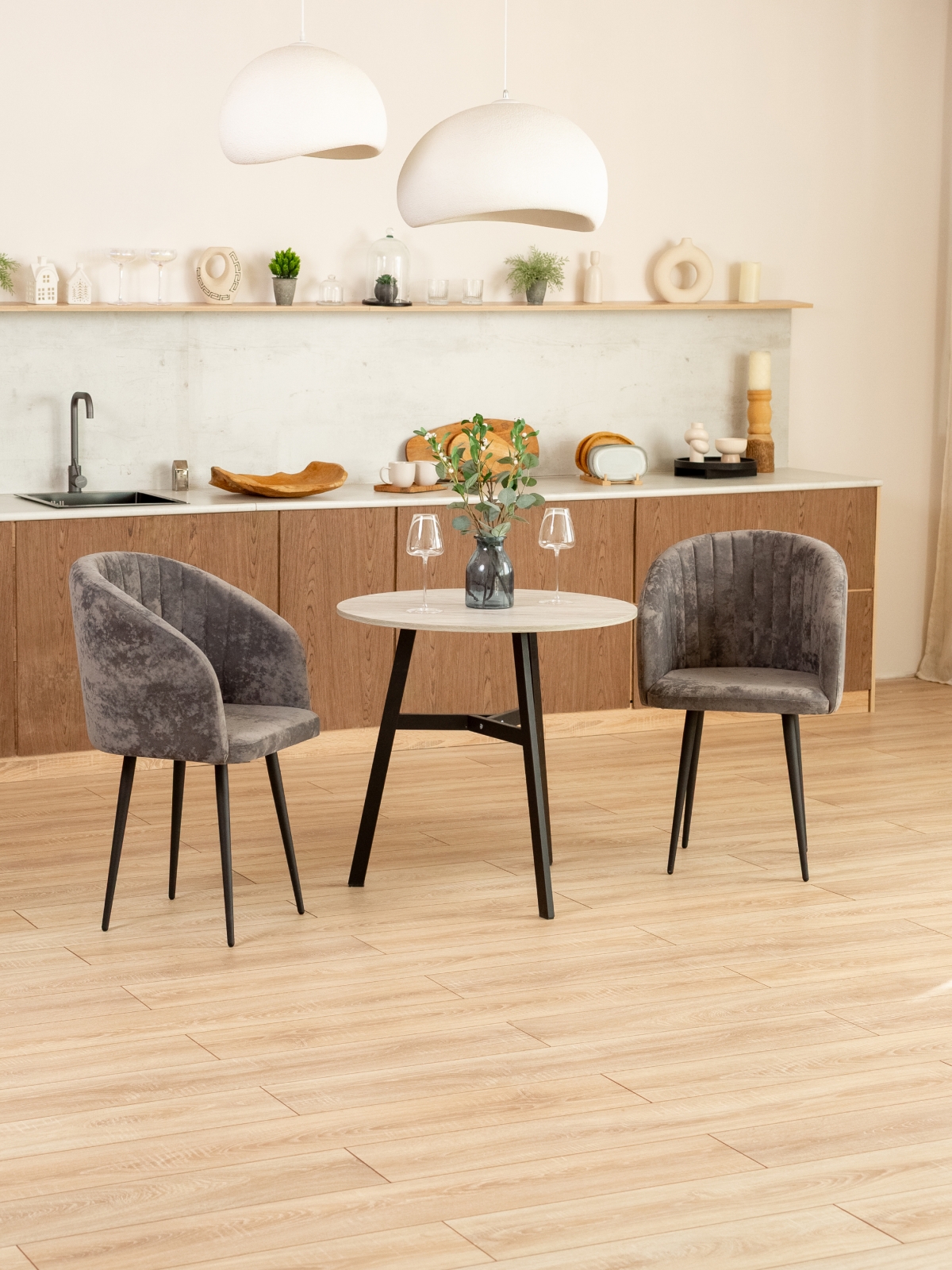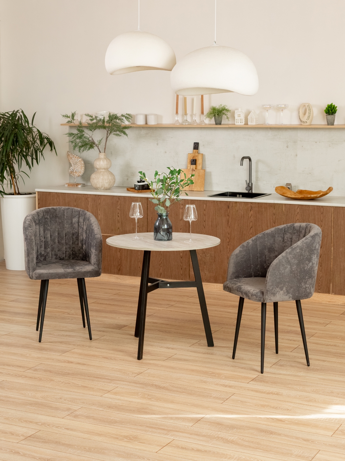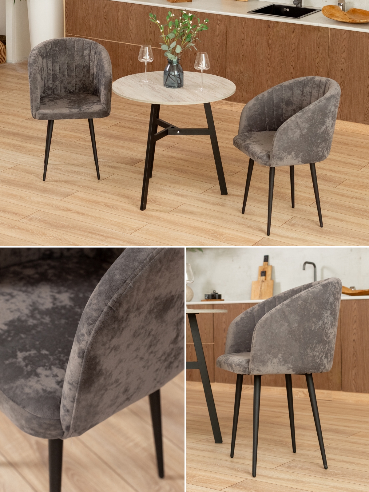 Дизайнерский мягкий стул Карибу станет стильным акцентом на кухне, в обеденной зоне или гостиной. Кресло с мягким сидением и спинкой, плавно переходящей в подлокотники, выполнено в современном стиле лофт. Отлично сочетается с темными акцентами в интерьере: фурнитурой кухонного гарнитура, бытовой техникой, светильниками и спотами. Черные матовые металлические ножки обеспечивают устойчивость и долговечность. Мягкая часть выполнена из бархатистого велюра с краш-эффектом в элегантной цветовой гамме. Есть такая же модель стульев, но в обивке из экокожи. Благодаря глубокой посадке и плавным линиям полукресло дарит ощущение уюта, что делает его идеальным для длительного отдыха. Декоративная вертикальная прострочка на внутренней части спинки подчеркивает изысканный внешний вид и добавляет современности.