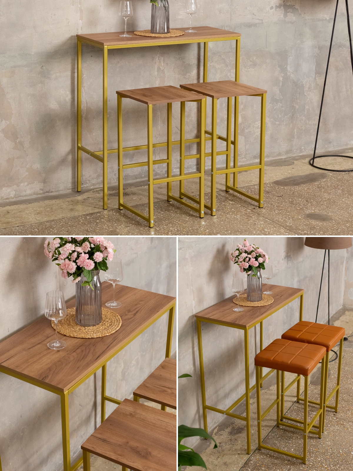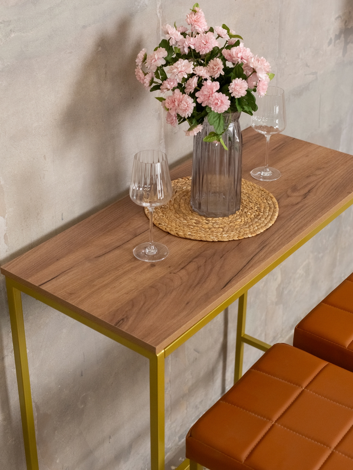 Дизайн изделия создан с акцентом на glam-лофт — сочетание индустриальной строгости и утонченной роскоши. Такой барный стол используется в кафе, барах, домашних студиях и даже на балконах. Компактная форма и продуманная эргономика позволяют эффективно организовать пространство, обеспечивая максимум комфорта для общения, завтраков, работы или отдыха.