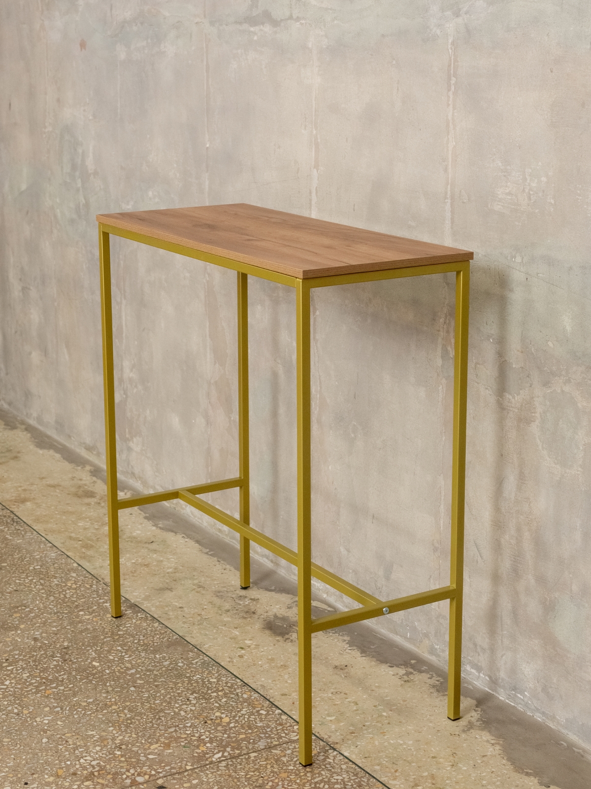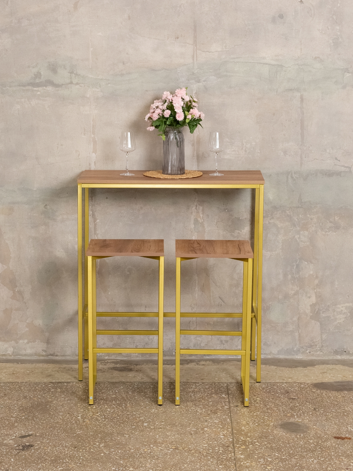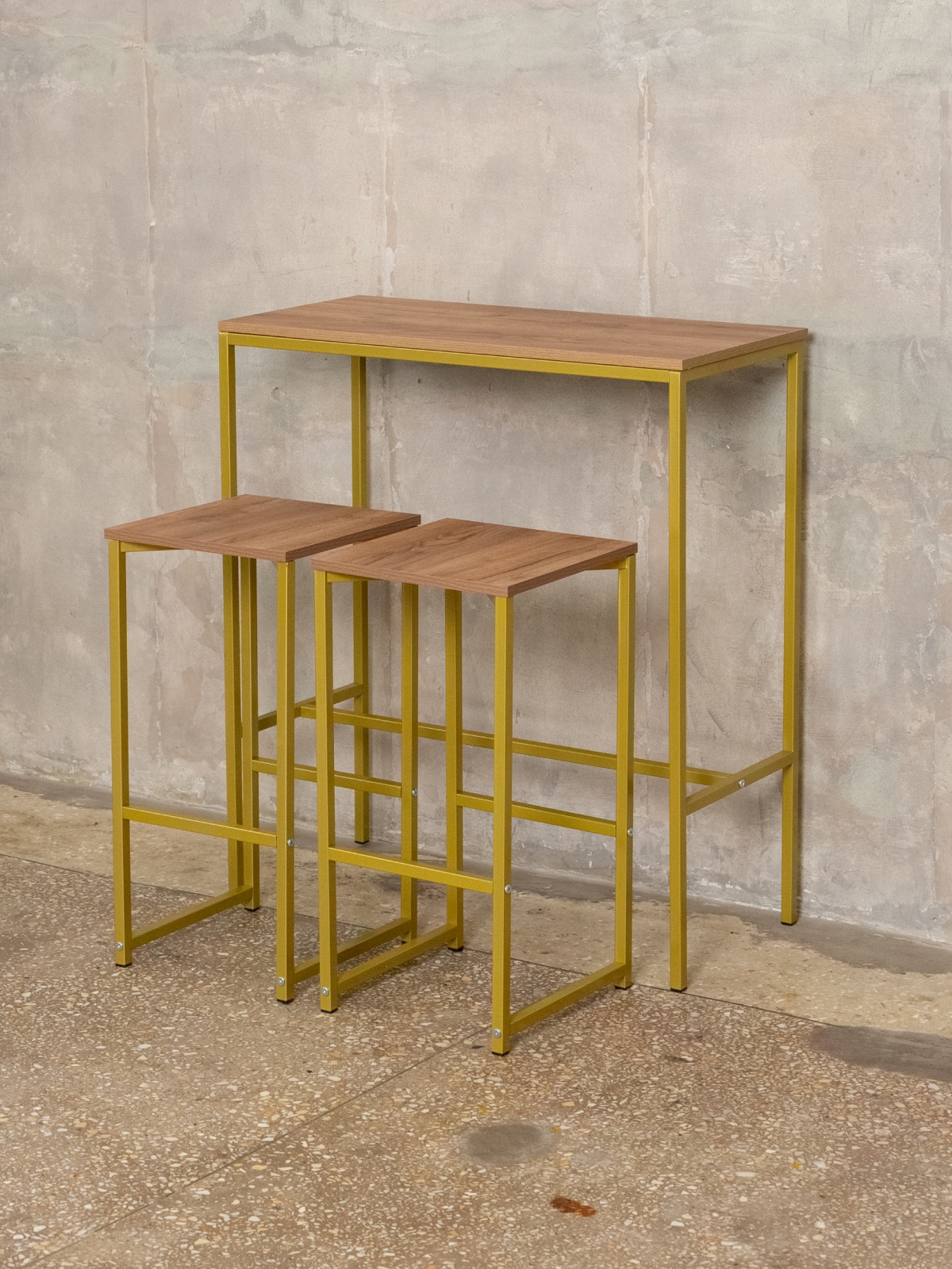 Барный столик «Канго» в стиле лофт — функциональный и эргономичный элемент для кухни, гостиной или кафе. Модель отличается прочным металлическим каркасом, окрашенным порошковой краской в золотой цвет, который придает интерьеру тепло, шик и изысканность. Цвет равномерный, без капель и потеков, что подчеркивает аккуратную эстетику мебели. Такой дизайн создает контраст между индустриальной грубостью и гламуром, добавляя пространству атмосферу эксклюзивности и роскоши.