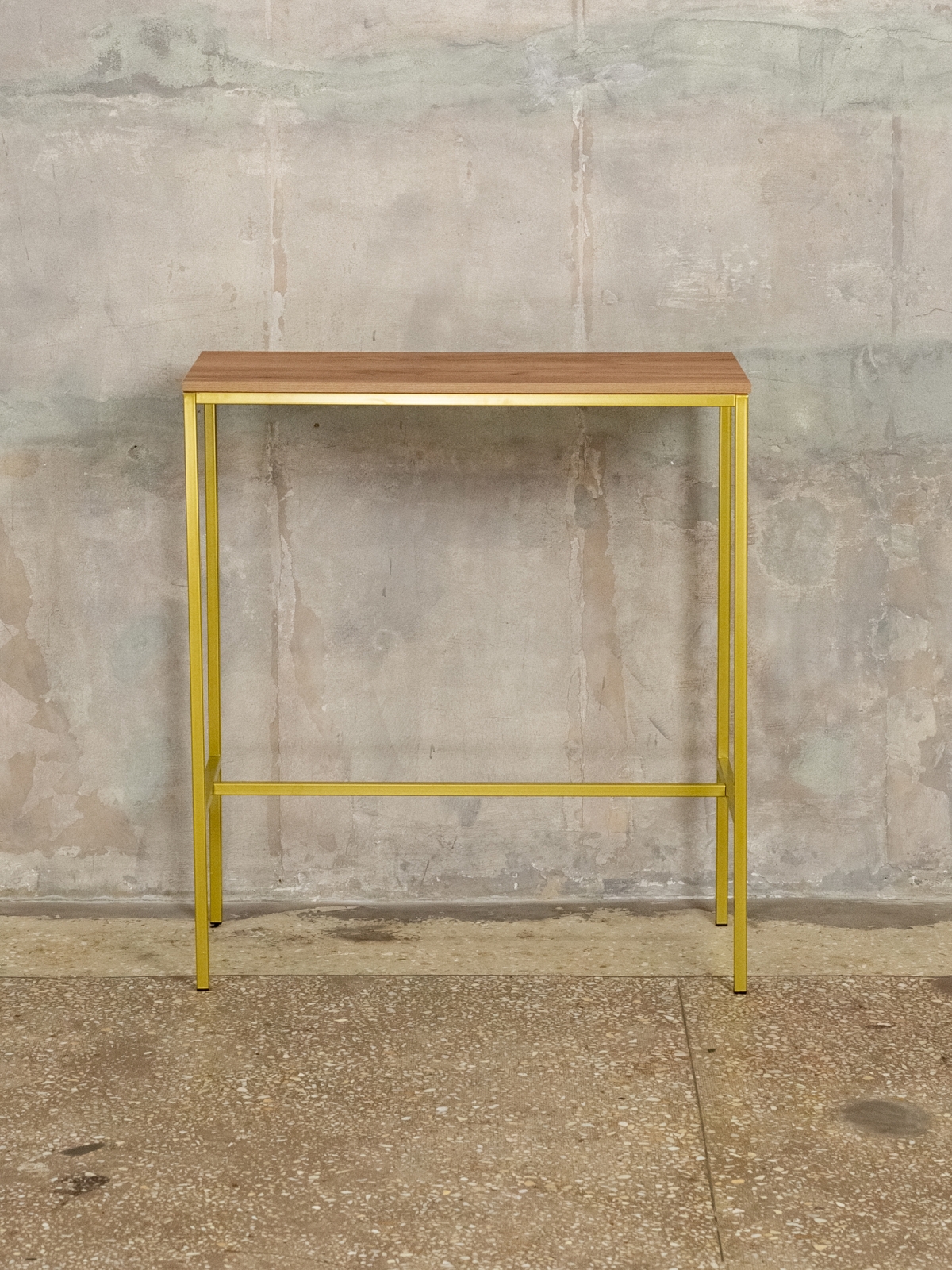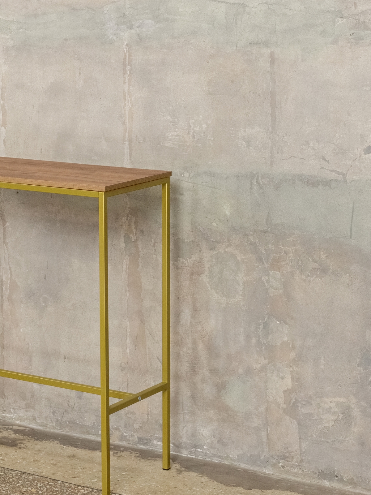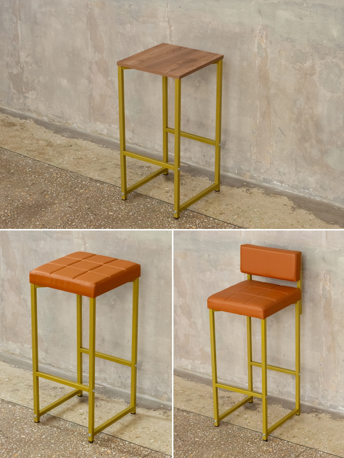 Барный столик «Канго» в стиле лофт — функциональный и эргономичный элемент для кухни, гостиной или кафе. Модель отличается прочным металлическим каркасом, окрашенным порошковой краской в золотой цвет, который придает интерьеру тепло, шик и изысканность. Цвет равномерный, без капель и потеков, что подчеркивает аккуратную эстетику мебели. Такой дизайн создает контраст между индустриальной грубостью и гламуром, добавляя пространству атмосферу эксклюзивности и роскоши.