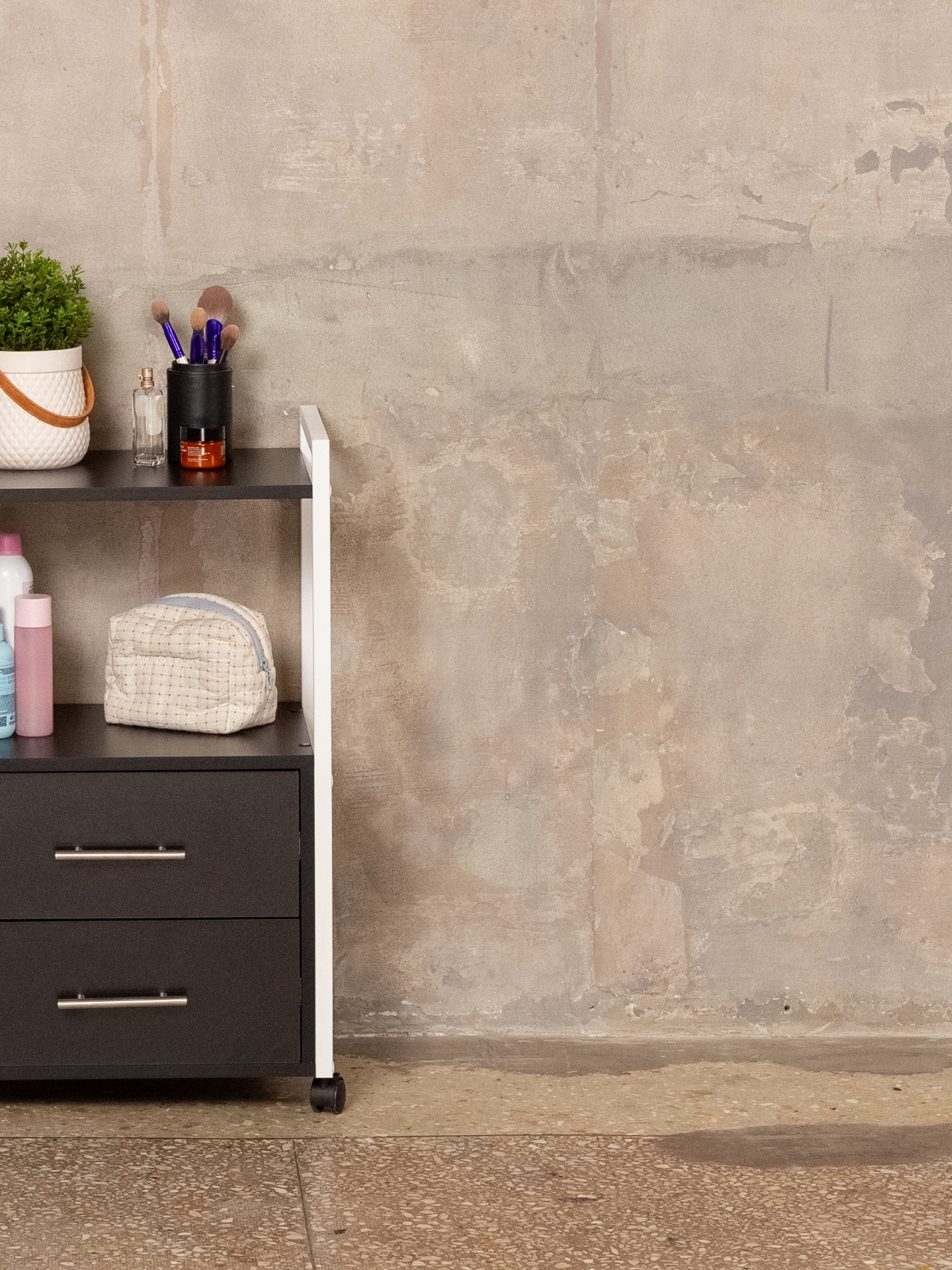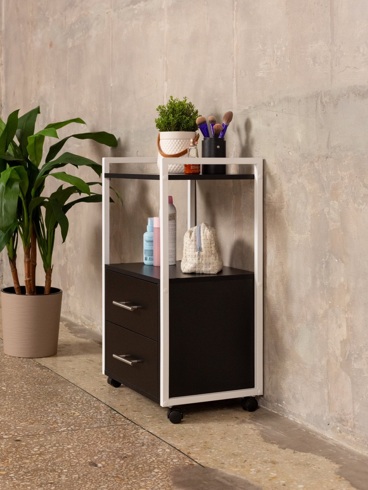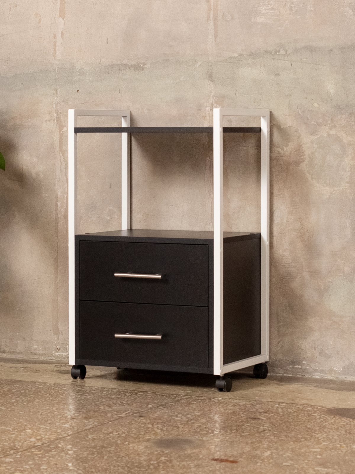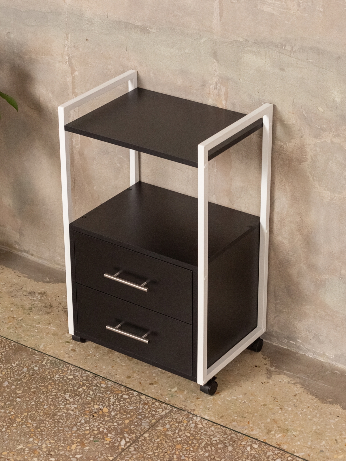 Тумба-этажерка — это решение для тех, кто ценит мобильность и порядок. Конструкция продумана для максимального удобства: два вместительных ящика на шариковых направляющих позволяют хранить инструменты, косметику, аппараты, расходники для маникюра, педикюра, наращивания ресниц, а также различную бытовую мелочь. Полки открытого типа дают возможность держать под рукой все самое необходимое для работы мастера или организации хранения дома. Верхняя полка отлично подходит для размещения косметики, инструментов, органайзеров, а нижние ящики скрывают содержимое от посторонних глаз. Минималистичный дизайн мебели в стиле лофт гармонично дополнит офис, бьюти-зону, или даже кухню.