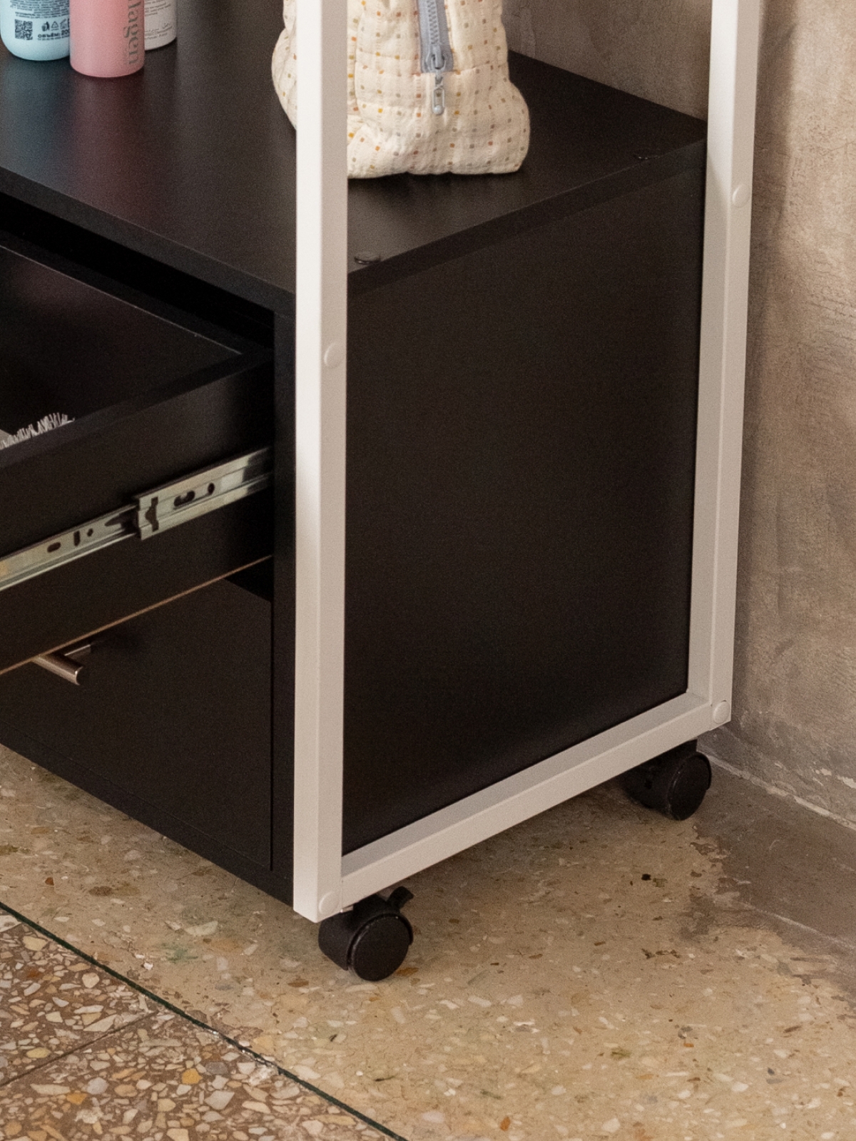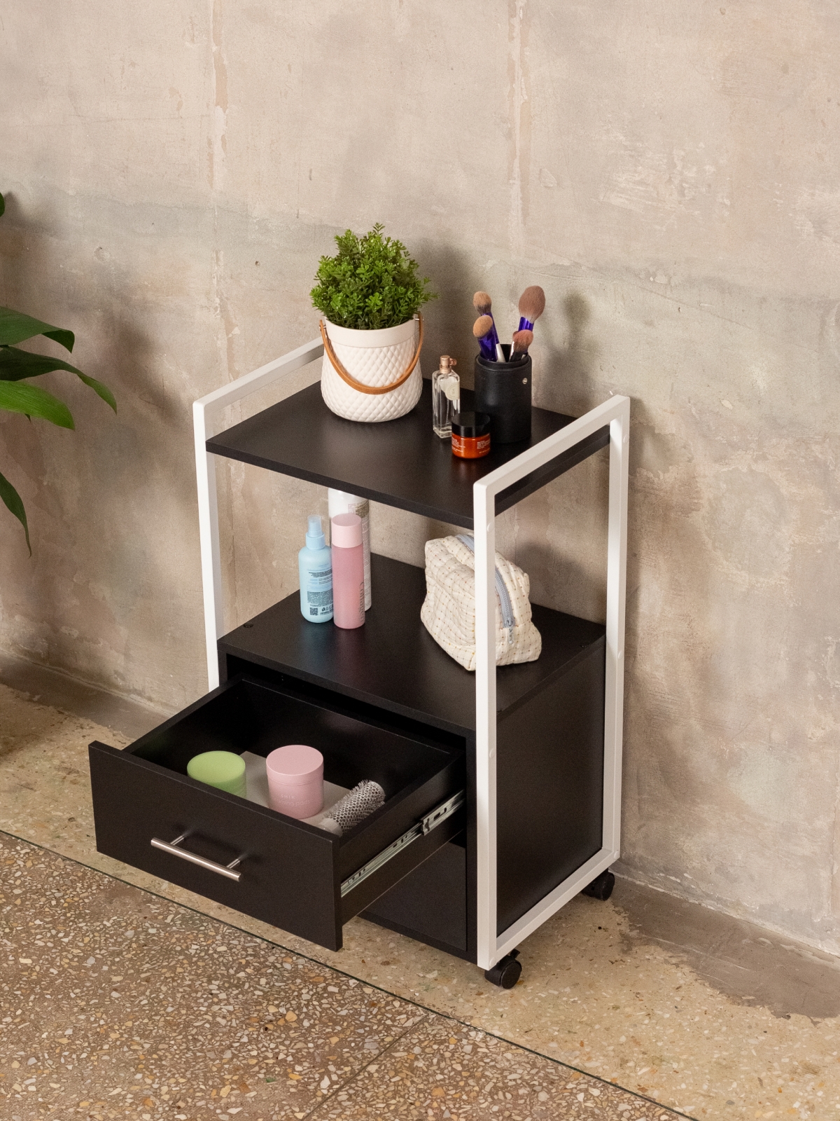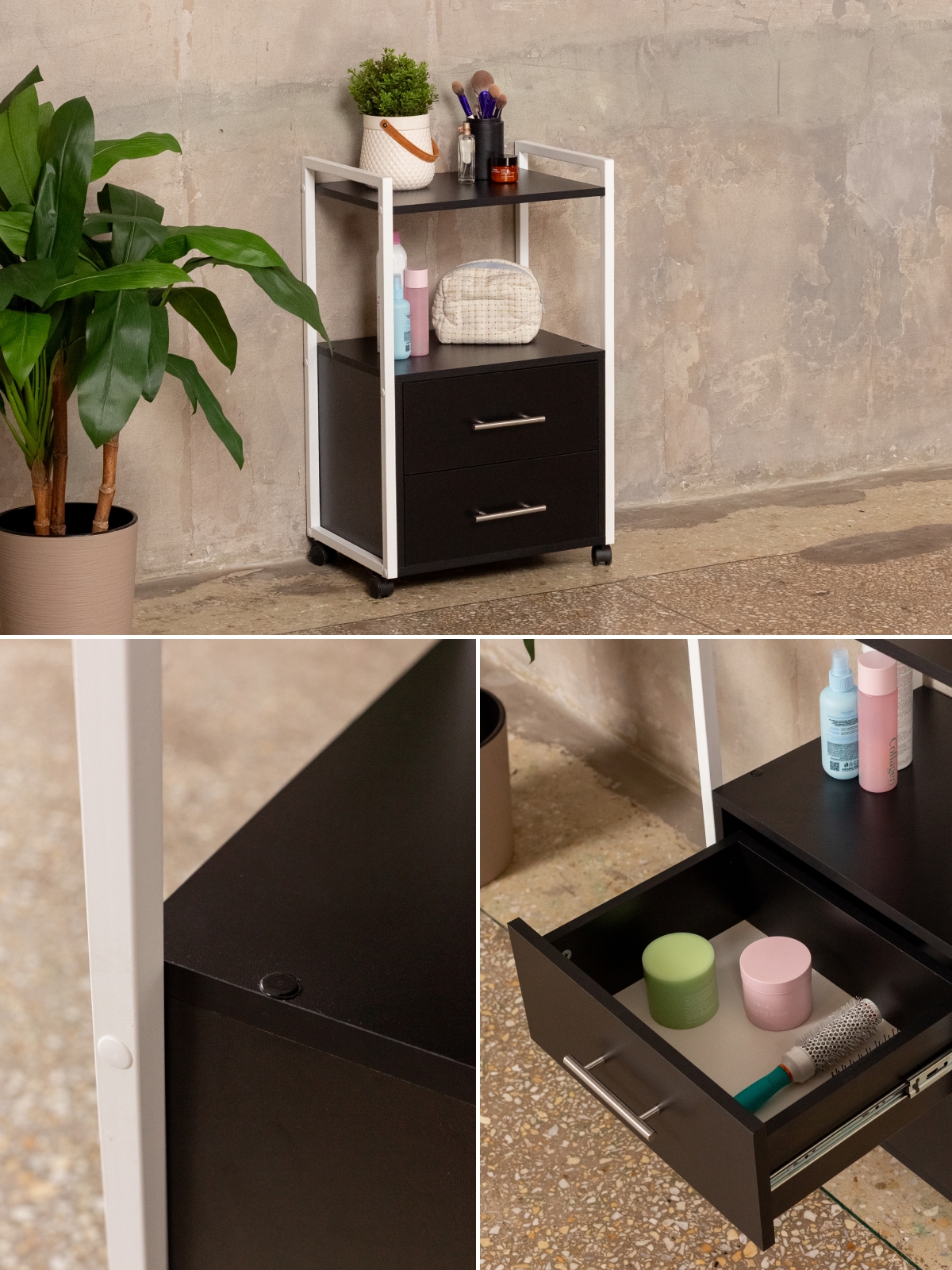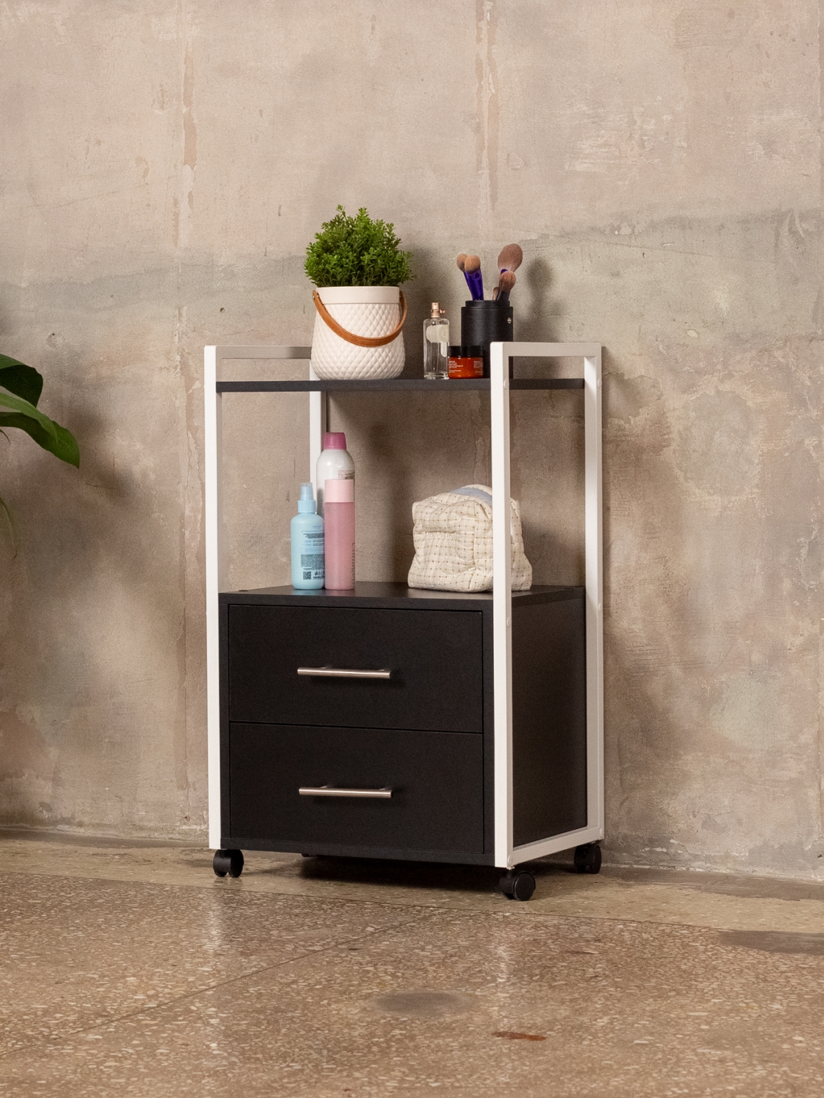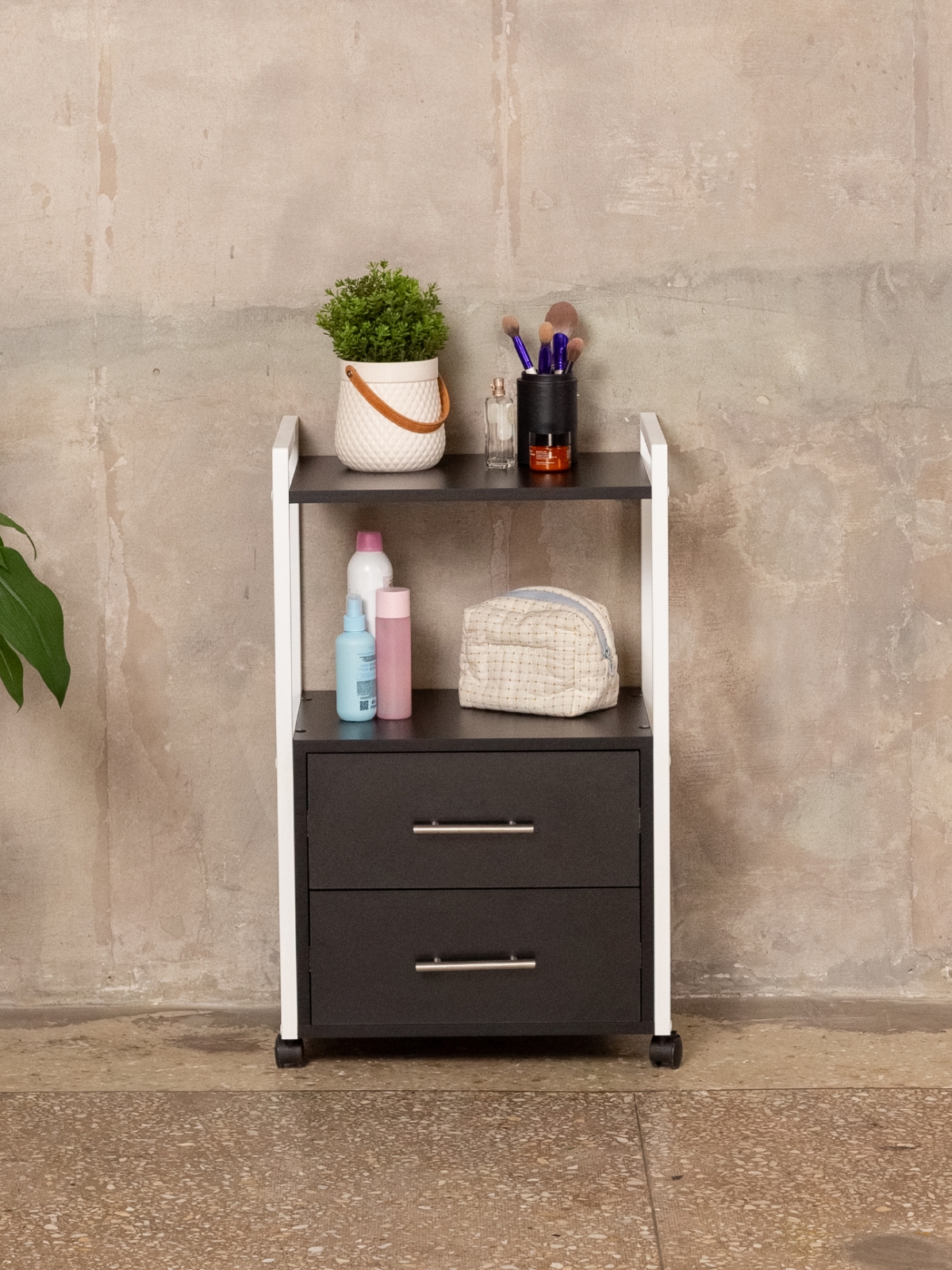 Тумба-этажерка — это решение для тех, кто ценит мобильность и порядок. Конструкция продумана для максимального удобства: два вместительных ящика на шариковых направляющих позволяют хранить инструменты, косметику, аппараты, расходники для маникюра, педикюра, наращивания ресниц, а также различную бытовую мелочь. Полки открытого типа дают возможность держать под рукой все самое необходимое для работы мастера или организации хранения дома. Верхняя полка отлично подходит для размещения косметики, инструментов, органайзеров, а нижние ящики скрывают содержимое от посторонних глаз. Минималистичный дизайн мебели в стиле лофт гармонично дополнит офис, бьюти-зону, или даже кухню.