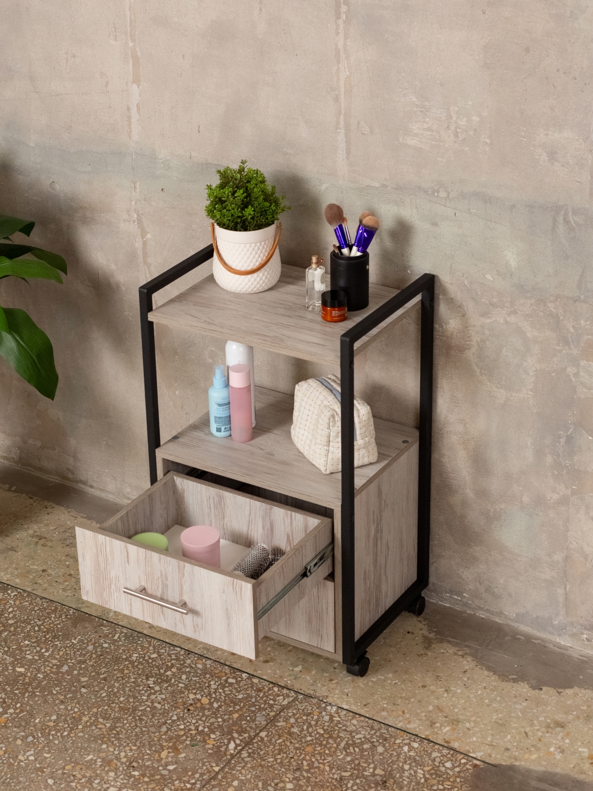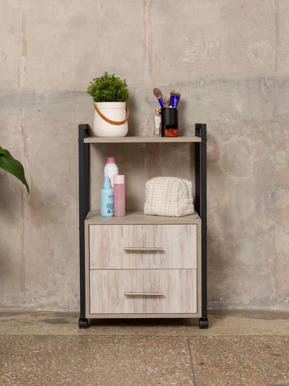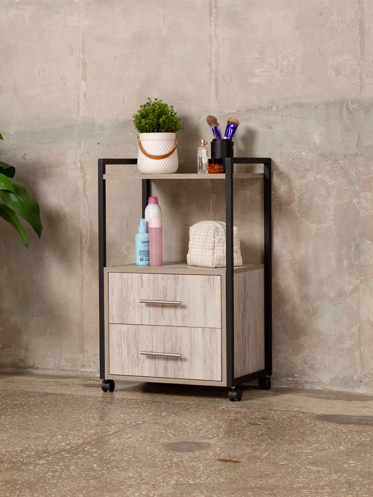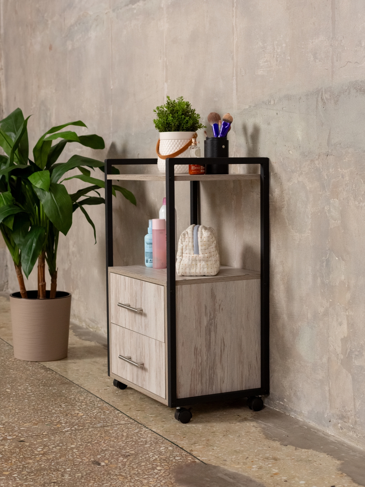 Конструкция из металлического каркаса черного цвета подчеркивает классический стиль лофт. Два ящика и полочки обеспечивают достаточно места для хранения косметических средств, расходников для маникюра и педикюра и других необходимых вещей. Открытые полки идеально подходят для быстрого доступа к часто используемым инструментам и аппаратам. Такая конструкция делает тележку универсальным решением — она прекрасно справится с ролью тумбочки в прихожей для хранения ключей и мелочей, прикроватной тумбы в спальне, этажерки под посуду и мелкую бытовую технику на кухне, либо как органайзер для ванной комнаты.Тележка «Кая» создана для тех, кто ценит мобильность и стиль, а также желает поддерживать идеальный порядок без лишних усилий.