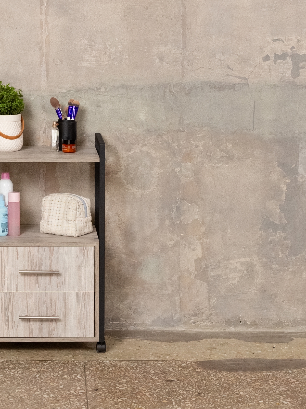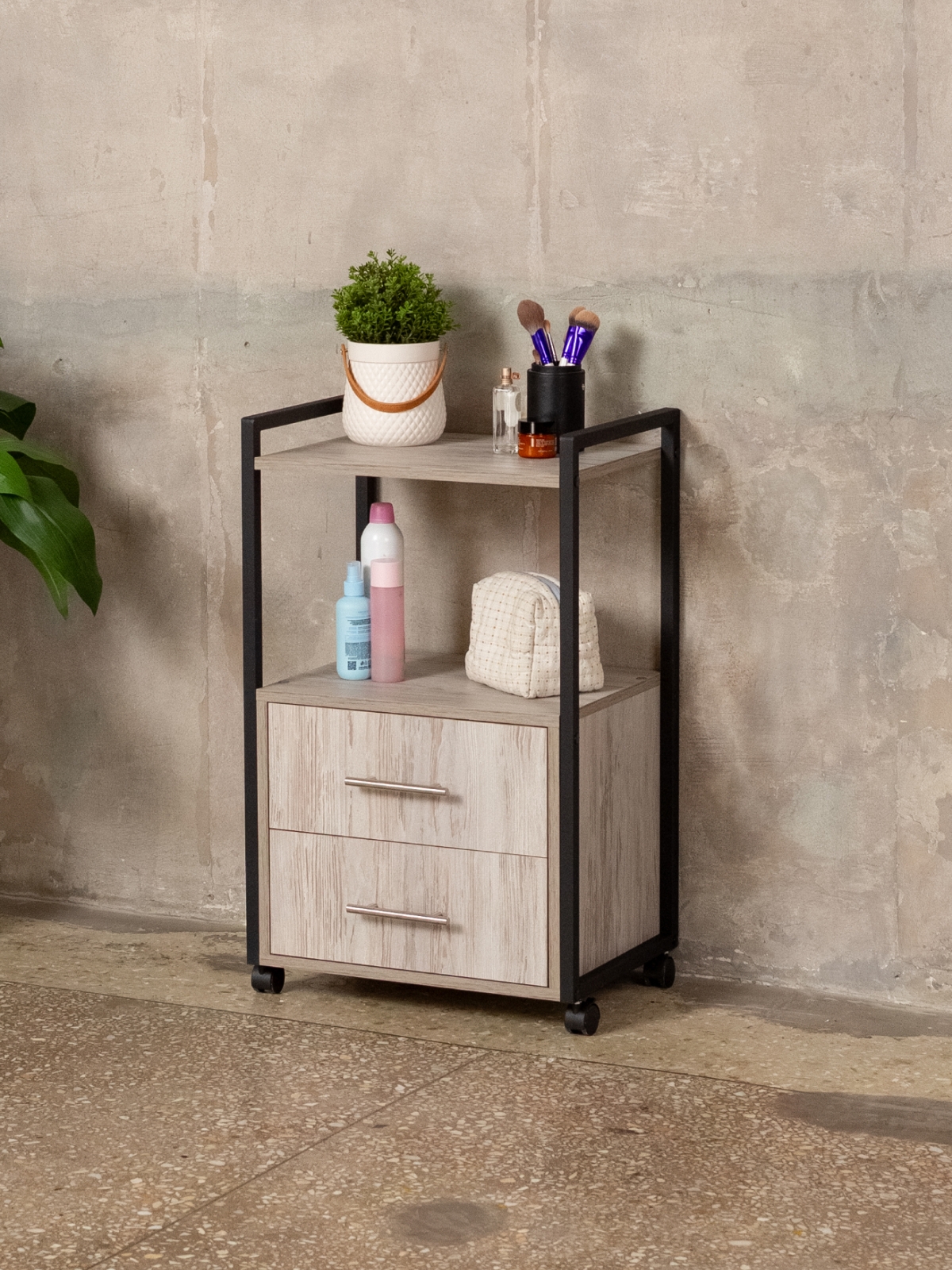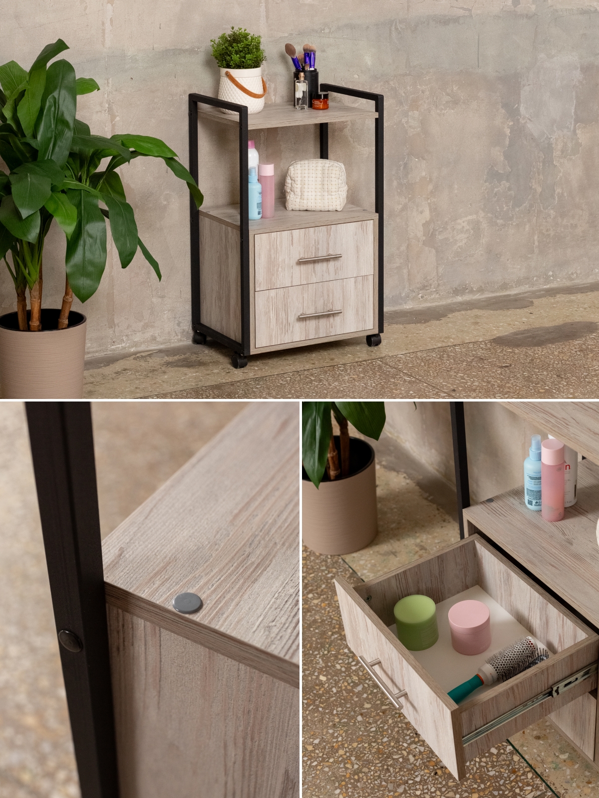 Косметологическая тележка «Кая» с двумя ящиками в стиле лофт — идеальная мобильная помощница для мастеров маникюра, педикюра, парикмахеров, лешмейкеров и бровистов, а также отличное решение для организации порядка в доме, офисе или салоне красоты. Лаконичный дизайн на металлическом каркасе создает эффектный контраст, который органично вписывается в любой интерьер. Этажерка на колесиках оснащена двумя вместительными ящиками, которые надежно скроют все мелочи от посторонних глаз, а две открытые полки позволяют держать под рукой нужное. Тележка идеально подходит для хранения инструментов, косметики, аппаратов для педикюра и маникюра, расходных материалов для наращивания ресниц.