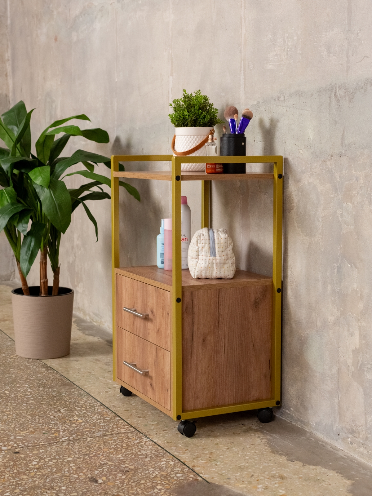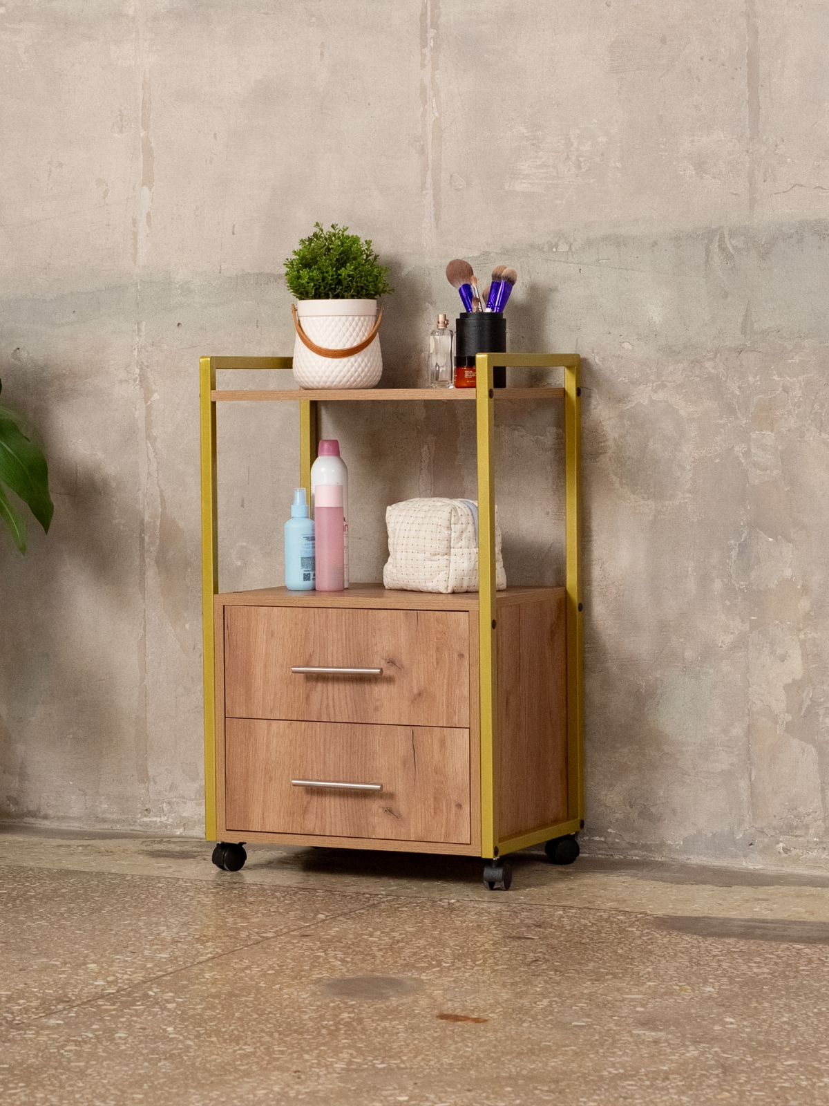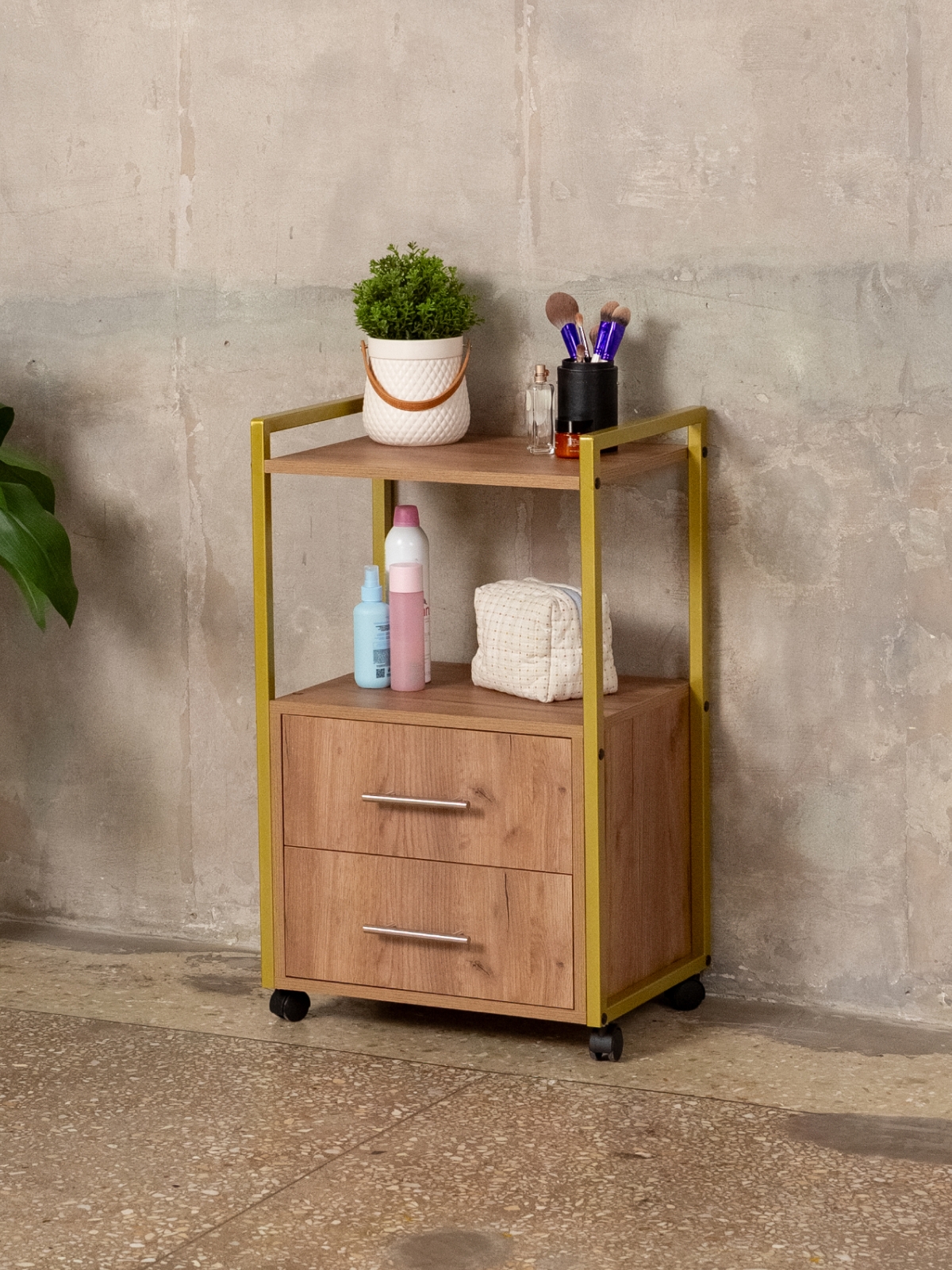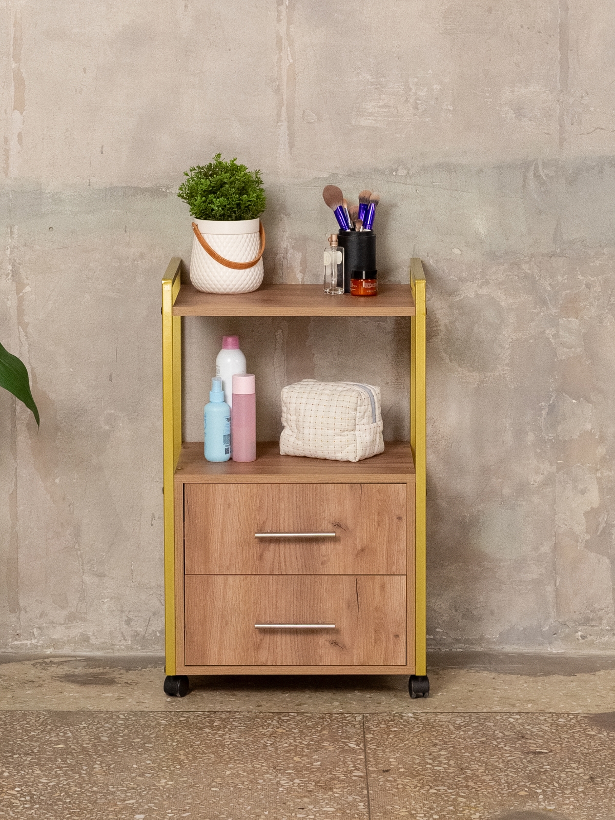 Минималистичный дизайн тумбы-этажерки «Кая» органично смотрится в разных интерьерах: от бьюти-студий, косметологических кабинетов, парикмахерских и до офисных пространств. Золотой металлический каркас подчеркивает изысканность, светлые оттенки ЛДСП визуально расширяют пространство, а темные выделят эту мебель, превратив её в гламурный акцент. Такой органайзер легко впишется в любое помещение — будь то кабинет маникюрного мастера, студия лешмейкера или спальня. Ящики с удобными ручками легко выдвигаются, предоставляя доступ к инструментам и аксессуарам. Открытые полки идеально подходят для косметических средств, полотенец, косметологического аппарата, офисных бумаг или даже посуды на кухне.