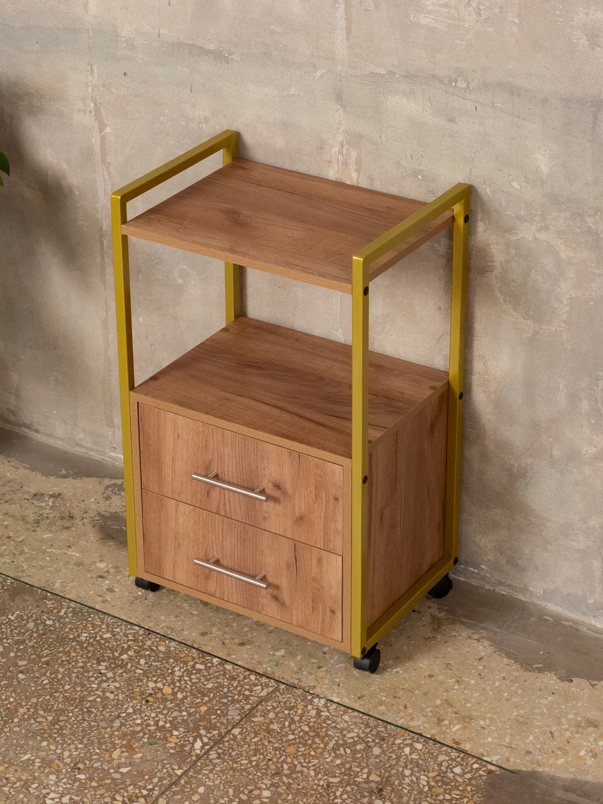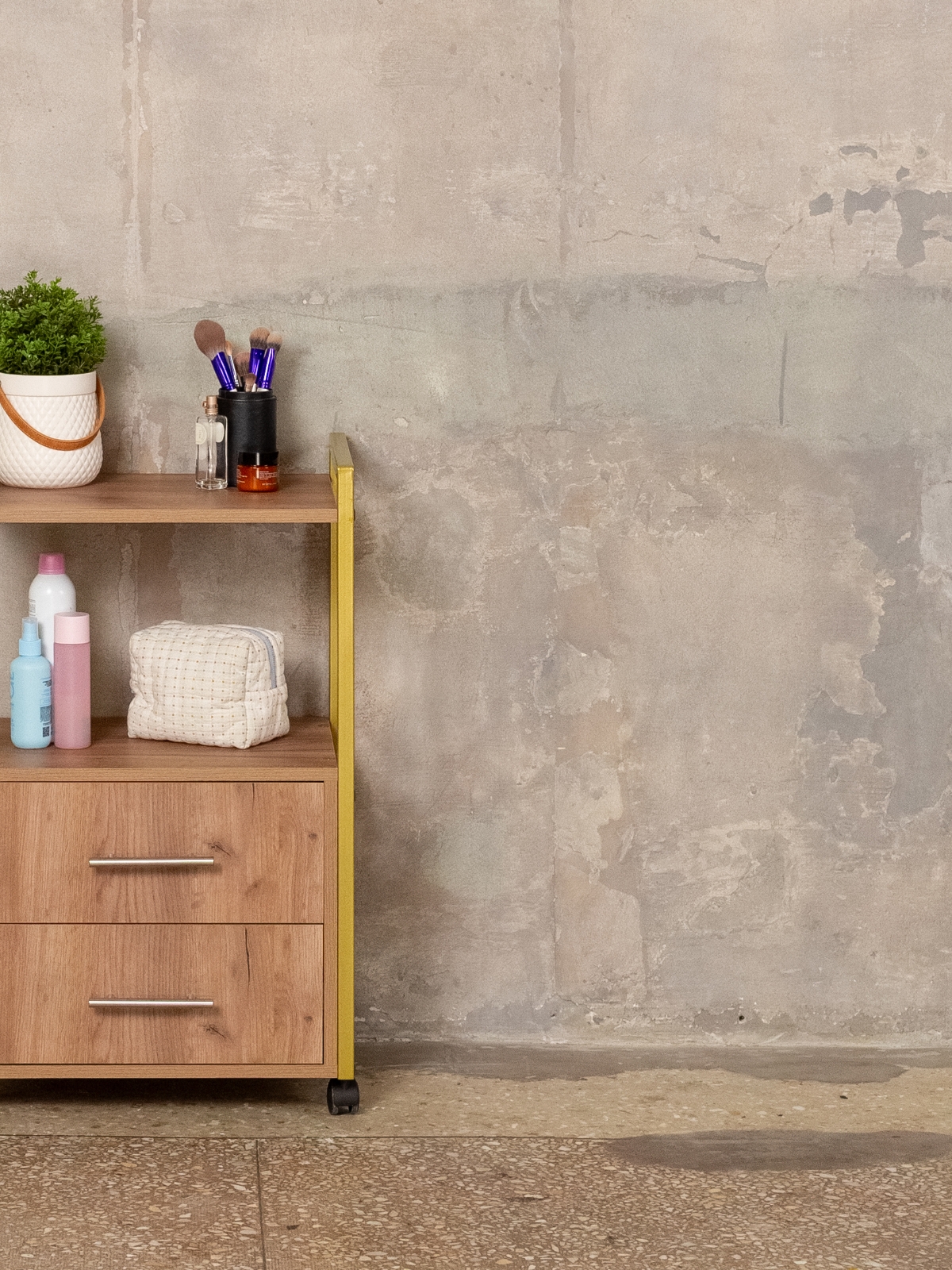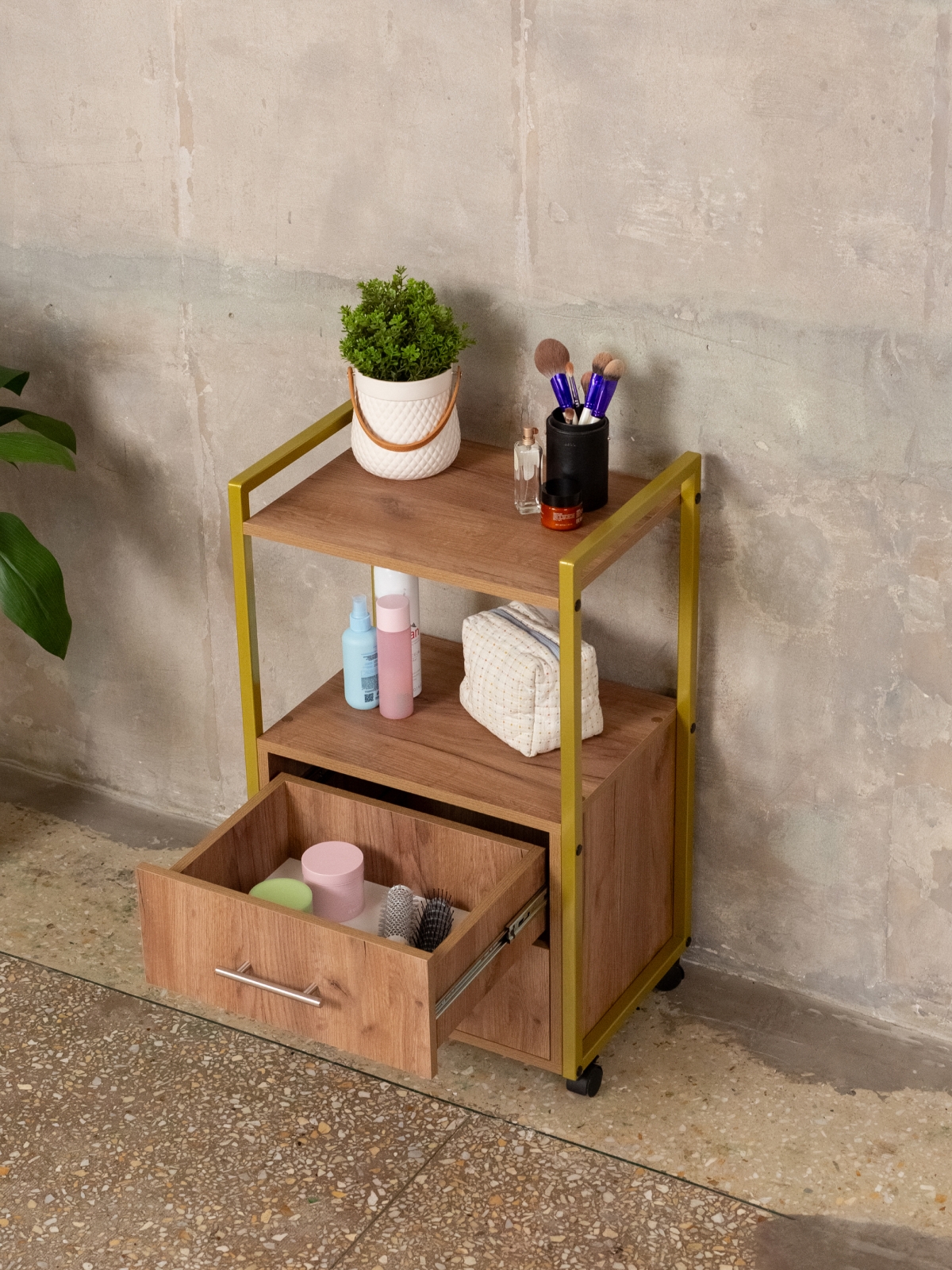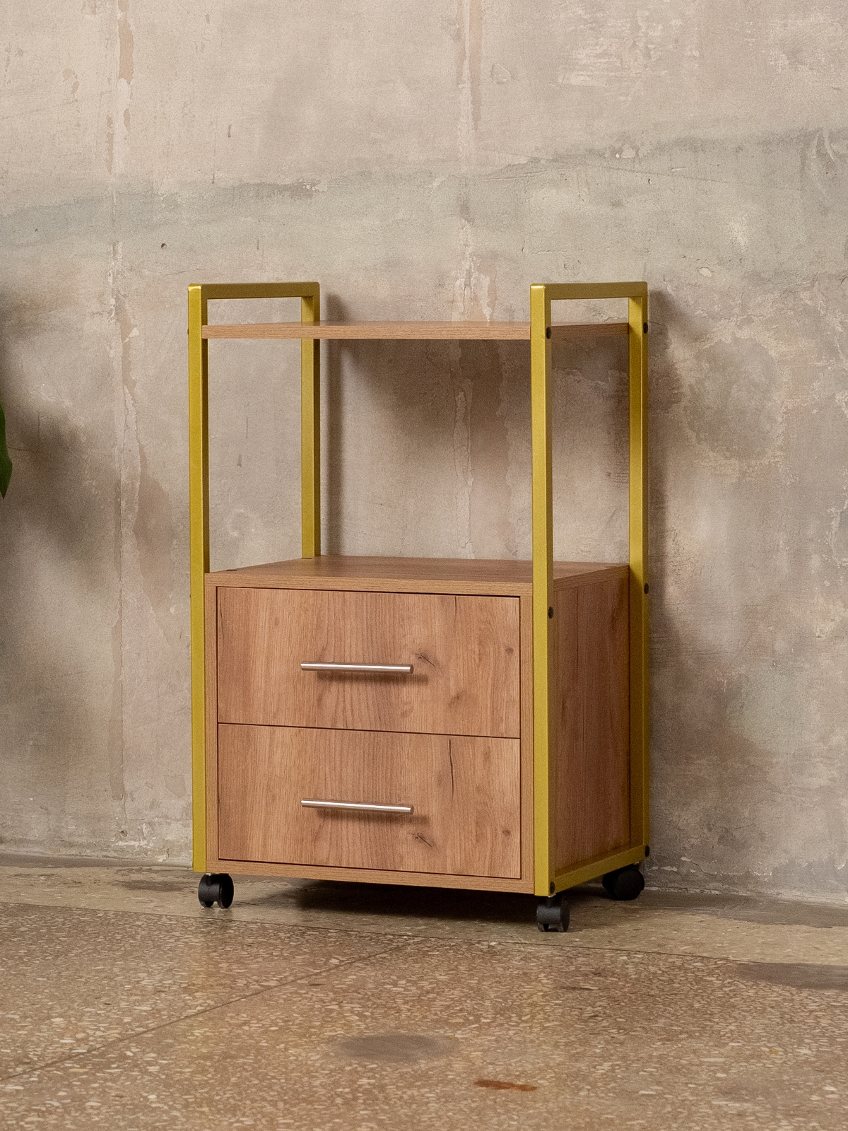 Минималистичный дизайн тумбы-этажерки «Кая» органично смотрится в разных интерьерах: от бьюти-студий, косметологических кабинетов, парикмахерских и до офисных пространств. Золотой металлический каркас подчеркивает изысканность, светлые оттенки ЛДСП визуально расширяют пространство, а темные выделят эту мебель, превратив её в гламурный акцент. Такой органайзер легко впишется в любое помещение — будь то кабинет маникюрного мастера, студия лешмейкера или спальня. Ящики с удобными ручками легко выдвигаются, предоставляя доступ к инструментам и аксессуарам. Открытые полки идеально подходят для косметических средств, полотенец, косметологического аппарата, офисных бумаг или даже посуды на кухне.