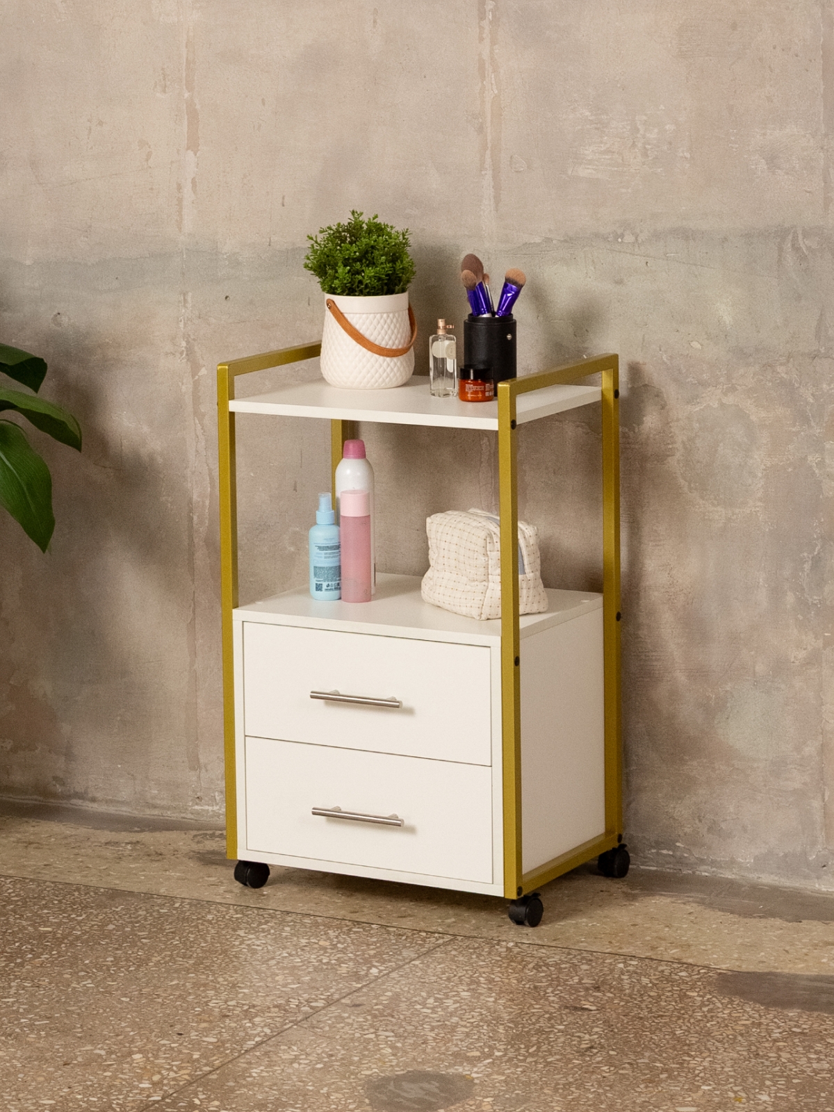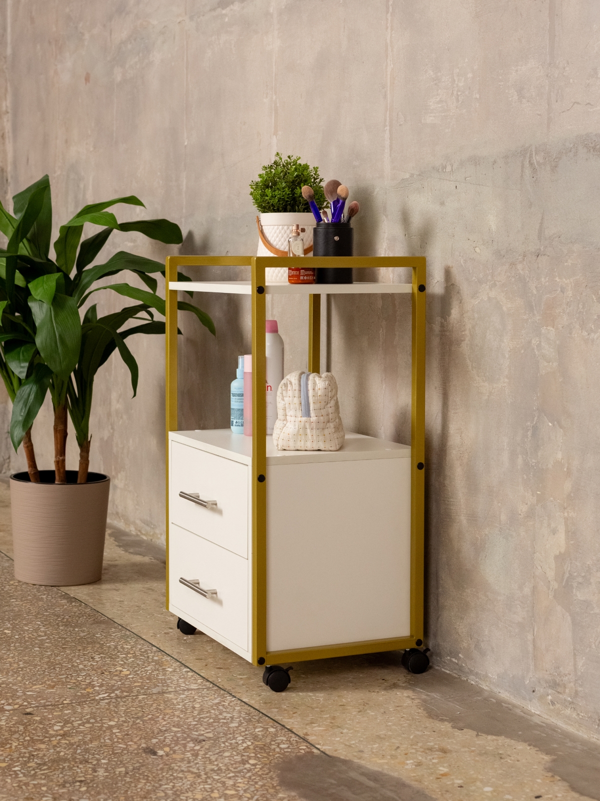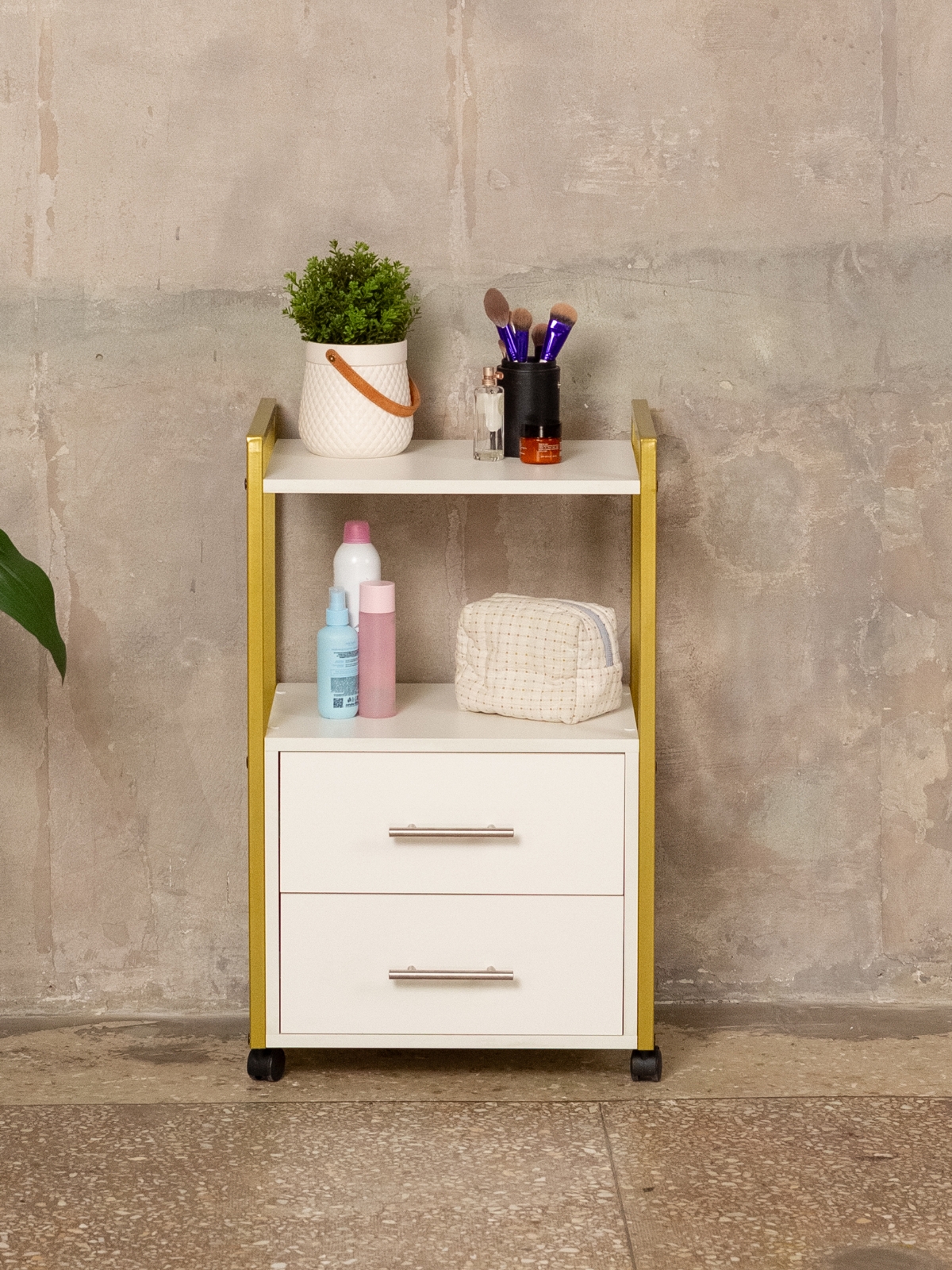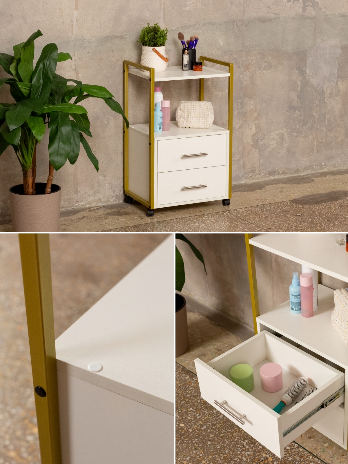 Минималистичный дизайн тумбы-этажерки «Кая» органично смотрится в разных интерьерах: от бьюти-студий, косметологических кабинетов, парикмахерских и до офисных пространств. Золотой металлический каркас подчеркивает изысканность, светлые оттенки ЛДСП визуально расширяют пространство, а темные выделят эту мебель, превратив её в гламурный акцент. Такой органайзер легко впишется в любое помещение — будь то кабинет маникюрного мастера, студия лешмейкера или спальня. Ящики с удобными ручками легко выдвигаются, предоставляя доступ к инструментам и аксессуарам. Открытые полки идеально подходят для косметических средств, полотенец, косметологического аппарата, офисных бумаг или даже посуды на кухне.