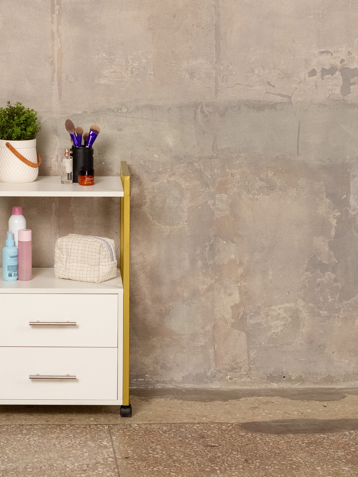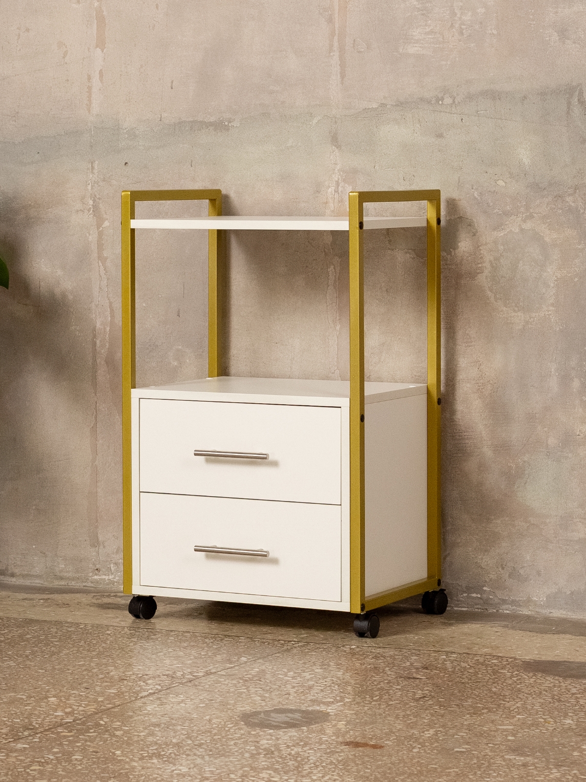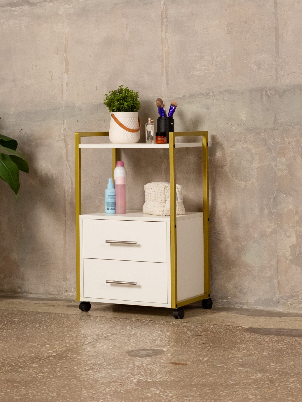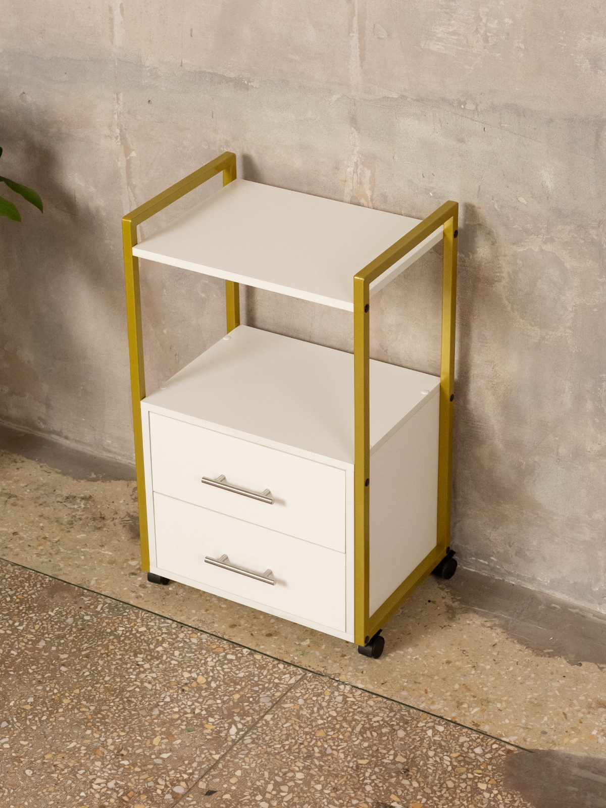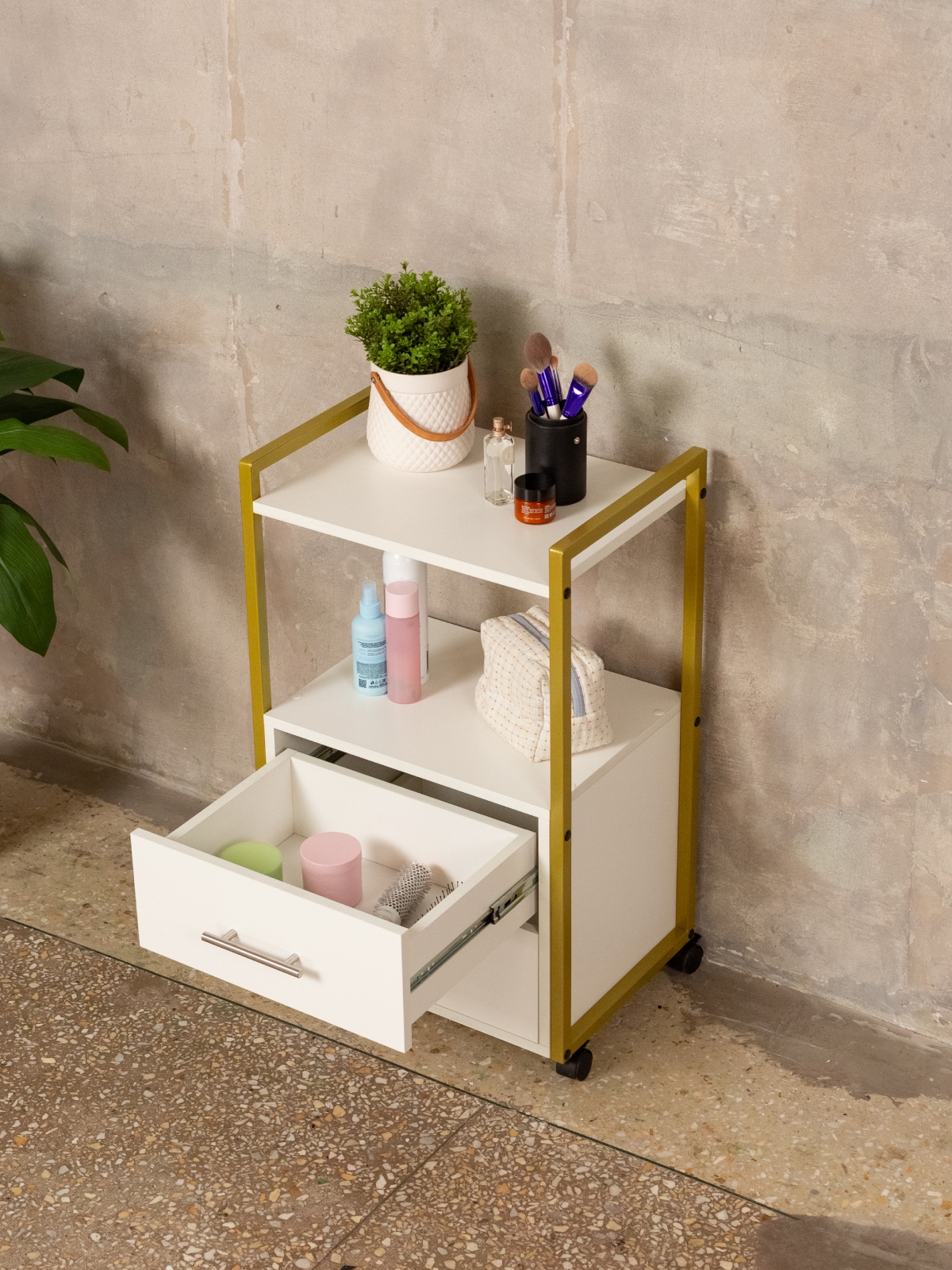 Минималистичный дизайн тумбы-этажерки «Кая» органично смотрится в разных интерьерах: от бьюти-студий, косметологических кабинетов, парикмахерских и до офисных пространств. Золотой металлический каркас подчеркивает изысканность, светлые оттенки ЛДСП визуально расширяют пространство, а темные выделят эту мебель, превратив её в гламурный акцент. Такой органайзер легко впишется в любое помещение — будь то кабинет маникюрного мастера, студия лешмейкера или спальня. Ящики с удобными ручками легко выдвигаются, предоставляя доступ к инструментам и аксессуарам. Открытые полки идеально подходят для косметических средств, полотенец, косметологического аппарата, офисных бумаг или даже посуды на кухне.