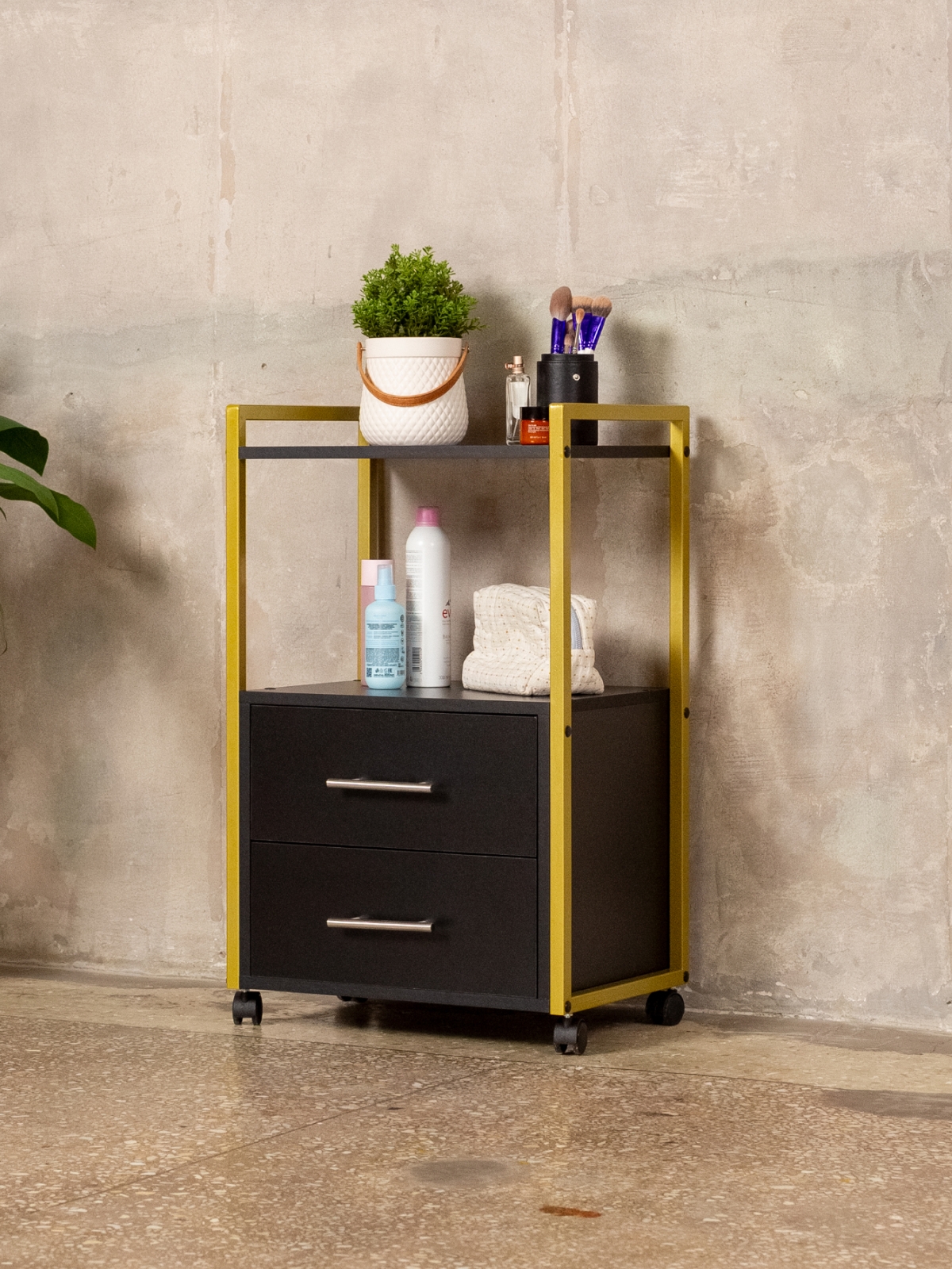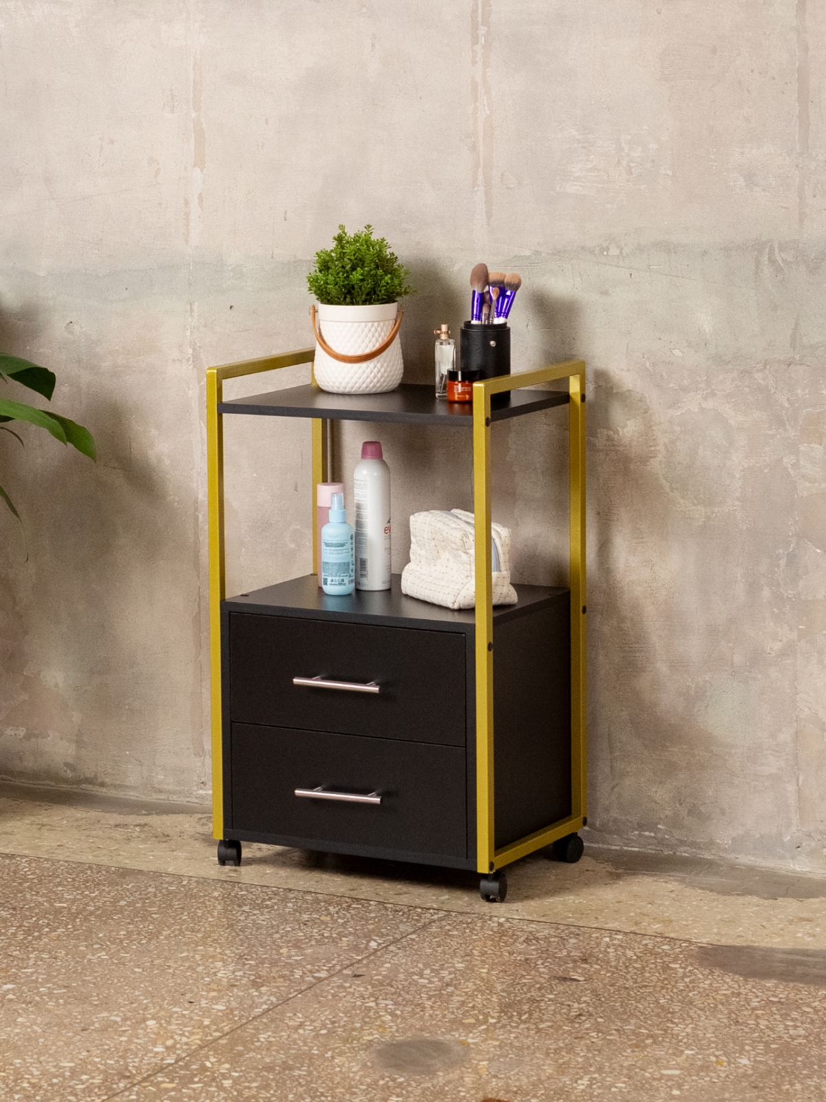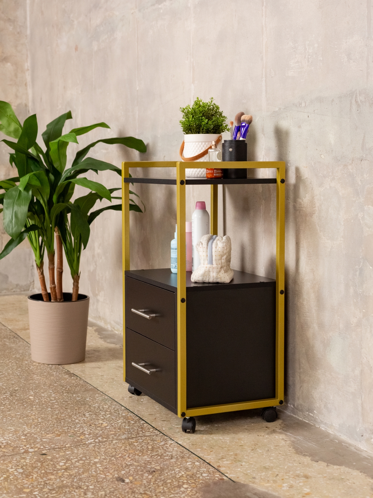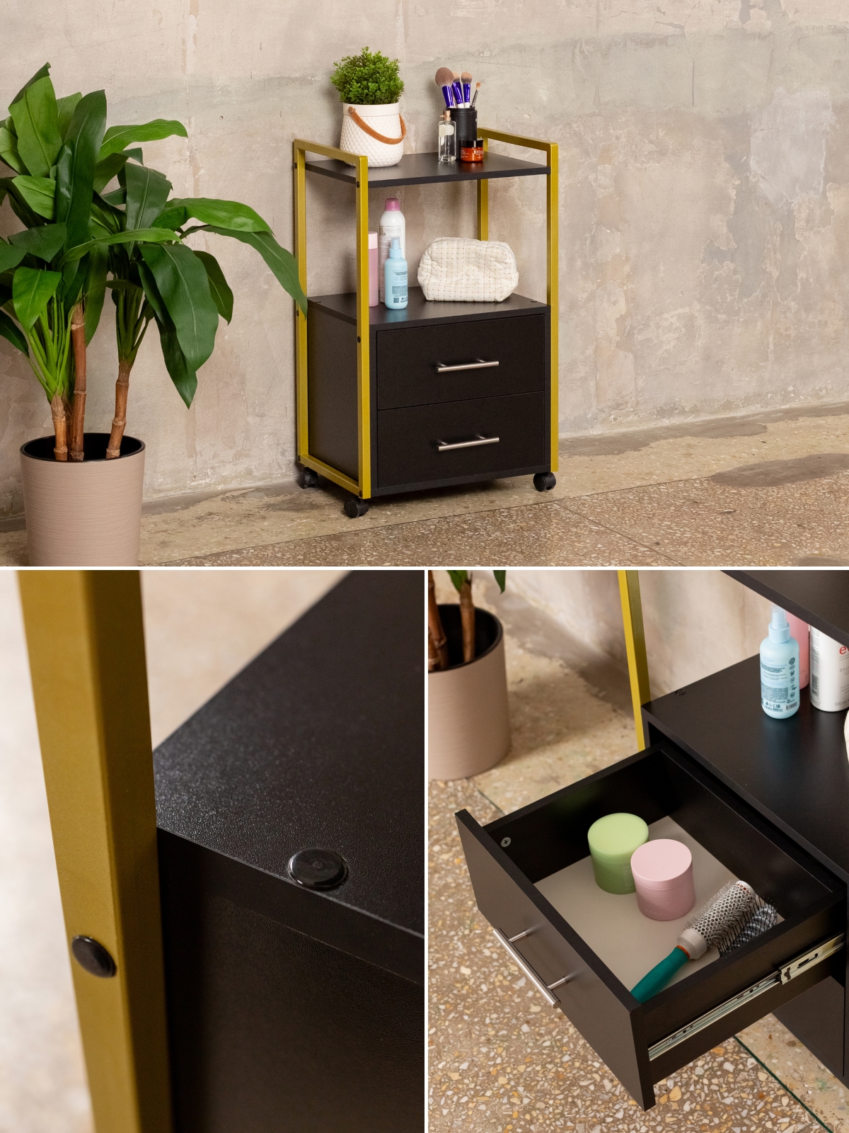 Минималистичный дизайн тумбы-этажерки «Кая» органично смотрится в разных интерьерах: от бьюти-студий, косметологических кабинетов, парикмахерских и до офисных пространств. Золотой металлический каркас подчеркивает изысканность, светлые оттенки ЛДСП визуально расширяют пространство, а темные выделят эту мебель, превратив её в гламурный акцент. Такой органайзер легко впишется в любое помещение — будь то кабинет маникюрного мастера, студия лешмейкера или спальня. Ящики с удобными ручками легко выдвигаются, предоставляя доступ к инструментам и аксессуарам. Открытые полки идеально подходят для косметических средств, полотенец, косметологического аппарата, офисных бумаг или даже посуды на кухне.