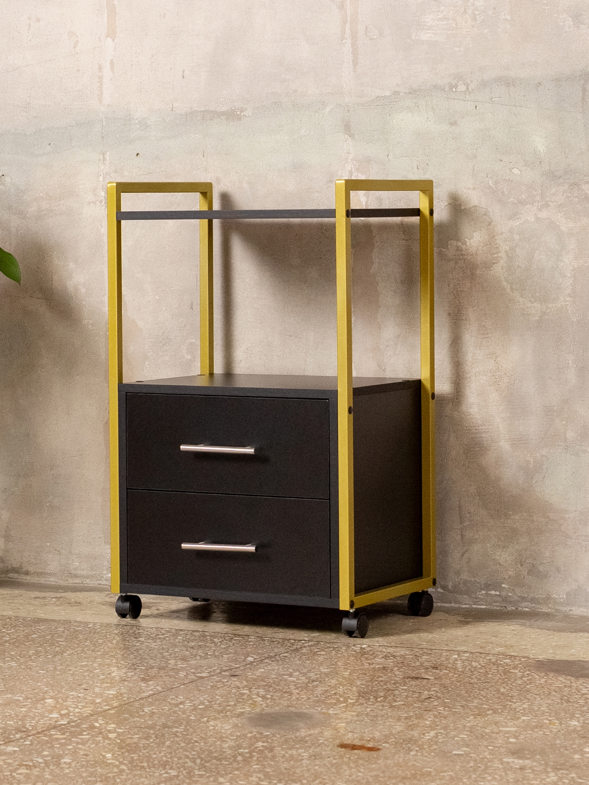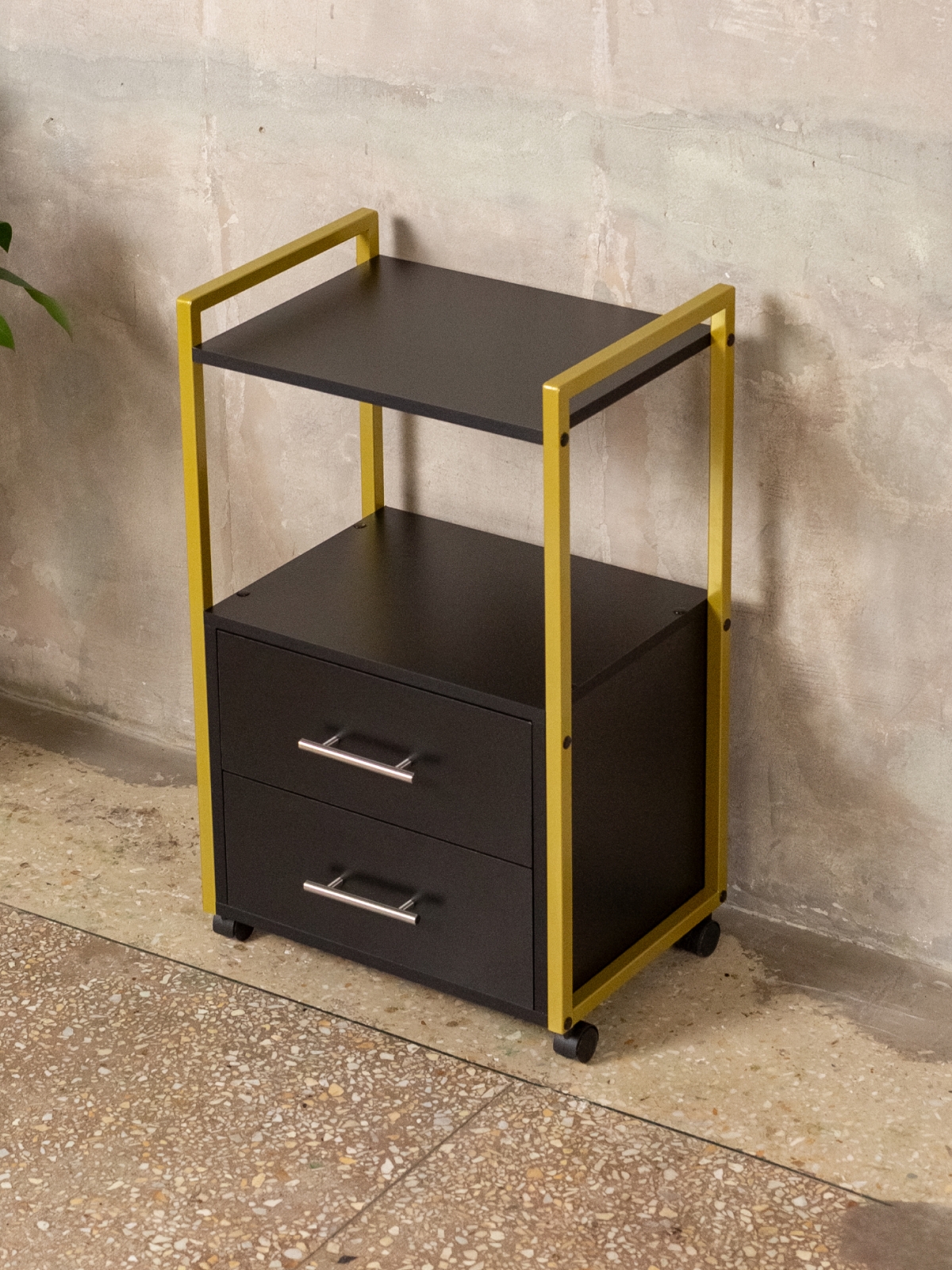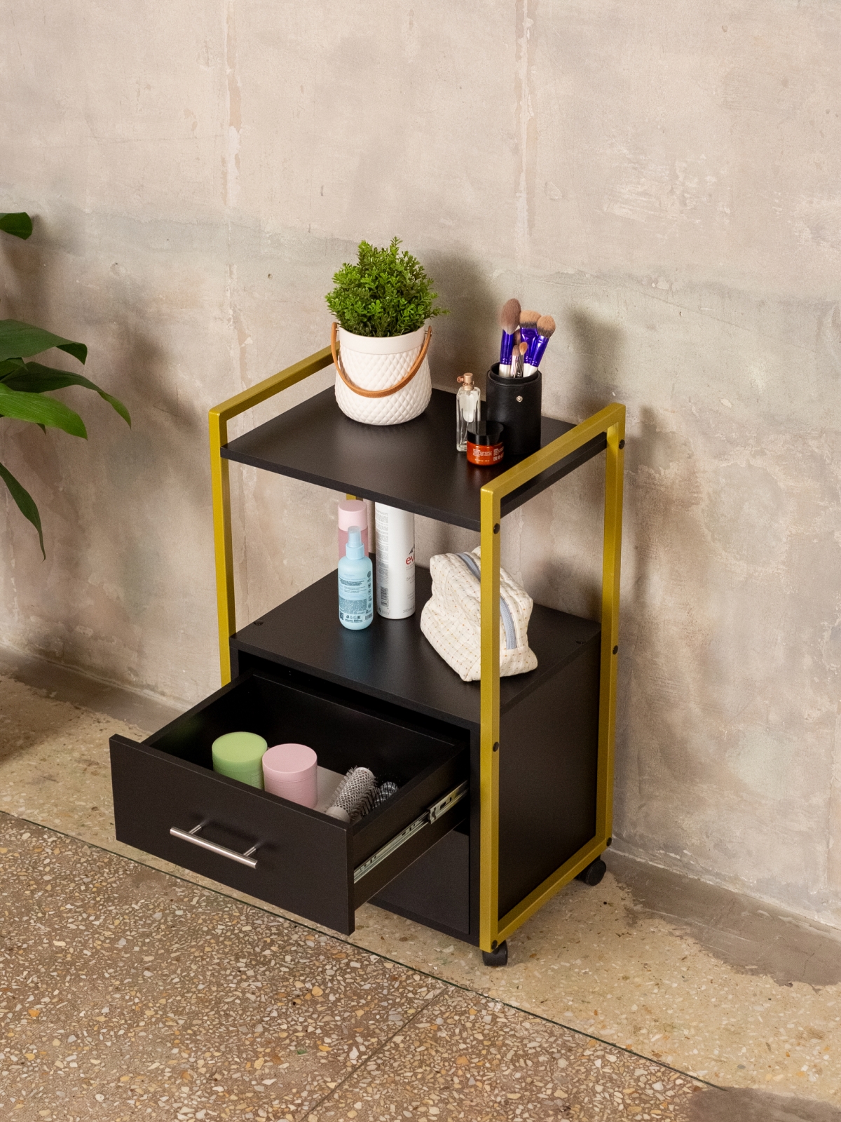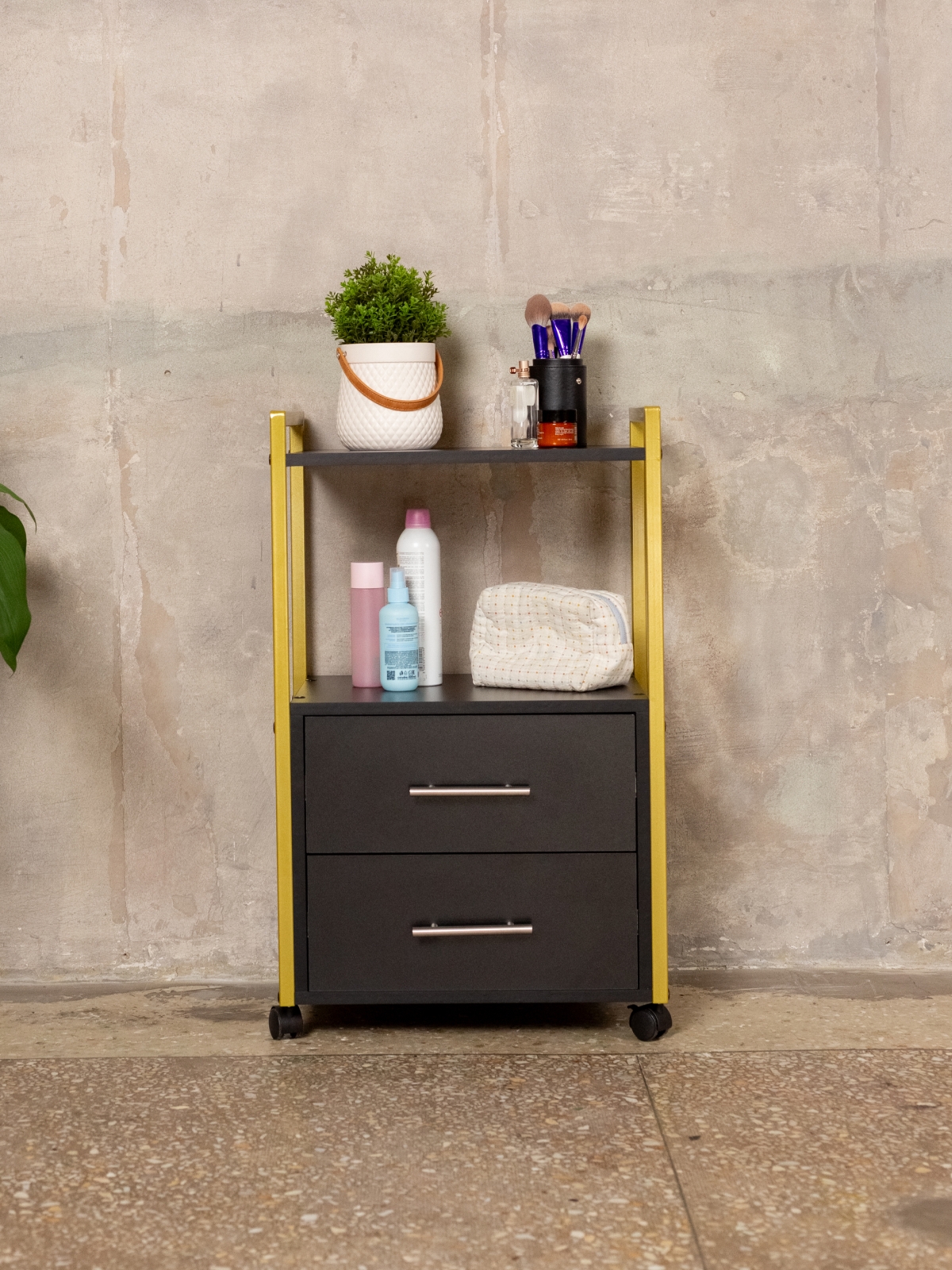 Минималистичный дизайн тумбы-этажерки «Кая» органично смотрится в разных интерьерах: от бьюти-студий, косметологических кабинетов, парикмахерских и до офисных пространств. Золотой металлический каркас подчеркивает изысканность, светлые оттенки ЛДСП визуально расширяют пространство, а темные выделят эту мебель, превратив её в гламурный акцент. Такой органайзер легко впишется в любое помещение — будь то кабинет маникюрного мастера, студия лешмейкера или спальня. Ящики с удобными ручками легко выдвигаются, предоставляя доступ к инструментам и аксессуарам. Открытые полки идеально подходят для косметических средств, полотенец, косметологического аппарата, офисных бумаг или даже посуды на кухне.