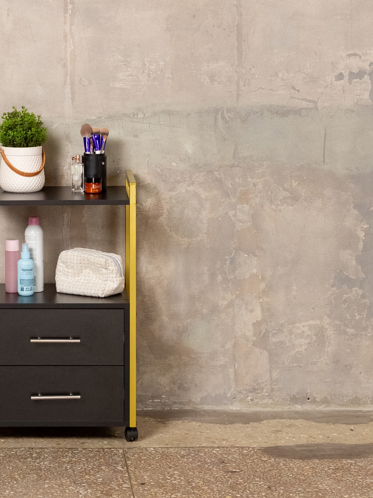 Этажерка оснащена двумя ящиками на шариковых направляющих. Это идеальное решение для хранения косметики, инструментов для педикюра, маникюра, наращивания ресниц, моделирования бровей, парикмахерских инструментов. Две открытых полки над ящиками обеспечивают быстрый доступ к самым нужным вещам — например, аппаратам для косметологических процедур, бутылочкам с дезинфицирующими средствами, органайзерам для кистей и расчесок, инструментам для маникюра и педикюра. Конструкция тумбы-тележки позволяет использовать её для обустройства кухни, домашнего кабинета и даже офиса.
