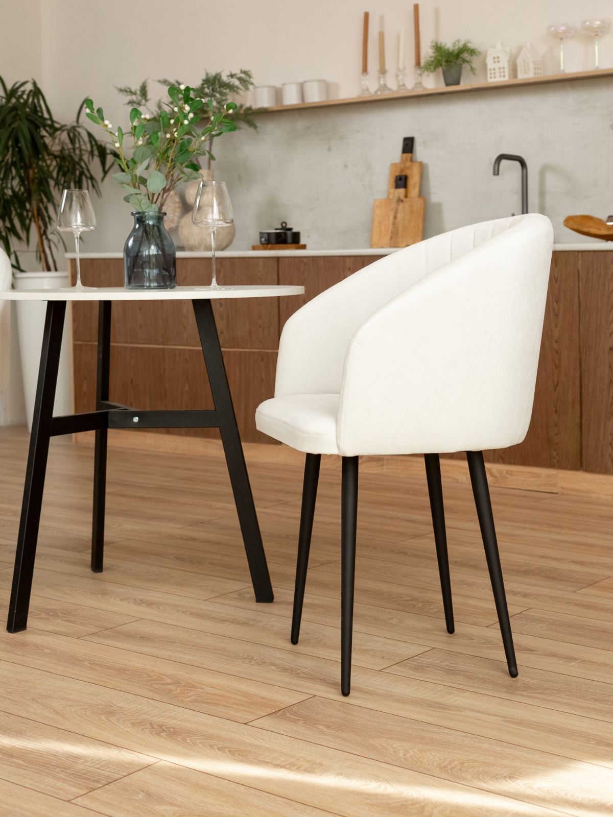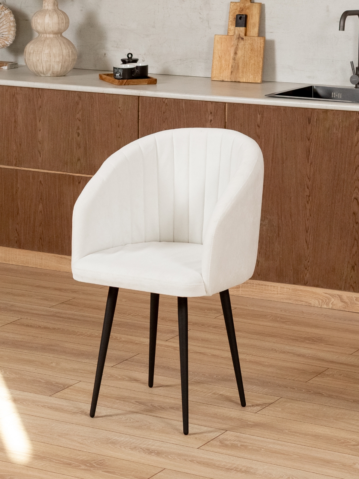 Комфортный стул с округлой спинкой и мягким сиденьем идеально подойдет для рабочего стола, клиентской зоны в офисах, а так же для уютных кафе и ресторанов . Обивка из велюра или экокожи придает изделию современный и опрятный вид, а приятная на ощупь текстура обеспечивает дополнительный комфорт. Стулья-кресла на тонких конусообразных ножках выглядят очень эффектно, гармонично вписываясь в интерьеры в стиле лофт. Стул отличается эргономичной формой, плавно изогнутой спинкой и подлокотниками, что делает его удобным для длительной работы или отдыха. Универсальный дизайн сочетается с различными вариантами мебели для офиса, а также станет отличным выбором для зоны отдыха на балконе. Мягкие материалы сиденья и спинки поддерживают спину и создают ощущение уюта. Стул без колесиков, что делает его устойчивым и безопасным для использования на любом типе напольного покрытия.